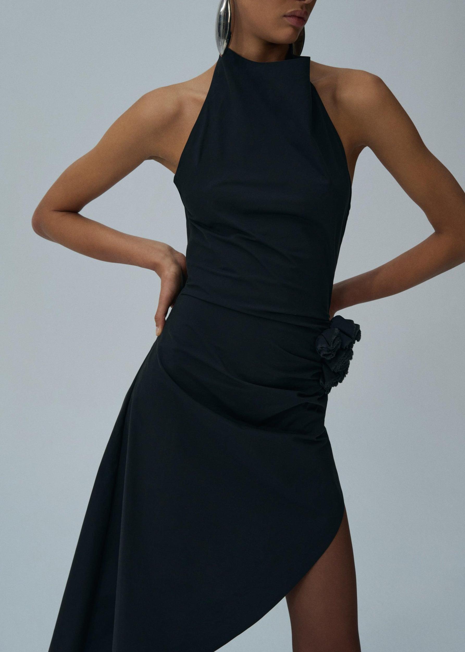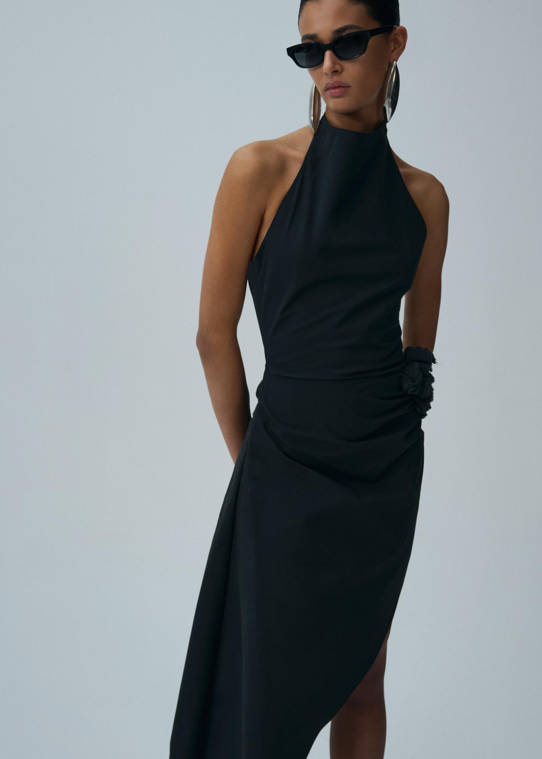 A cotton midi dress with a draped high neck and an asymmetrical hemline.