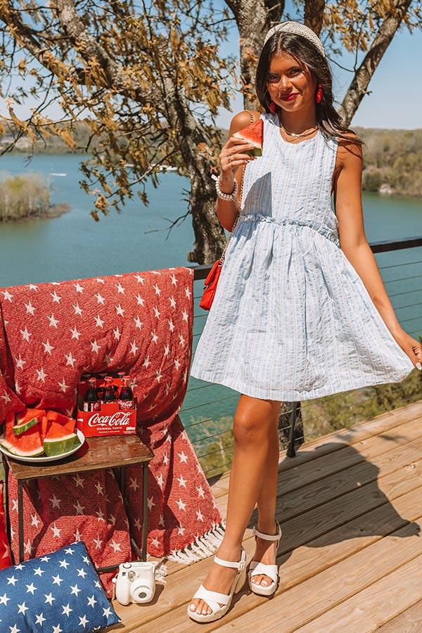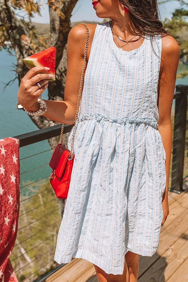 Wow the crowd in our charming airy blue hued 'High Noon' dress featuring lightweight material patterned with subtly textured vertical stripes, a rounded neckline, sleeveless shoulder straps with a racerback fit, hidden side pockets, and a relaxed silhouette that falls into a straight mid-thigh length hemline! on products Measurements S : Bust 26", Hip 46", Length 32.5", Waist 36". M : Bust 28", Hip 48", Length 33", Waist 38". L : Bust 30", Hip 50", Length 33.5", Waist 40".