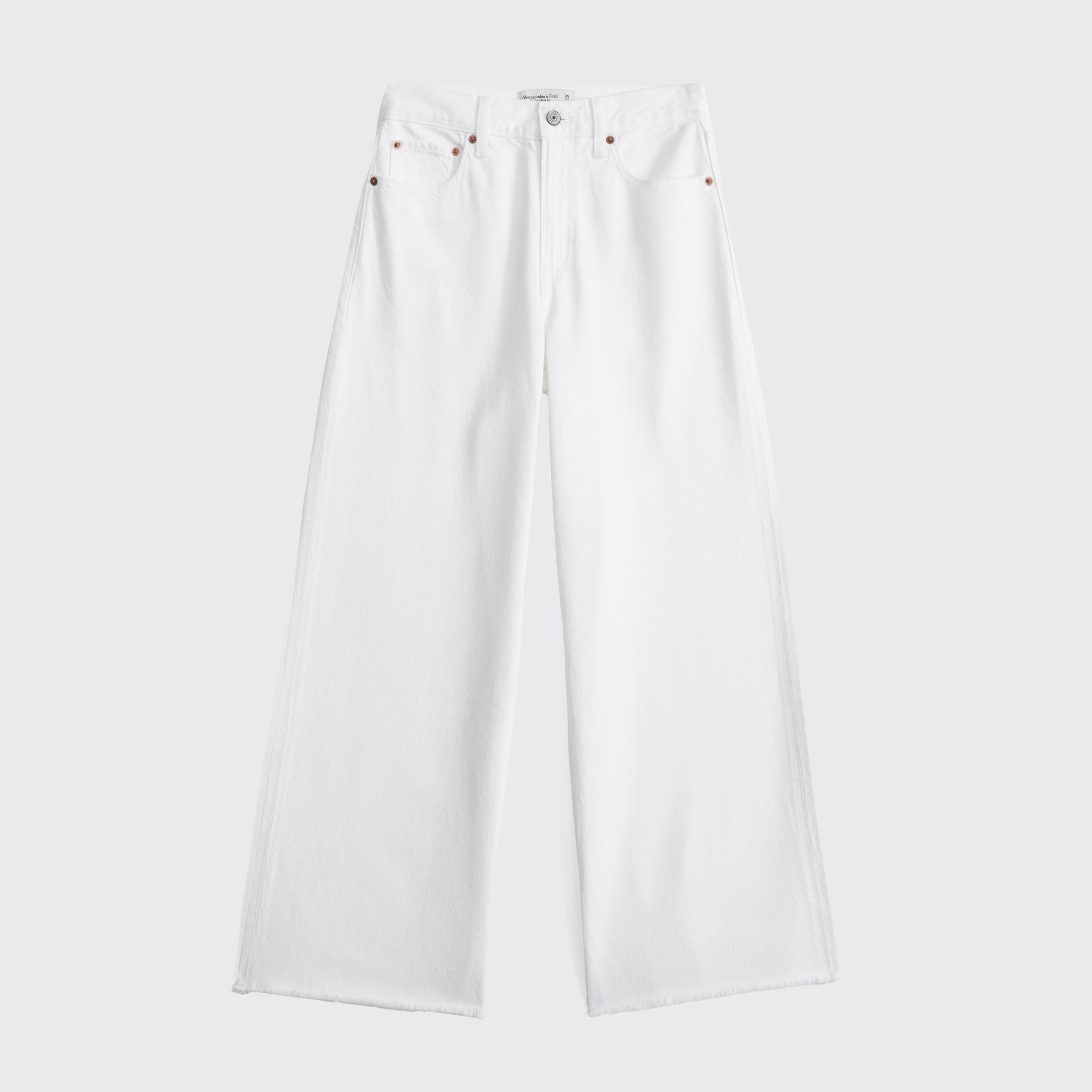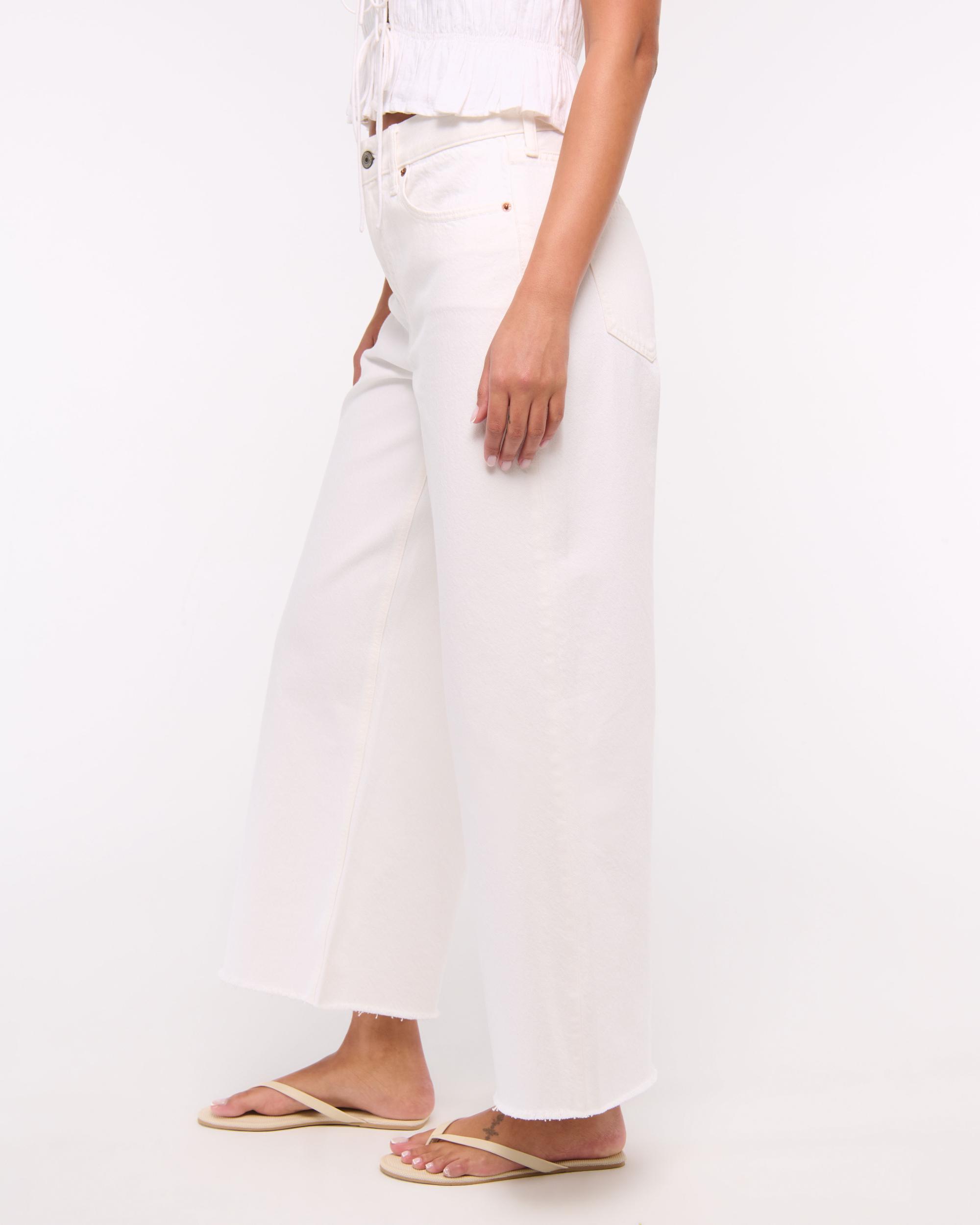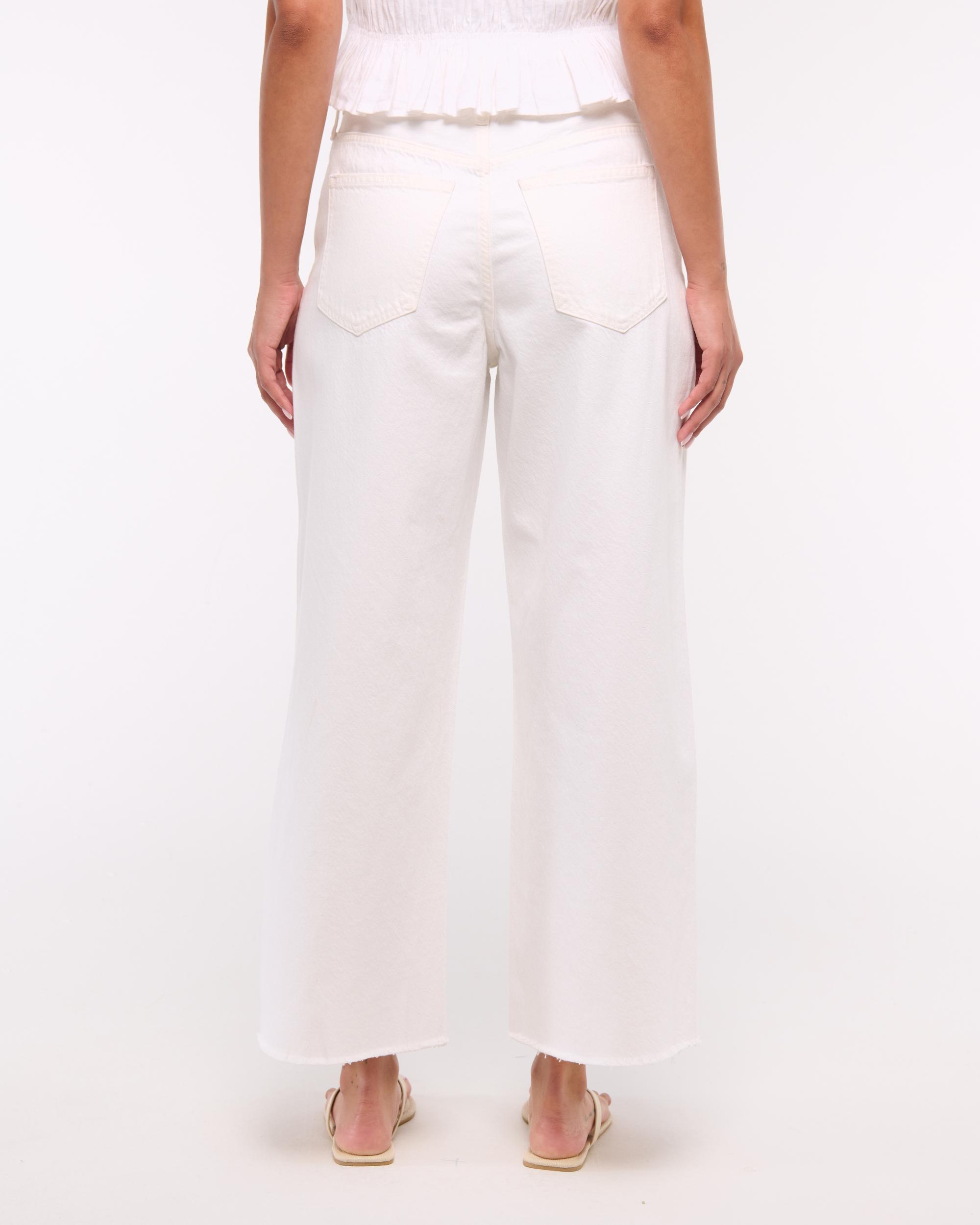 Our classic high rise cropped wide leg jeans in a white wash with a frayed hem. This fit features a 10.5” high rise, is relaxed at the waist and hips, and eases into a wide, full-length leg shape with a cropped length. This jean is made from our drapey rigid denim fabric, a super soft authentic cotton fabric with no stretch.
