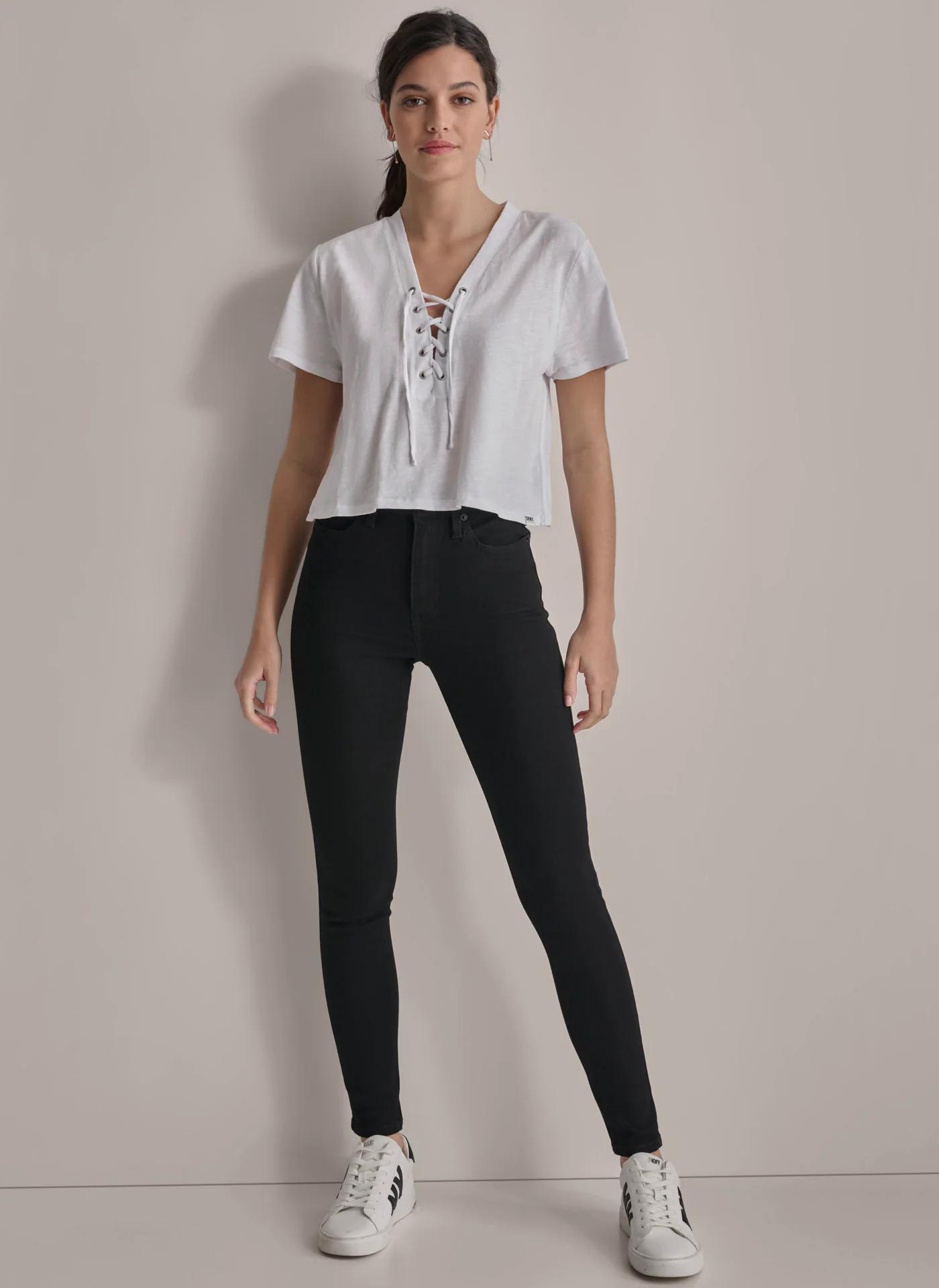 High-rise Five-pocket styling Hem hits above ankle Machine wash cold, gentle cycle with like colors. Only non-chlorine bleach when needed. Tumble dry low. Cool iron if needed. Cotton, polyester, rayon, spandex Machine Wash Origin: Imported Style: DJ4B4002
