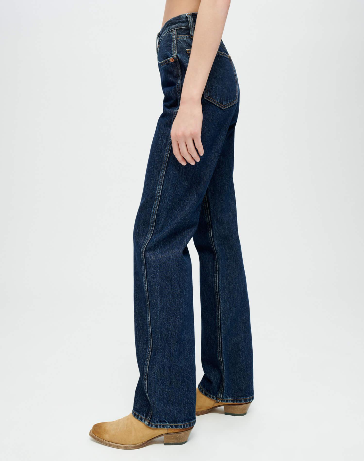 The High Rise Loose in Heritage Rinse is our take on the classic straight leg. Features a high rise with button fly, slim fit top block, and relaxed straight leg with 32” inseam.