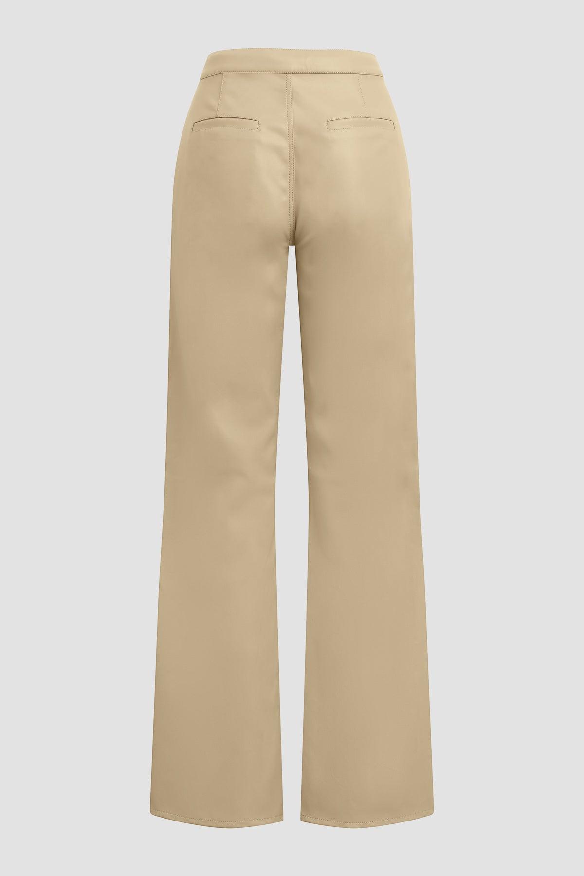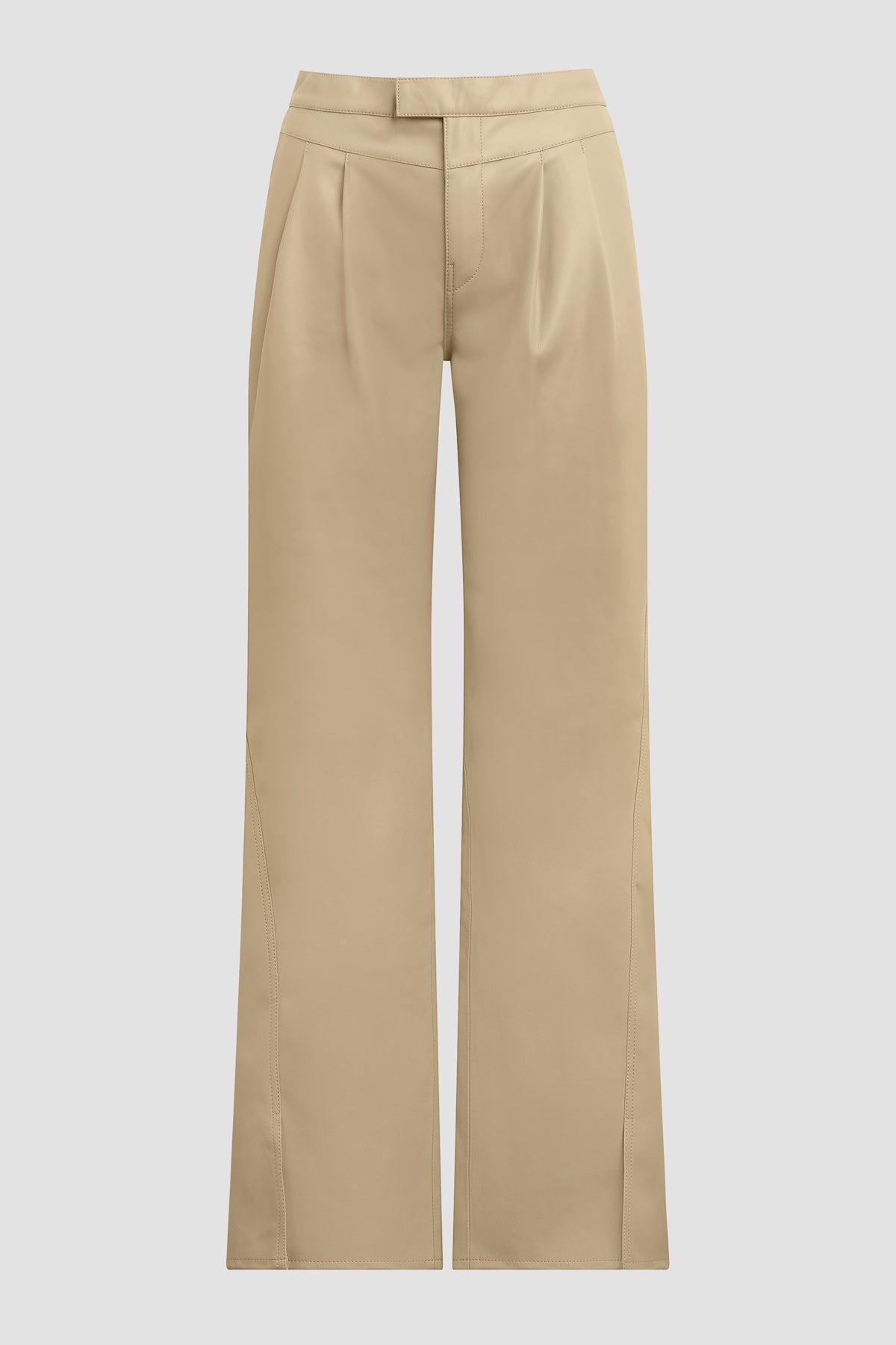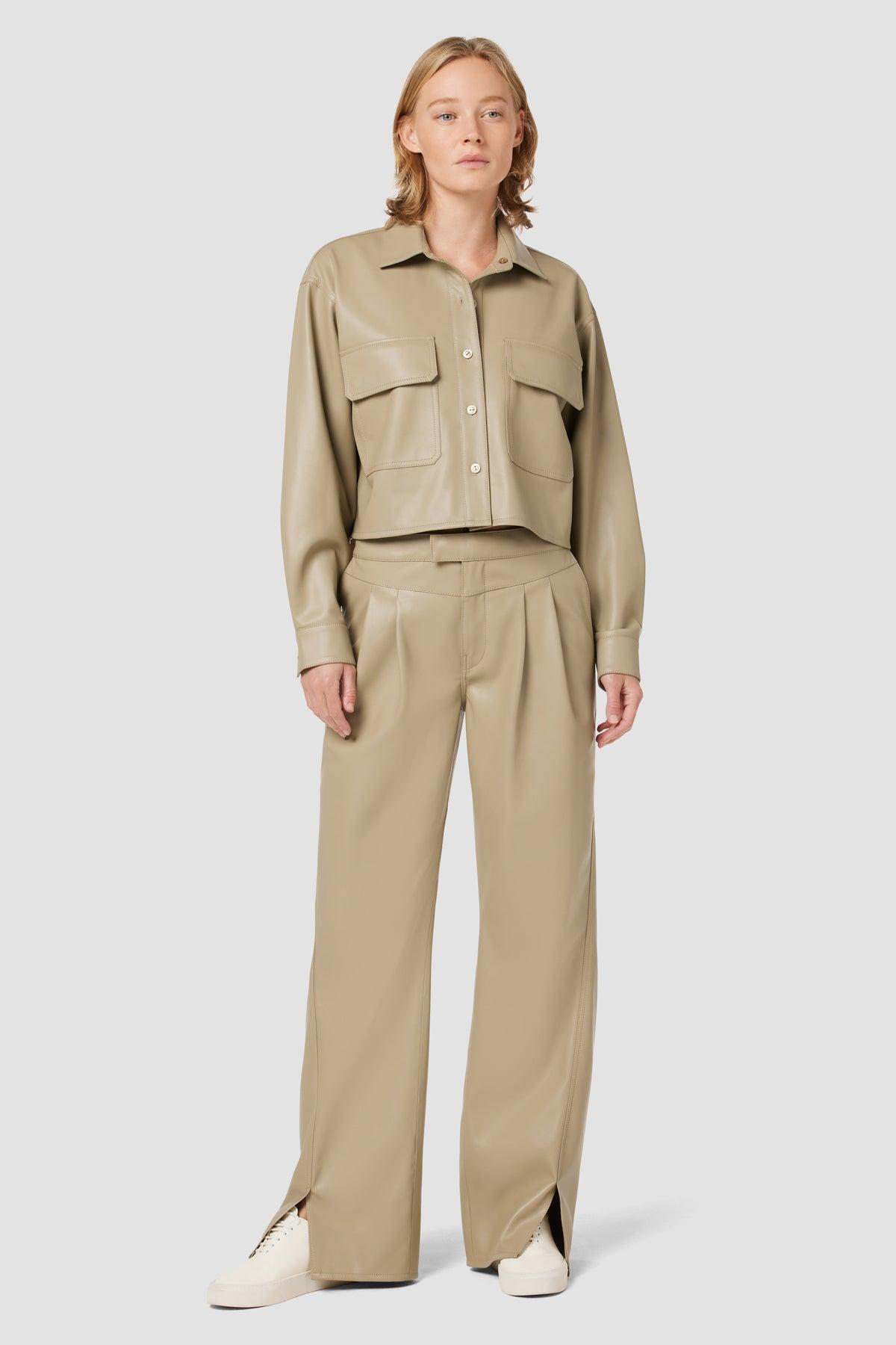 Description Re-up with our High-Rise Rosie Trouser, cut with an elevated waistline, front pleats, center seam and hem slits. The wide leg pant has a ’70s-feel, roomy leg crafted from luxe Illusion vegan leather in Chinchilla. Product Details Front Rise: 11.75", Leg Opening: 20, Inseam: 31"Model Height 5'9"Model wearing size 25Measurements based on size 27 Fit & Care Content: 100% PU Face, 100% Polyester BackMachine wash cold with like colorsDo not bleachTumble dry low or hang to dry