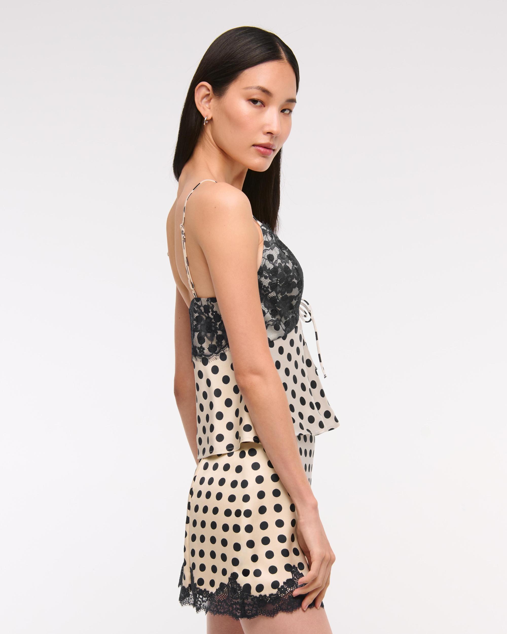 Our new high rise mini skirt in our textured satin fabric, featuring on-trend lace-hem detail and functional side zipper for a secure fit.