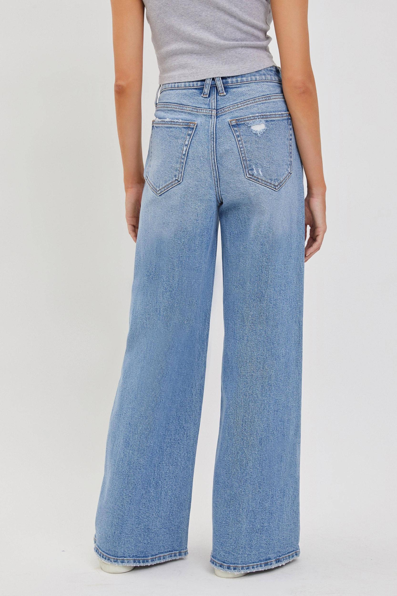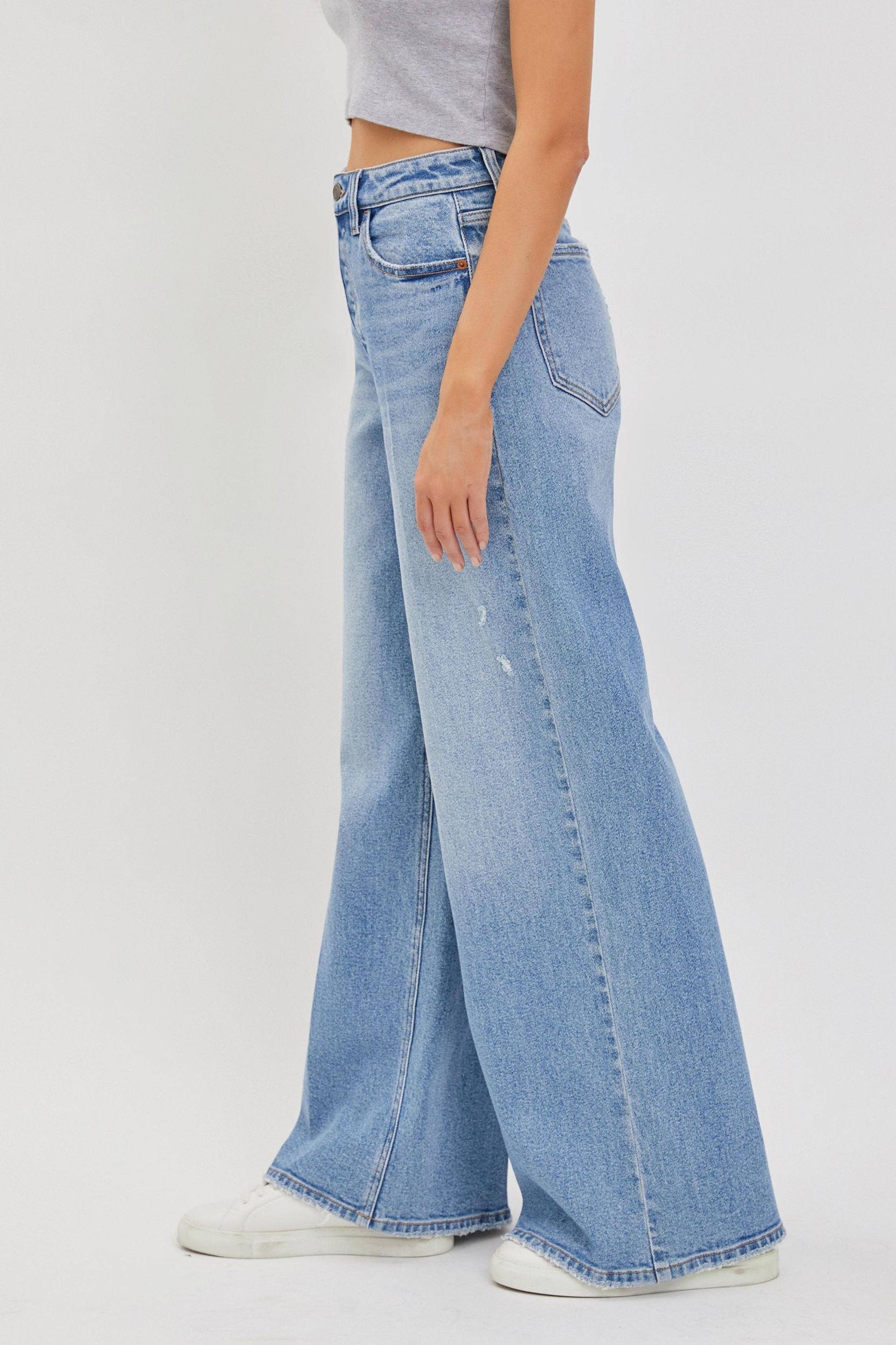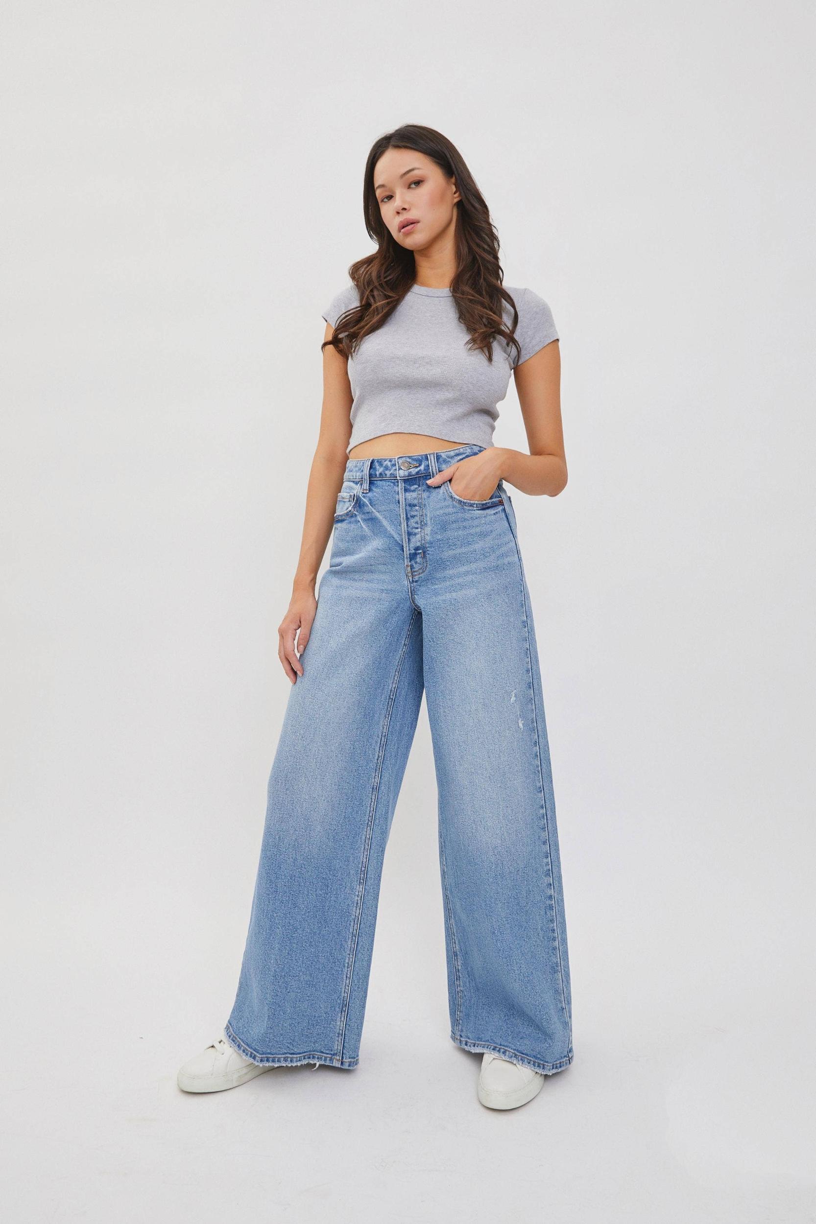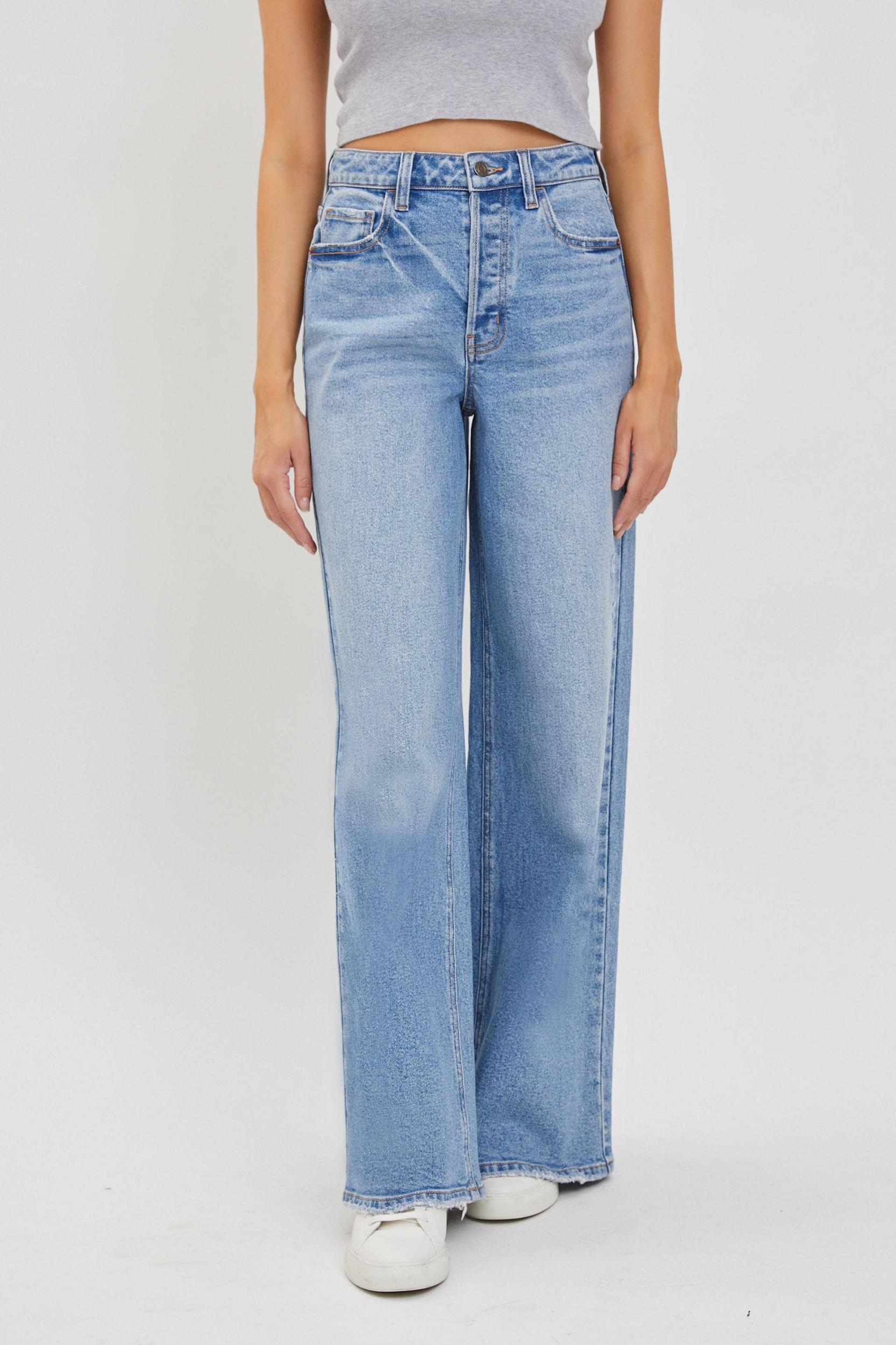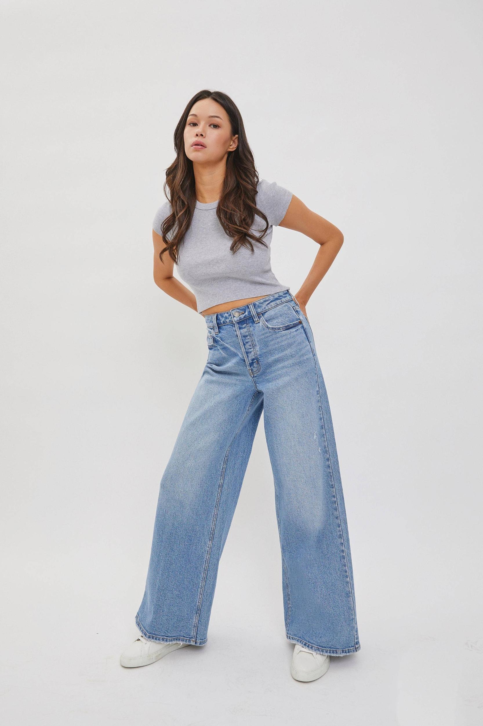 These high-rise wide-leg jeans have a 32" inseam and are the perfect light wash making them versatile enough to complement any outfit, whether dressing up or keeping it casual. Details: High-rise, wide leg, Light Denim, 5 pockets. Import. Inseam: 32" Rise: 11 1/2" Fabric Content: 99% Cotton, 1% Spandex. WV98376LT. Ships in 1-3 business days