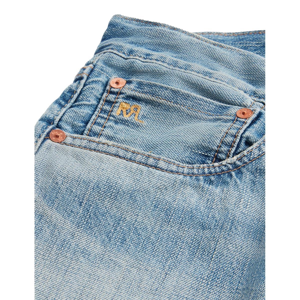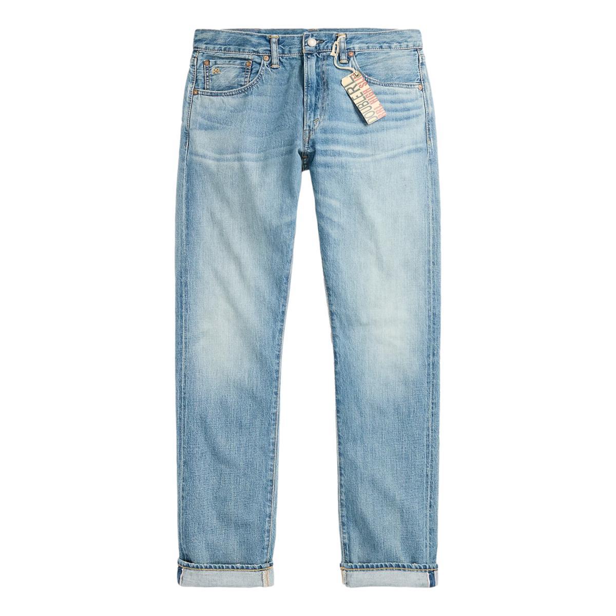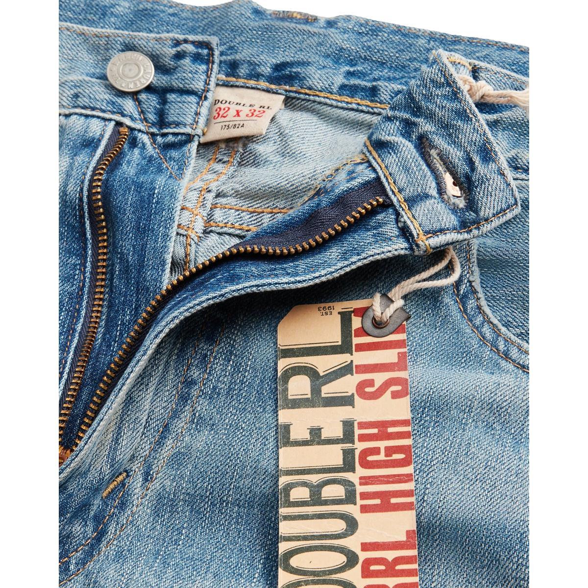 Slim-fitting jeans made in America with Double RL’s most lightweight twill that offers a substantial look. Exclusive 11.3 oz. selvedge denim with a red-blue cast woven in Japan. Zip-fly construction. Hand-finished in a process that involves up to 50 individual steps using specialized tools and techniques. Sanforized® to minimize shrinkage. High Slim Fit: a medium rise and a slim thigh and leg. Size 32W has a 9.5" rise and a 14.5" leg opening. Hand-set chain-stitched waistband with inserted belt loops for added durability. Zip fly with our signature buttoned closure. American-made buttons, rivets, and washer burrs. Five-pocket styling. “RRL” embroidery at the coin pocket. Natural twill pocket lining. Leather “RRL”-debossed logo label at the back right waist. 100% cotton. Machine washable. For best results, wear 90 days without washing. Made in USA. Japanese denim.. Dyed with indigo, which may rub off onto fabrics, leather, and upholstery. Style Number: 659156
