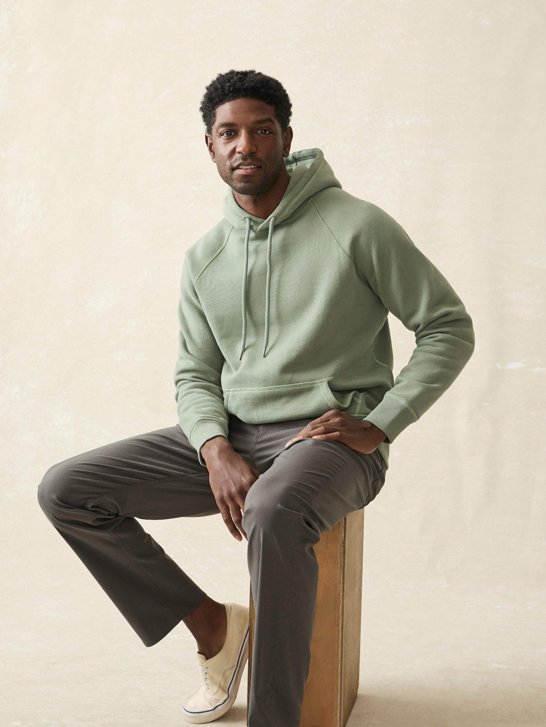 We set out to perfect the hoodie - super soft, just the right weight, and inspired by classic vintage athletic wear. Made from a blend of Pima organic cotton and organic cotton, this hoodie is all about comfort and durability. Perfect for lounging at home, weekend adventures, or layering up on cooler days, this hoodie combines timeless style with laid-back comfort. Detail: Popover hoodie. Double layer hood with drawcord. Raglan sleeves. Kangaraoo patch pocket with hidden zipper pocket. Knit rib at cuffs and hem. Sun & Waves embroidery at wearer's left cuff. Overlap seams inspired by vintage athletic wear. Woven signature "High Standard Fleece" main label. Material: 56% Organic Pima Cotton, 44% Organic Cotton; Ribbing at Sleeve Cuffs and Bottom Hem; Cotton Melange Round Drawcord at Hood with Metal Drawcord Tips; Hidden Pocket Zipper with Rubber Tipped Zipper Pull Model: Jamal is 6'2 wearing size Care: Close all zippers before wash. Turn inside out. Machine wash cold with like colors. Delicate cycle. Do not bleach. Tumble dry low. Remove promptly. Warm iron when needed. MQF2413-SPU
