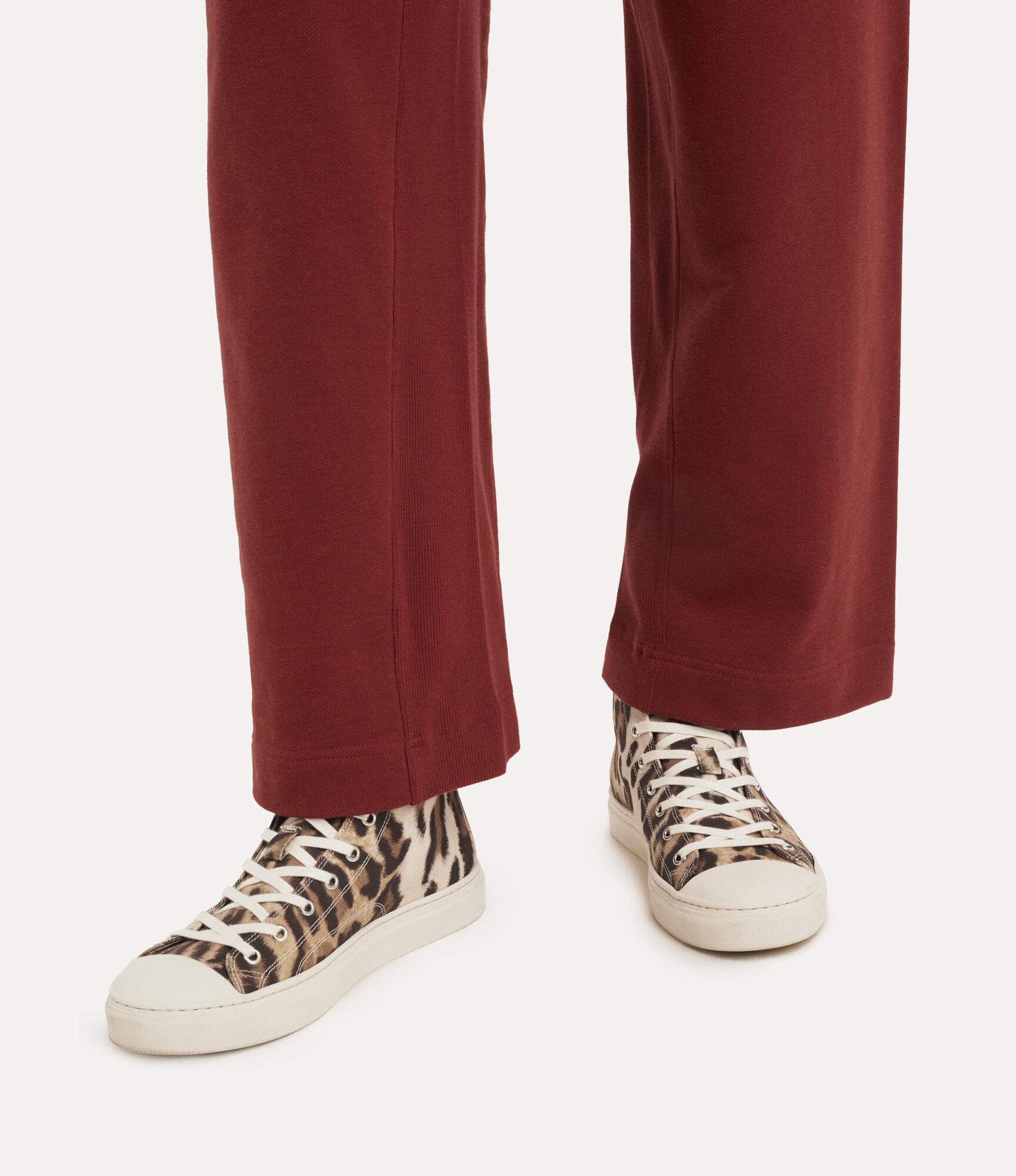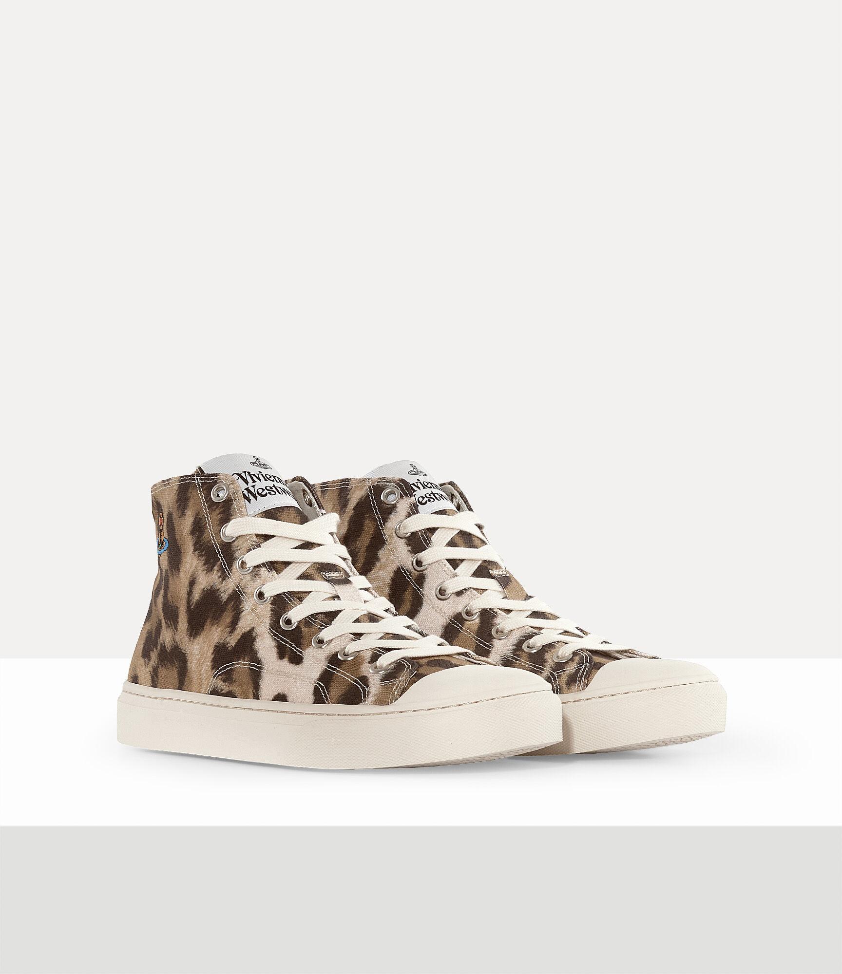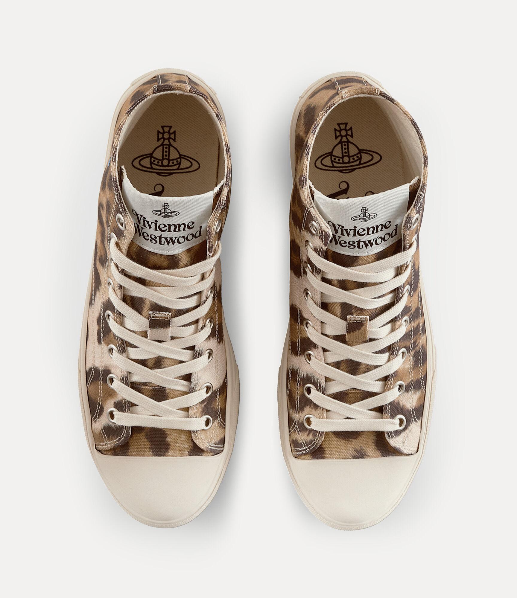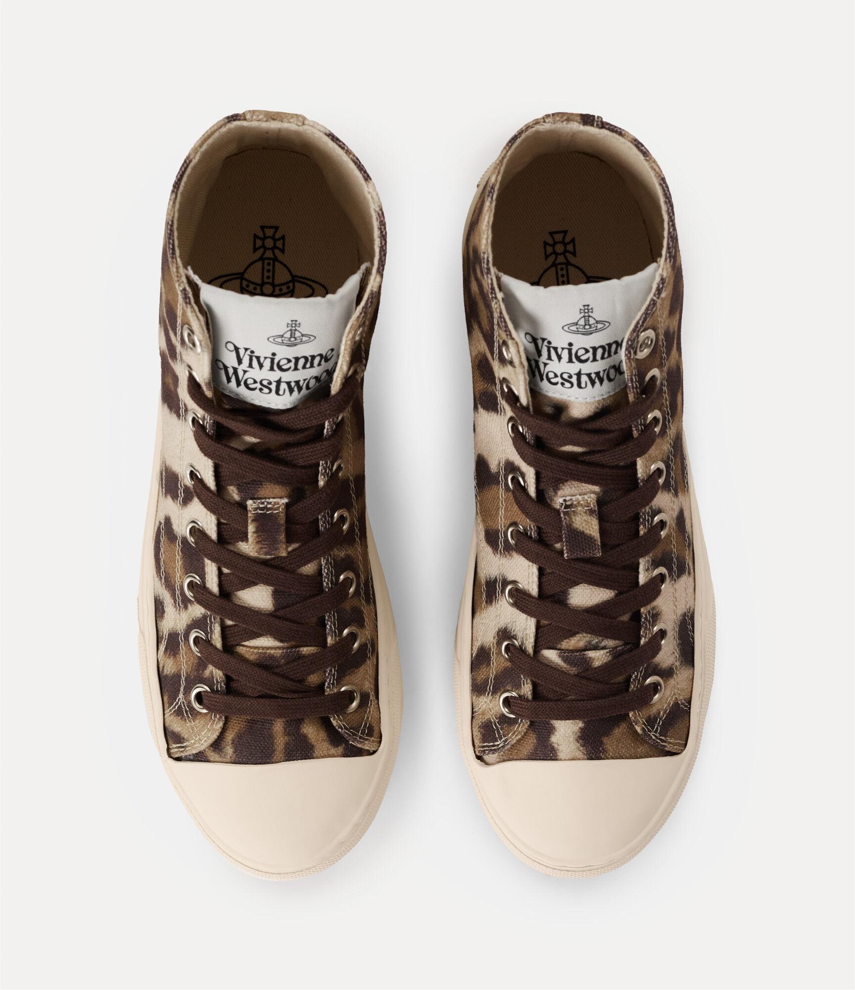 Our archival High-top plimsoll is reimagined in an all-over leopard print finish, echoing Vivienne's Autumn-Winter 2001 collection, 'Wild Beauty'. Featuring our embroidered orb at the ankle - symbolising the ethos of propelling the past into the future - the design offers a classic canvas silhouette.