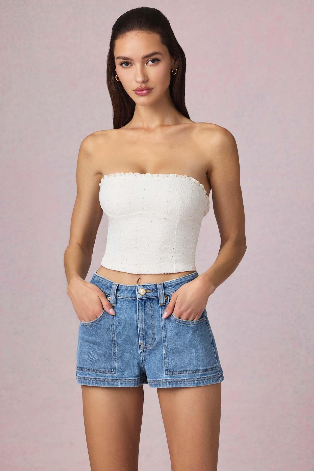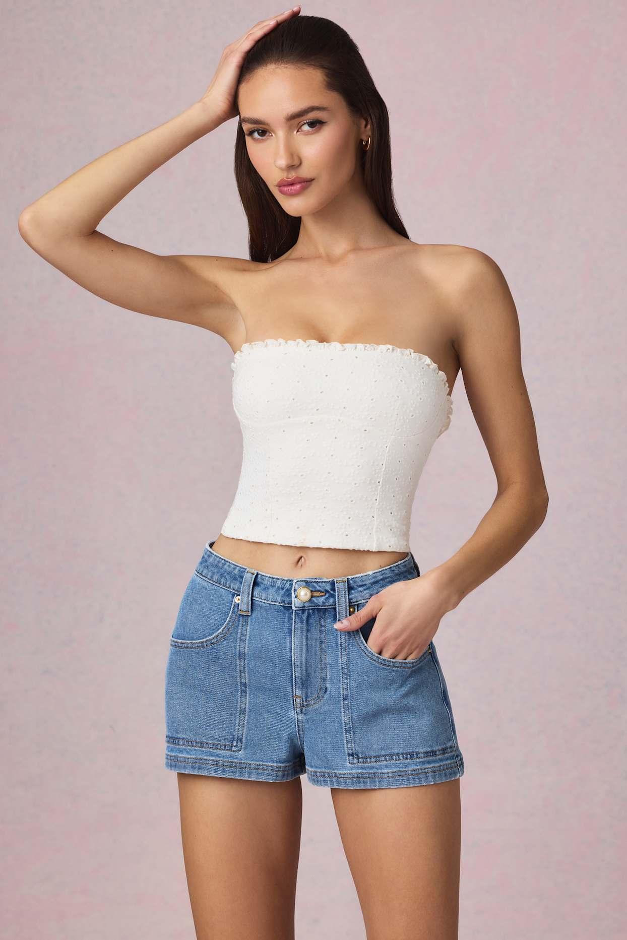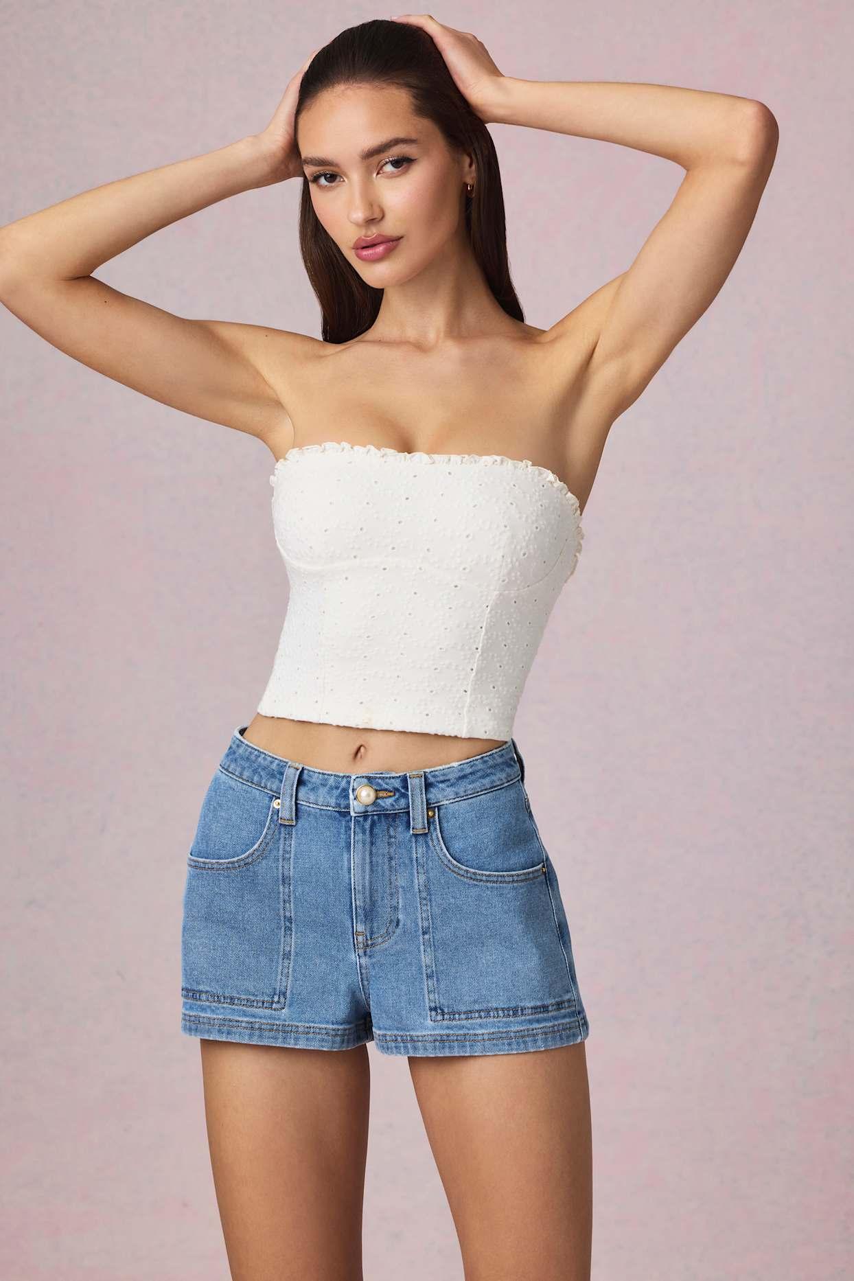 A pair you’ll reach for all season. A fresh take on a timeless silhouette, the Beata shorts are crafted from cotton denim with a touch of stretch and cut to a flattering A-line silhouette. Designed to sit high on the waist, they’re brought to life with a faux-pearl button at the front and subtle branded embroidery at the back. High-rise waistbandSeam detailing Four-pocket detailingFaux-pearl embellishmentLogo embroidery at backConcealed zip and button fastening at frontA-line silhouetteShort length, inseam approx. 4cm based on a UK size 8Product code: 13824C