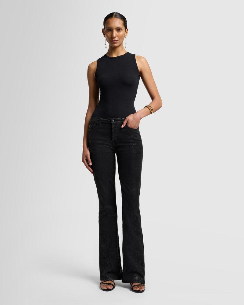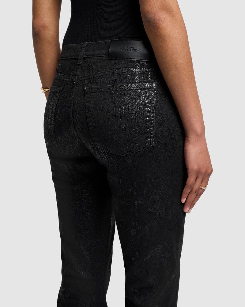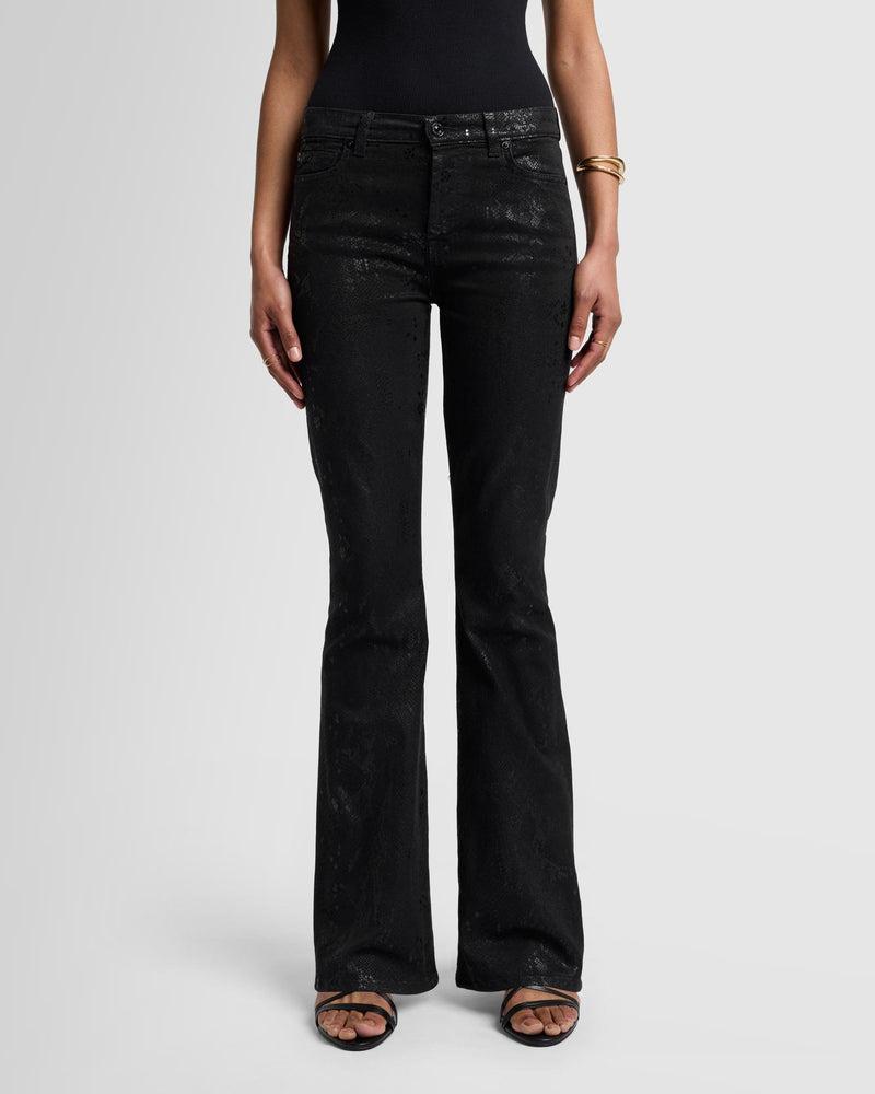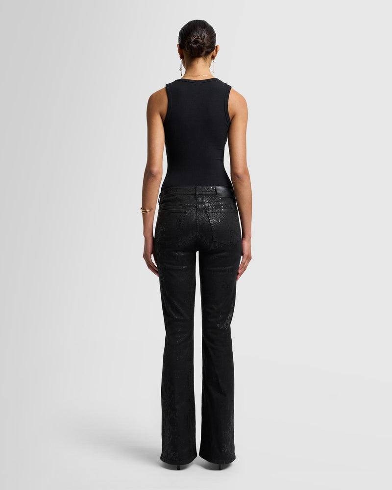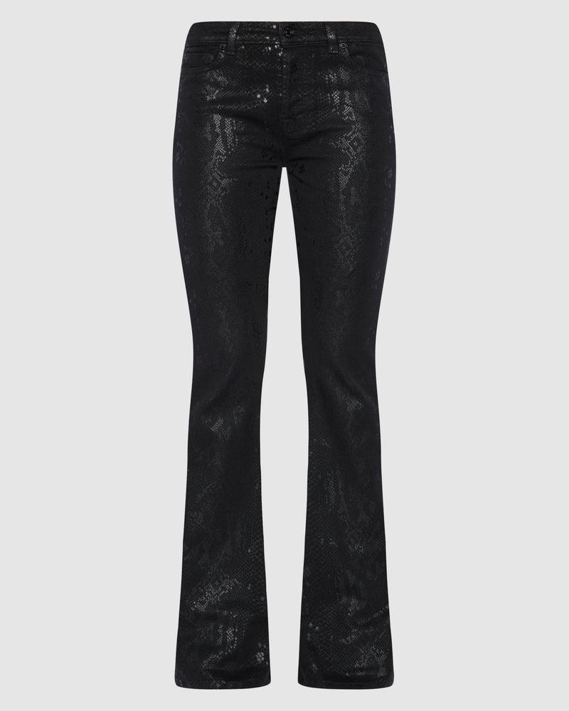 Fits like: Featuring a high rise, this denim hugs you through the hips and thighs before flaring out from the knee. Feels like: Our signature denim with a classic and authentic structured feel. The Details: Black snake-skin print with coated details Coated denim offers the look of leather with the comfort of 7 denim