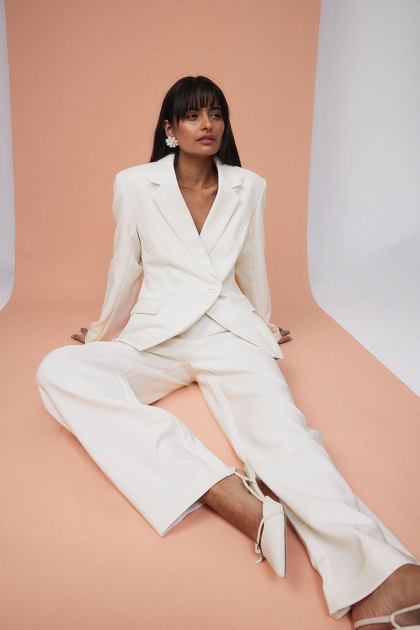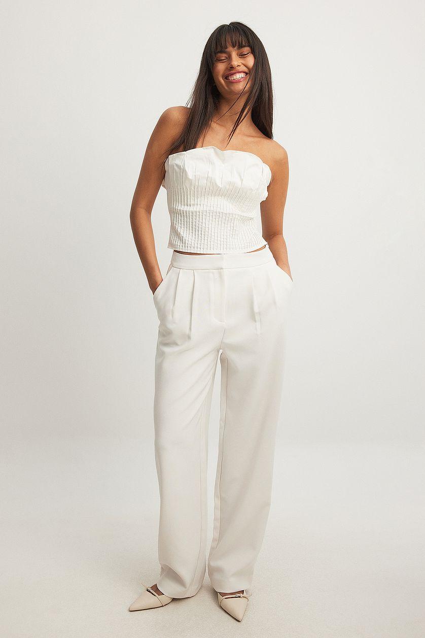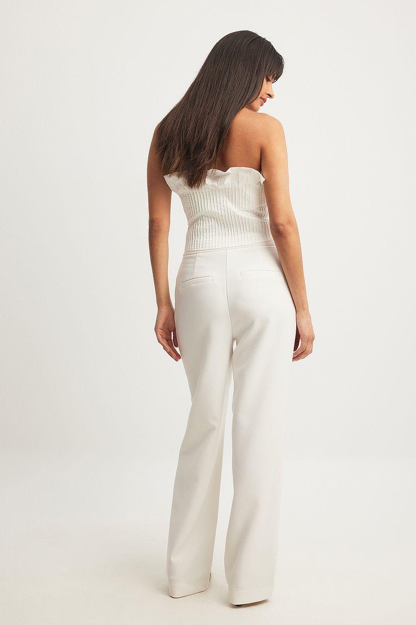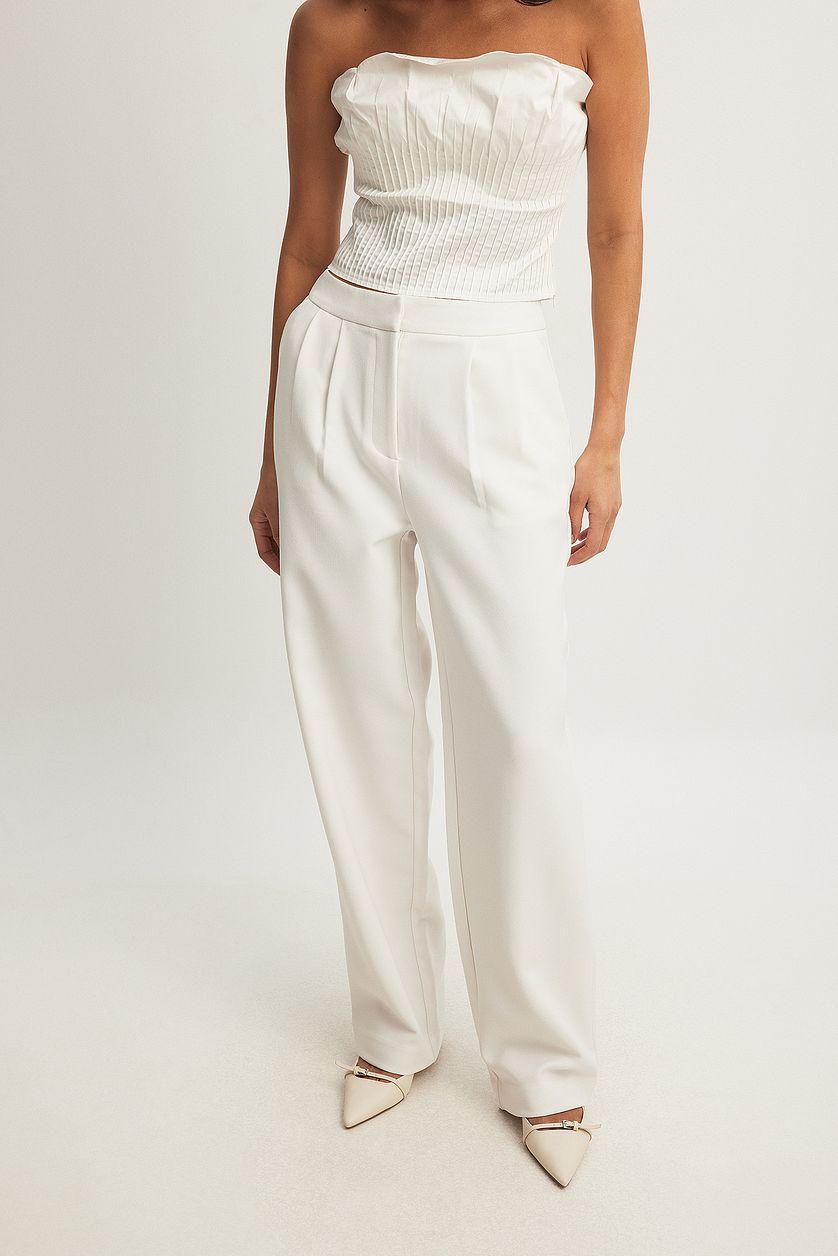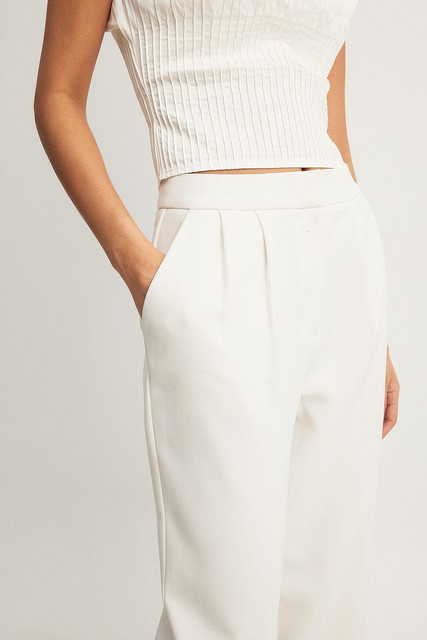 These suit pants feature a high waist. They have a zipper, hook and button closure and pleats at the waist. The suit pants have side slanting pockets, back mock pockets and wide legs with a crease detail.