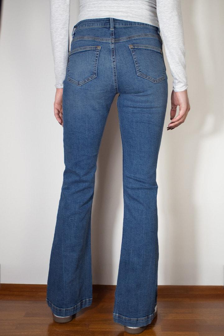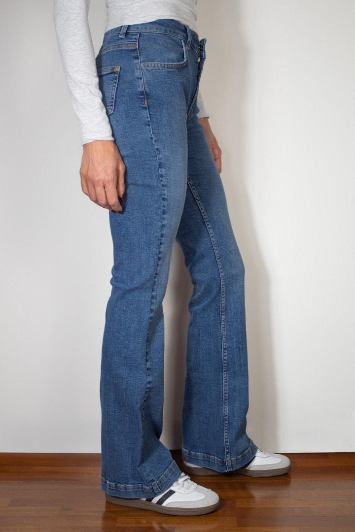 High waist jeans, belt loops, flared, with pockets, button up and zip fastening, regular length, slim fit.