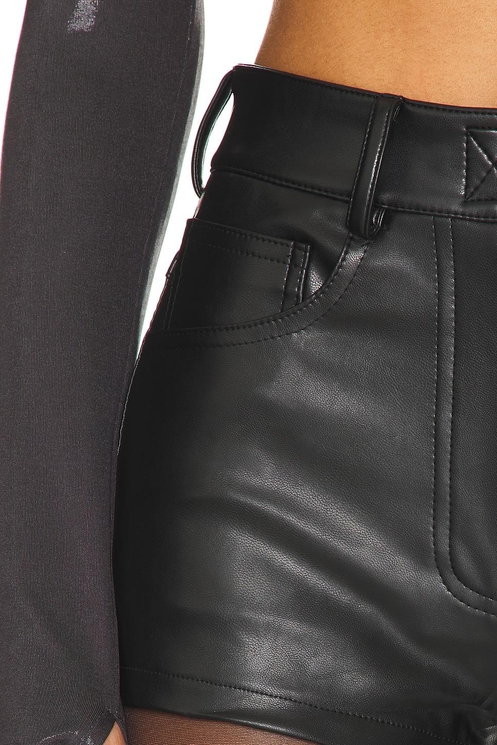 Face:100% polyurethane/Black: 95% polyester, 5% spandex. Machine wash. Zip fly and velcro closure. 5-pocket design. Faux leather. style runs large, size down. Shorts measure approx 10" in length. Made in China. Revolve Style No. NKAM-WF19. Manufacturer Style No. ST3249LVF27001.
