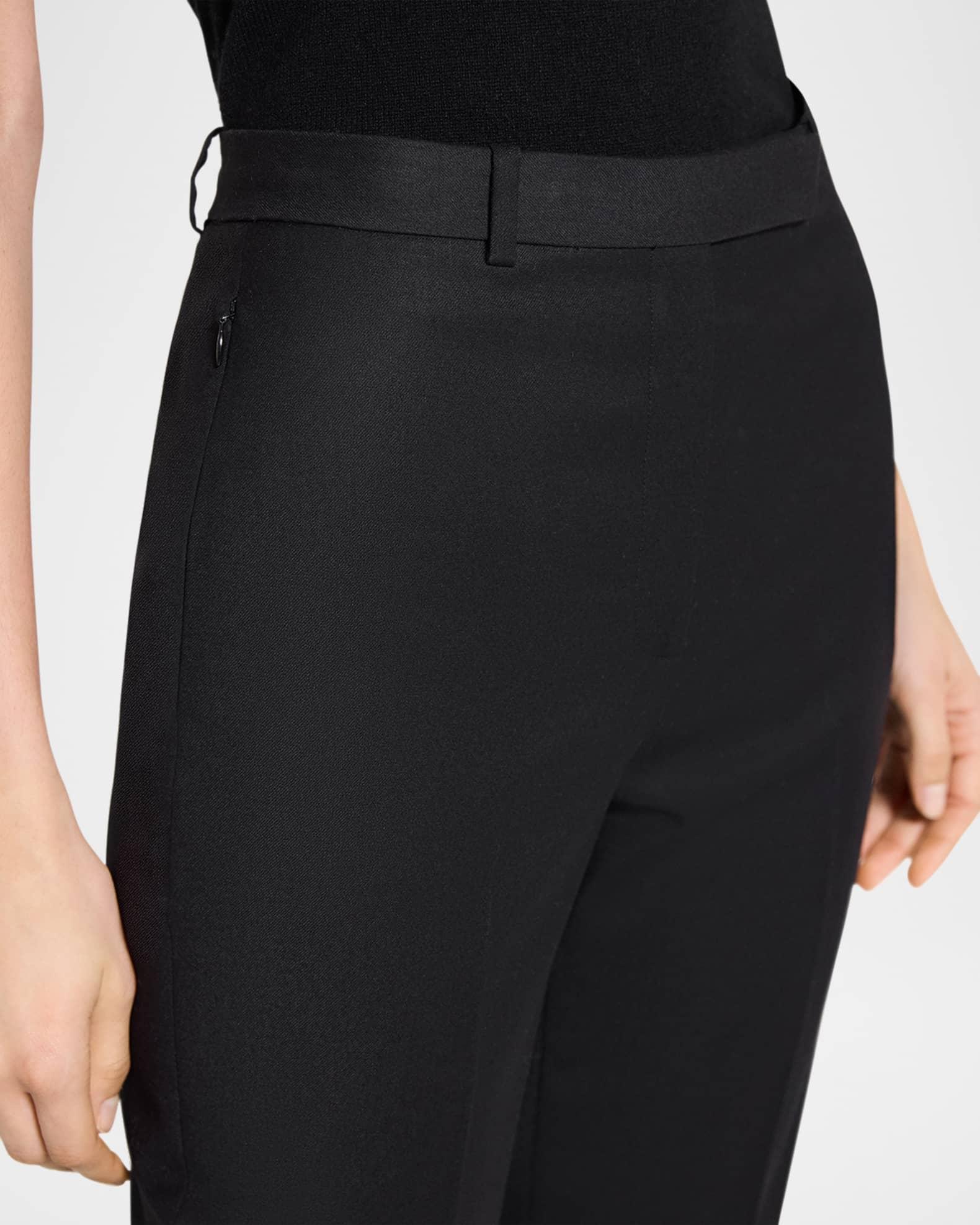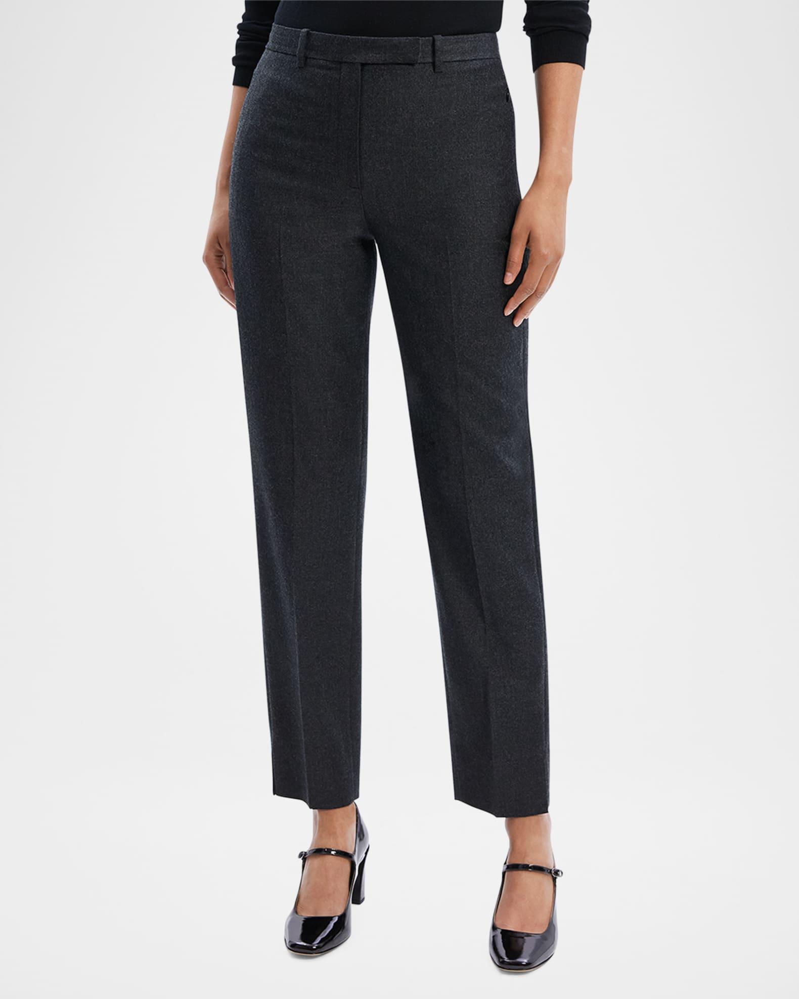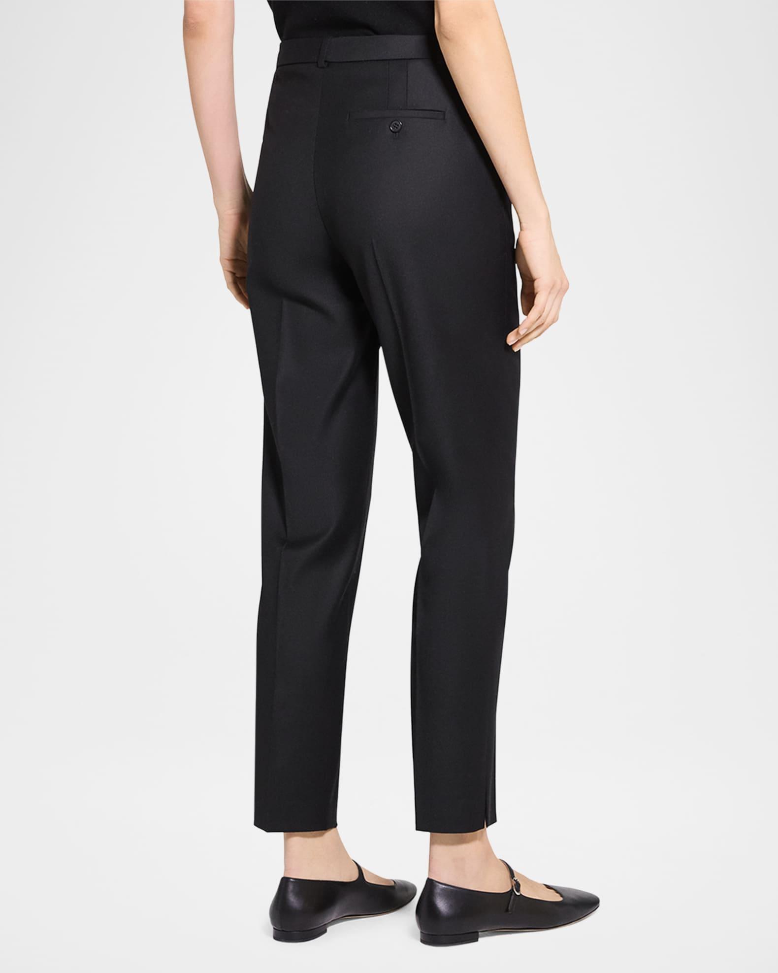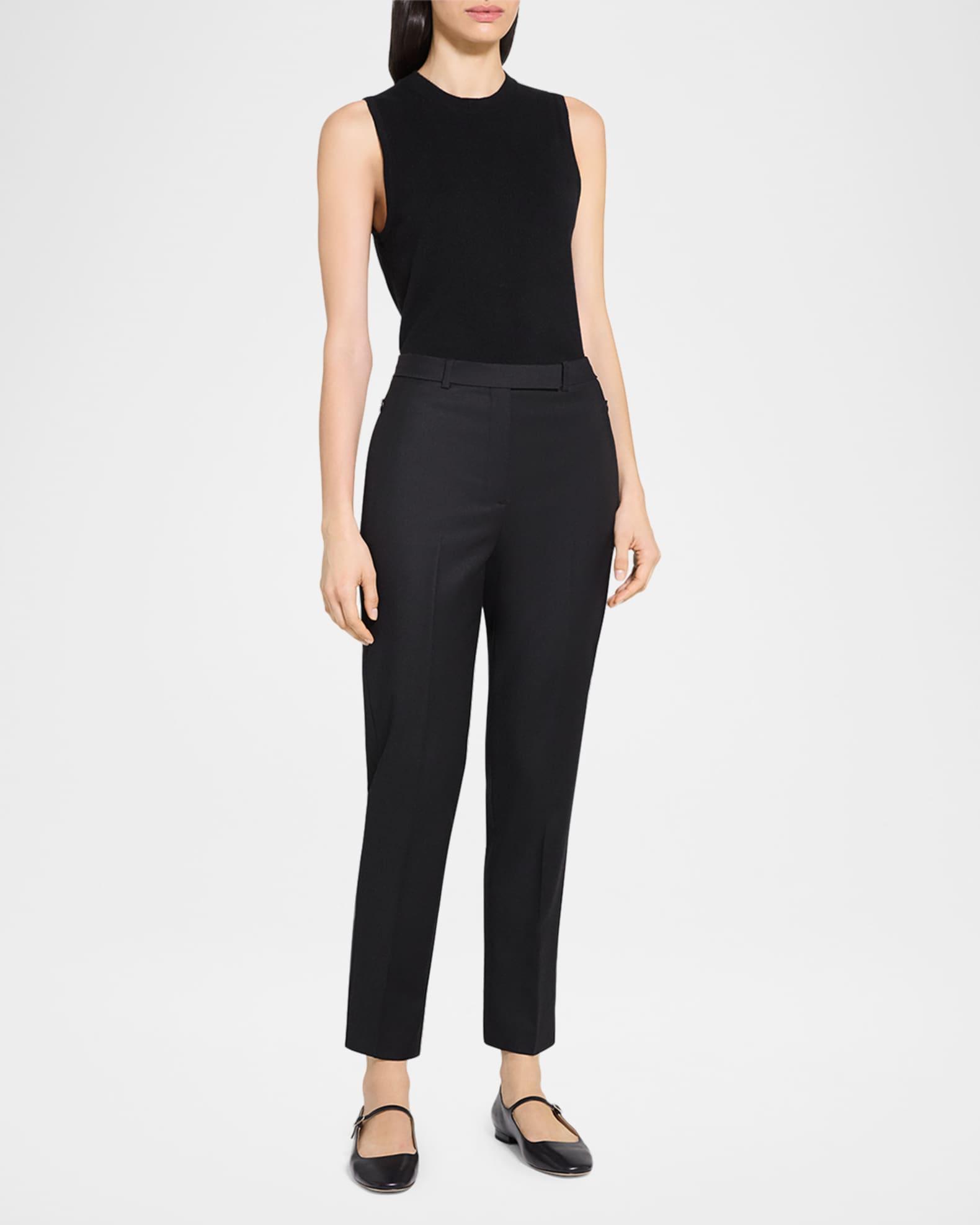 Theory pants with a tabbed waistband and traditional belt loops Approx. 29" inseam Mid rise On-seam pockets; back welt pockets Cropped at the ankle Slit cuffs Straight, tapered legs Zip fly; hook-and-bar closure Virgin wool Dry clean Imported Model is 5'10"/177cm.