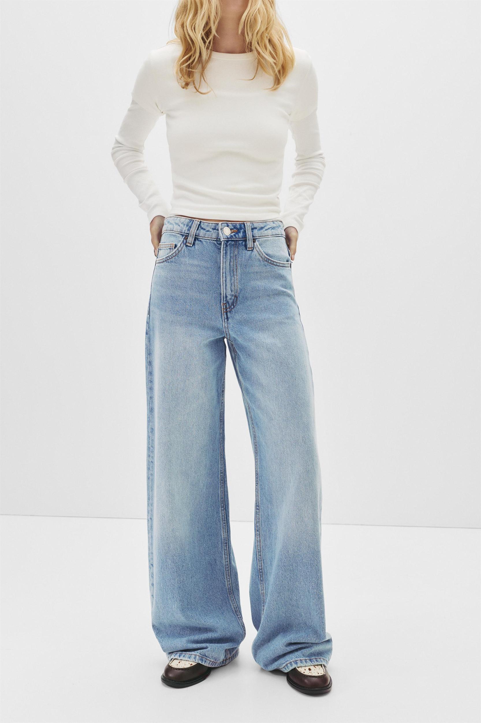 WAIST: High waist FABRIC: Not stretchy High-waist wide-leg jeans with a five-pocket design, waistband with belt loops, button and zip fastening, and made of cotton fabric.