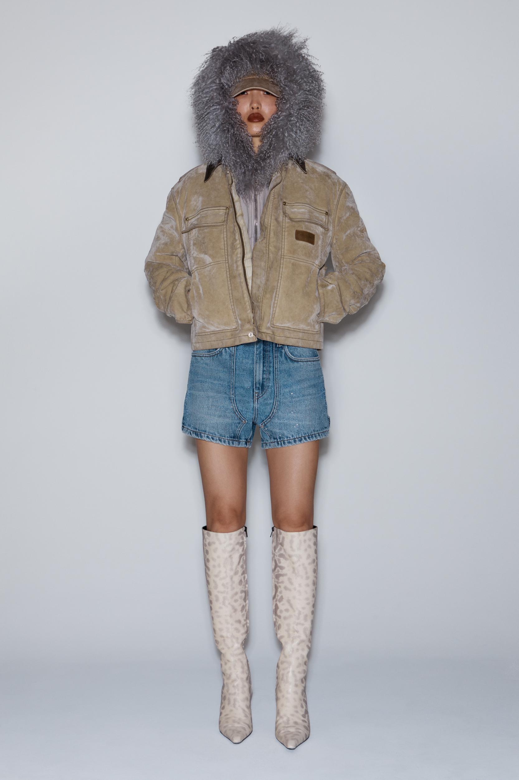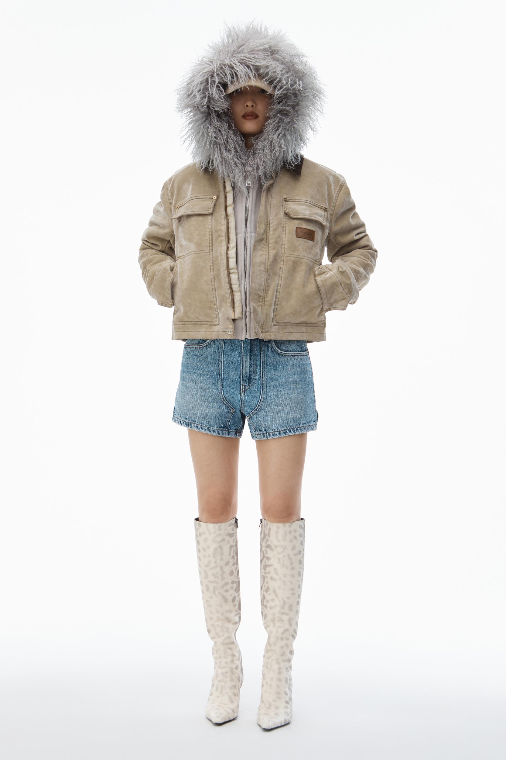 Beaded hotfix elevates this indigo workwear short, characterized by a hammer loop, carpenter styling at the front, and whiskering at the front and back for a distressed effect.