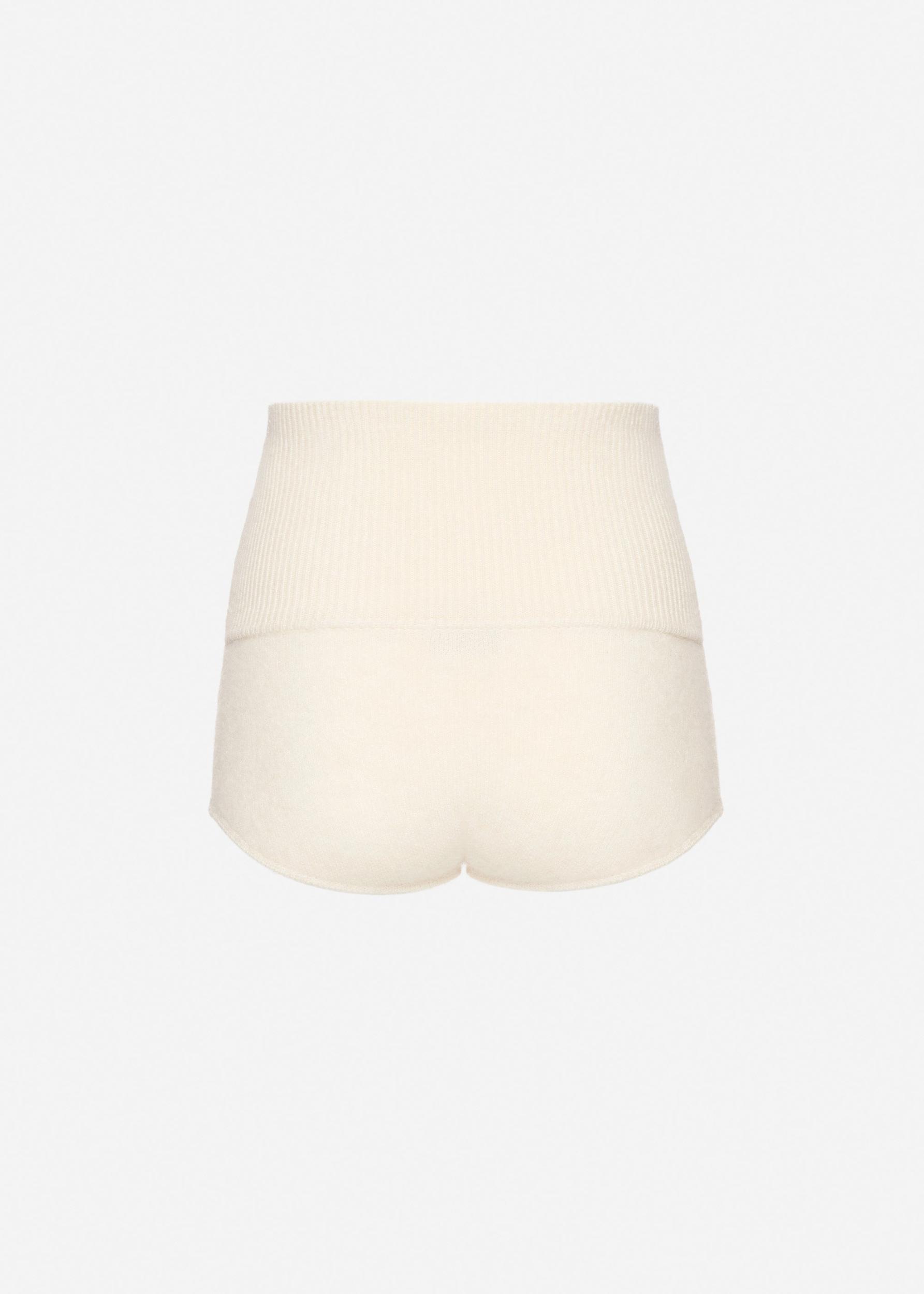 These ultra-soft shorts are crafted from a luxurious mohair-blend knit, offering a cozy texture with refined structure. Featuring a flattering high-rise ribbed waistband and a seamless silhouette, they come in a rich cream hue that adds warmth and sophistication. Pair with a matching cardigan.