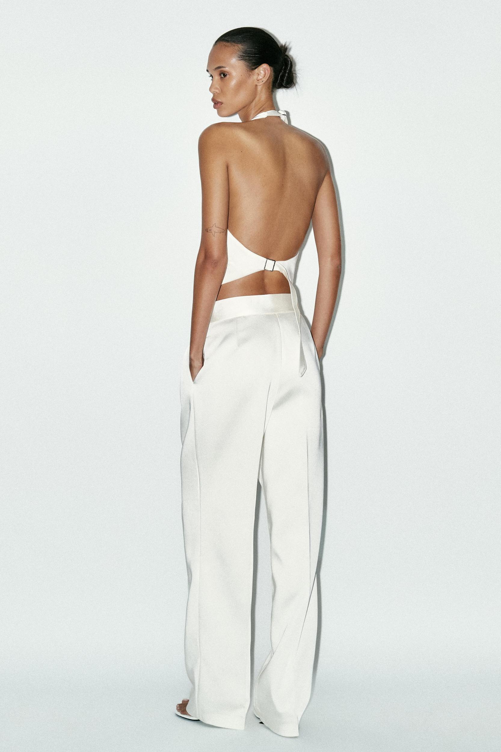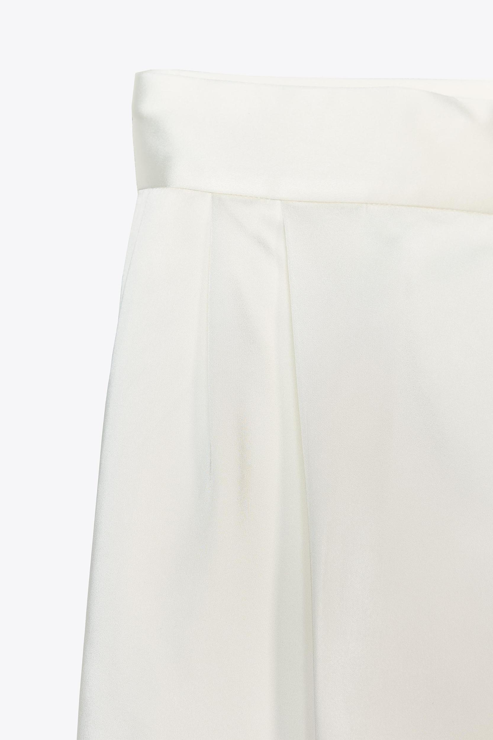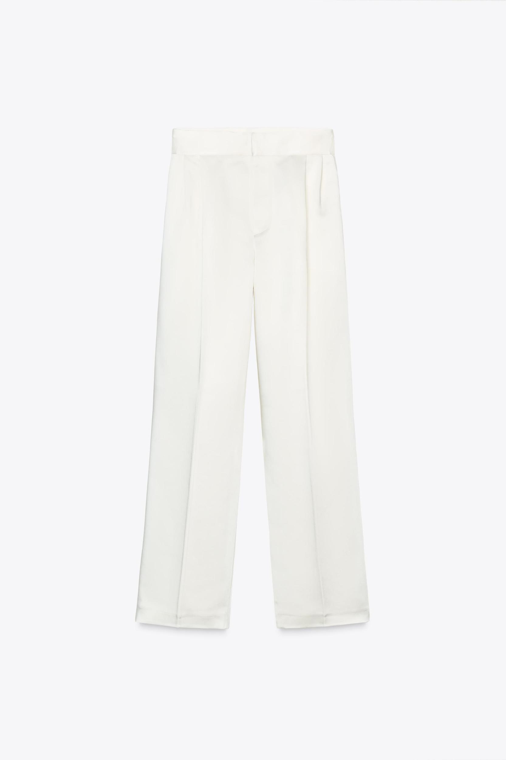 High-waisted pants made of satin fabric. Pleat detail on the front and back. Front closure with zipper, inner button and metal hooks.