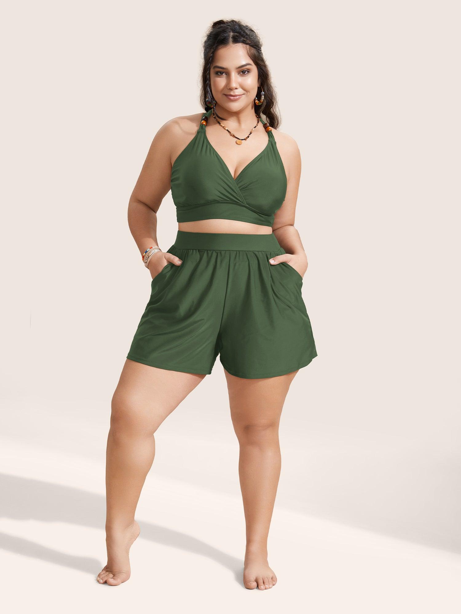 High Waisted Pockets Solid Pleated Swim Bottom Female