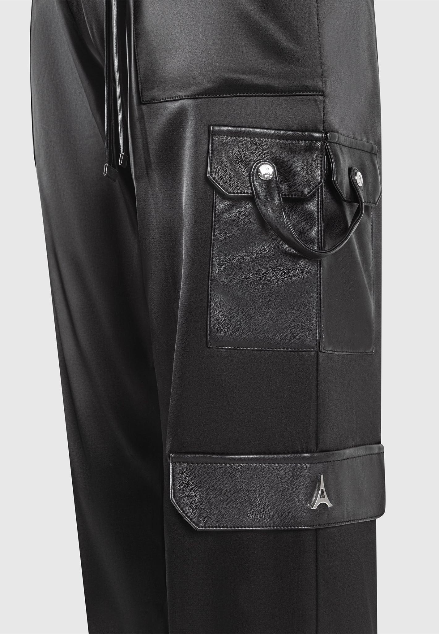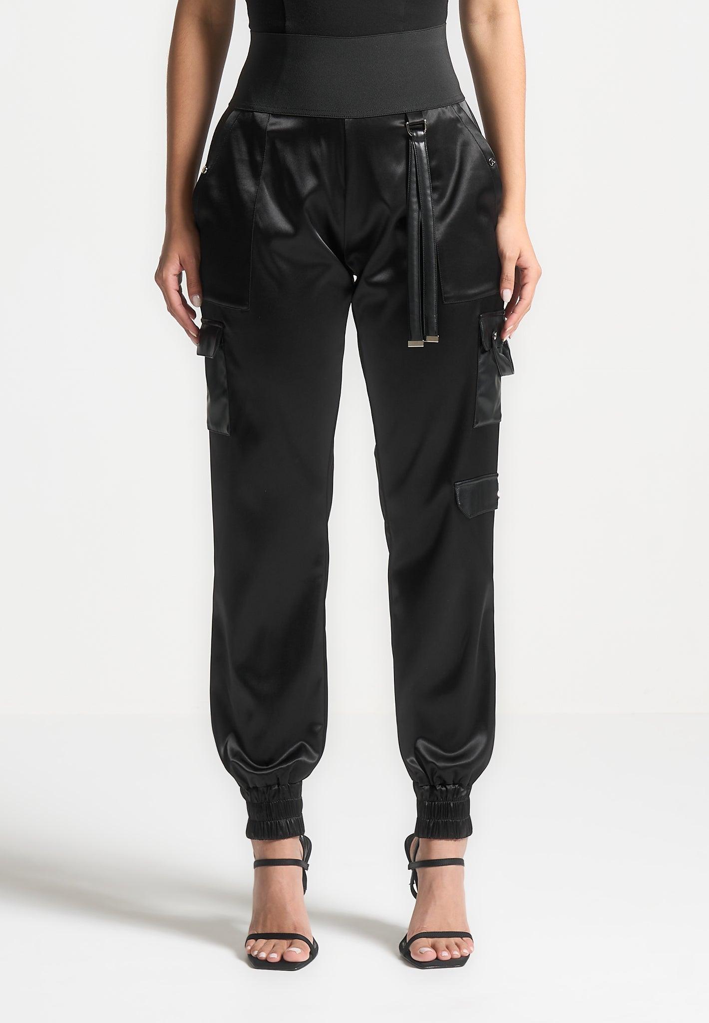 Black High Waisted Satin Cargo Trousers Cargo Trouser Silhouette Black Satin Panels D' Ring Feature With Satin Panel Tag Deep Elasticated Waistband Functional Pockets Manière De Voir Silver Plaque Branding To Back Pocket 96% Polyester, 4% ElastaneAlways check the care label for wash instructions.