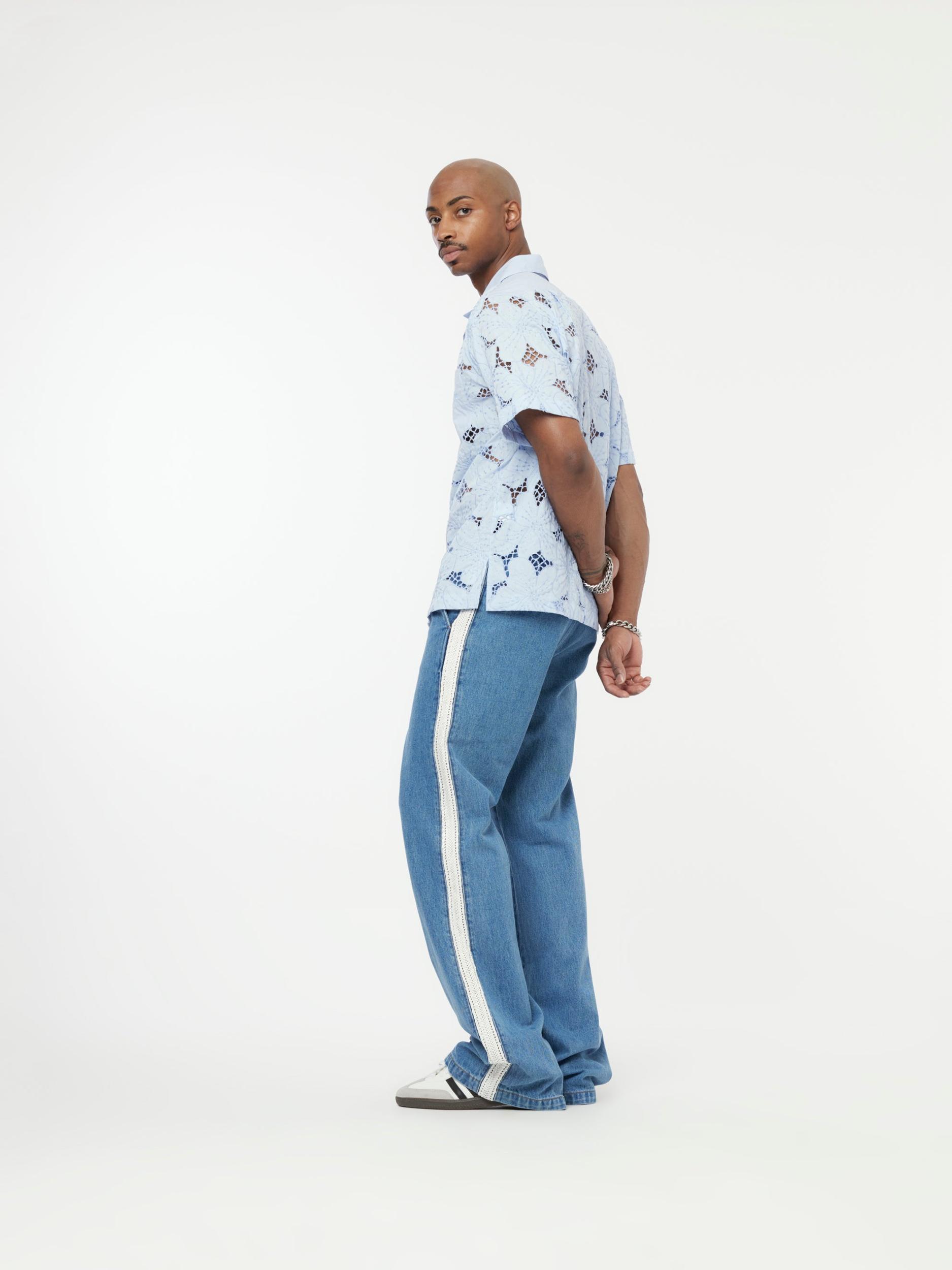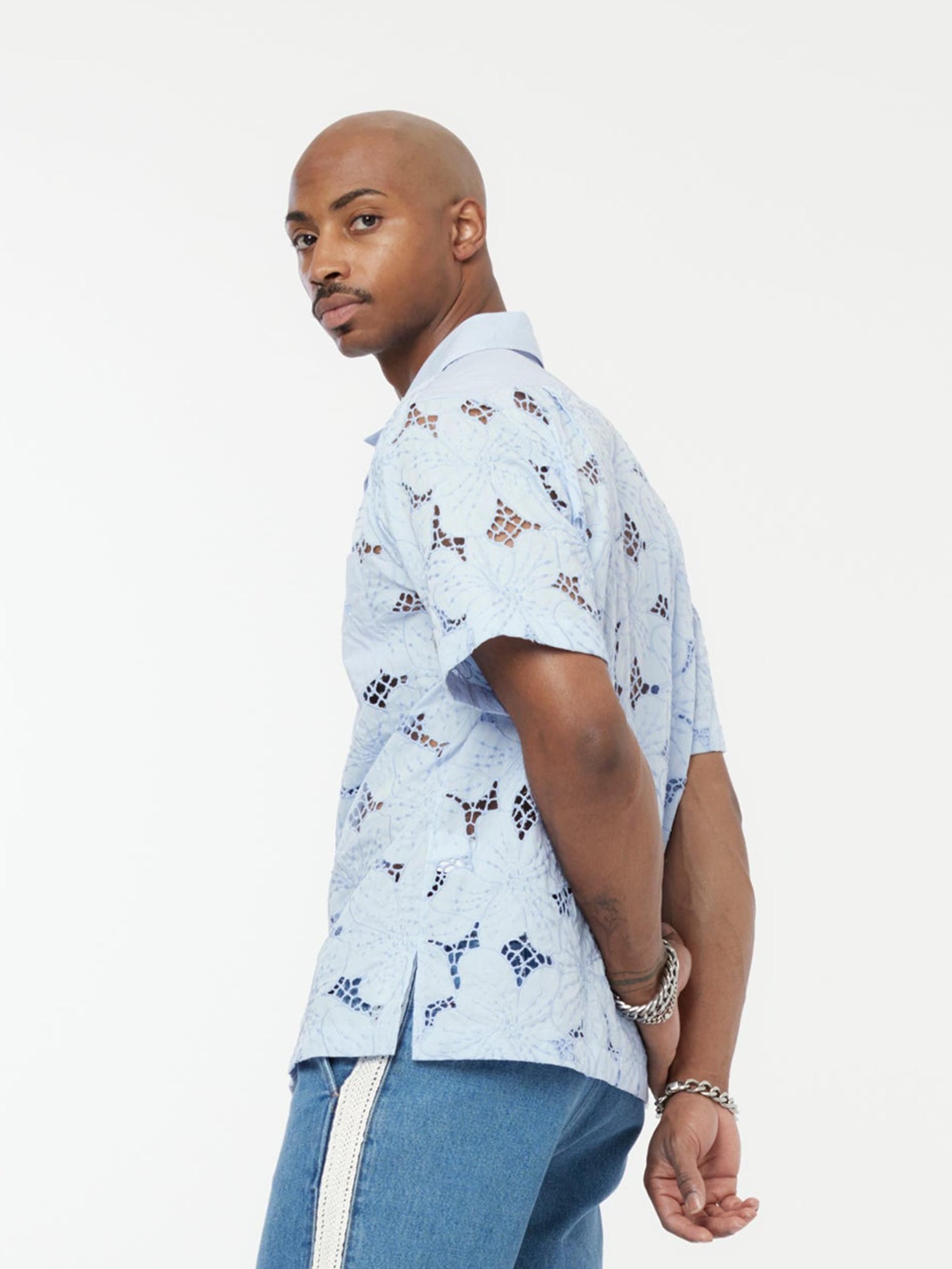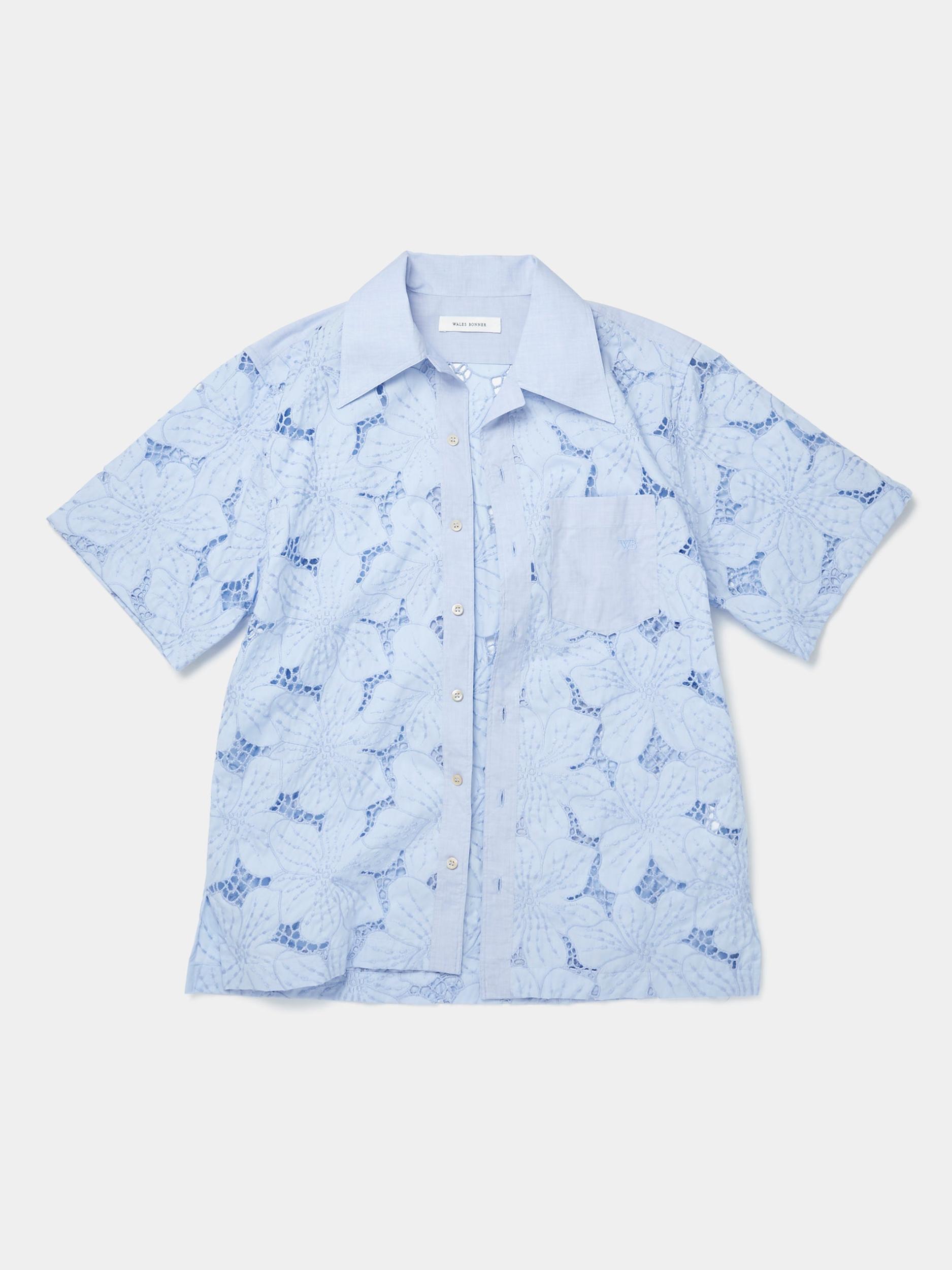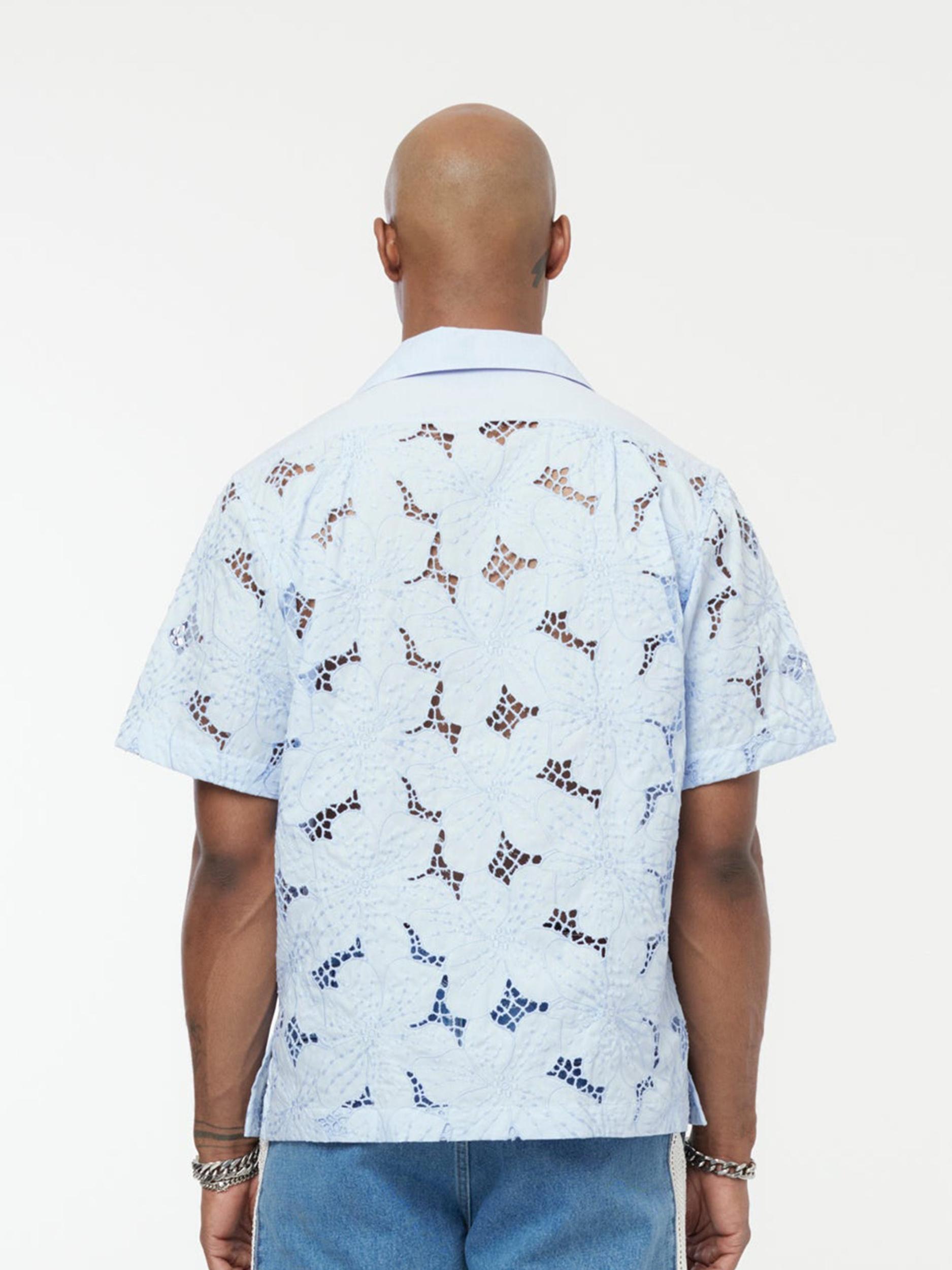The Highlife Shirt is made in Italy from a sky blue floral lace fabric and contrast chambray cotton. The signature bowling shirt silhouette is finished with a chest pocket, embroidered logo, and mother of pearl buttons. Model is 6'0 wearing size 50