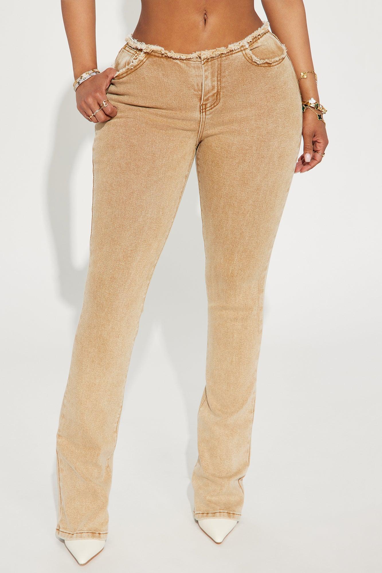 Available In Tan. Bootcut Jean Cut Off Waistband 5 Pocket 7.75" Low Rise 34" Inseam Medium Stretch Disclaimer: Due To The Specialized Wash & Distressing Process, Each Garment Is Unique 65% Cotton 33% Polyester 2% Spandex Imported California Proposition 65WARNING: Cancer and Reproductive Harm - www.P65Warnings.ca.gov.