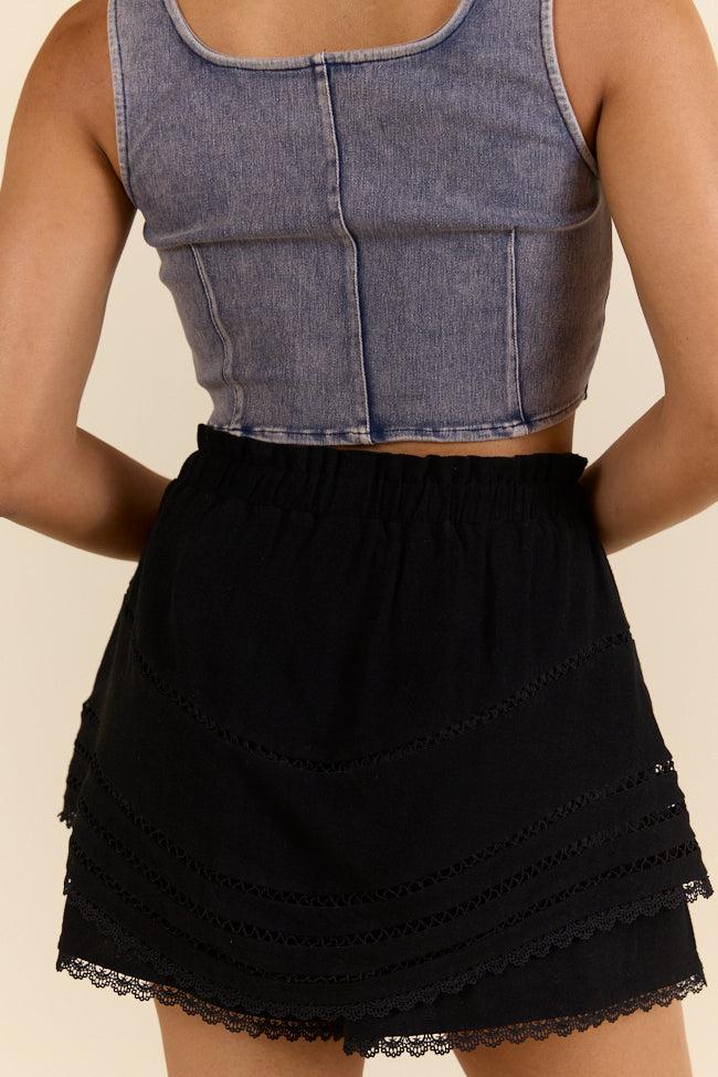 Details Woven Black Skort Fabric only has stretch in elastic Elastic waistband, lace trim Lined with shorts Size small inseam: 3.5" Material and Care 70% rayon 30% linen Hand wash cold, no drum drying Patterns may vary Materials may have natural variations Colors may vary from different viewing devices.
