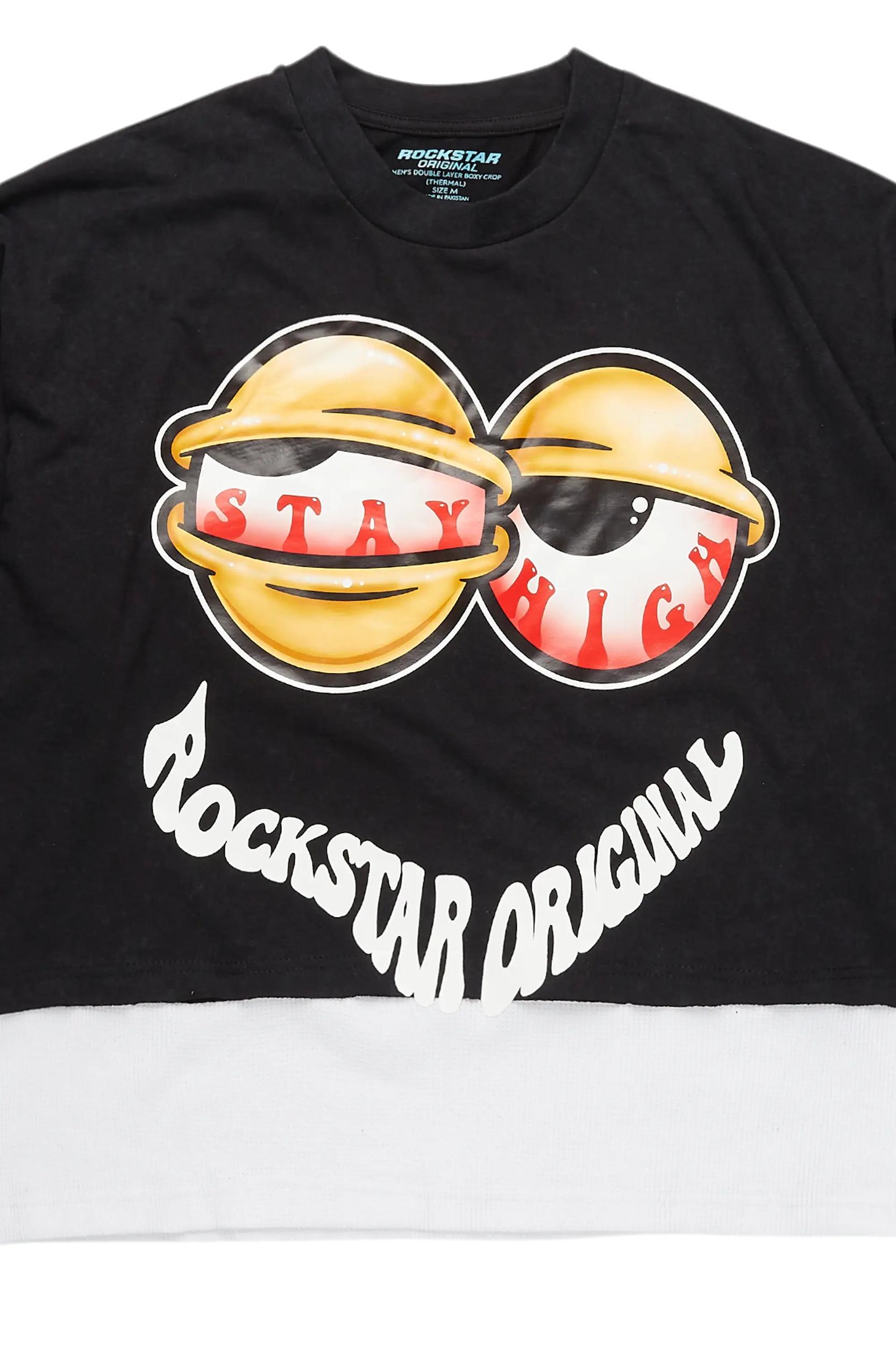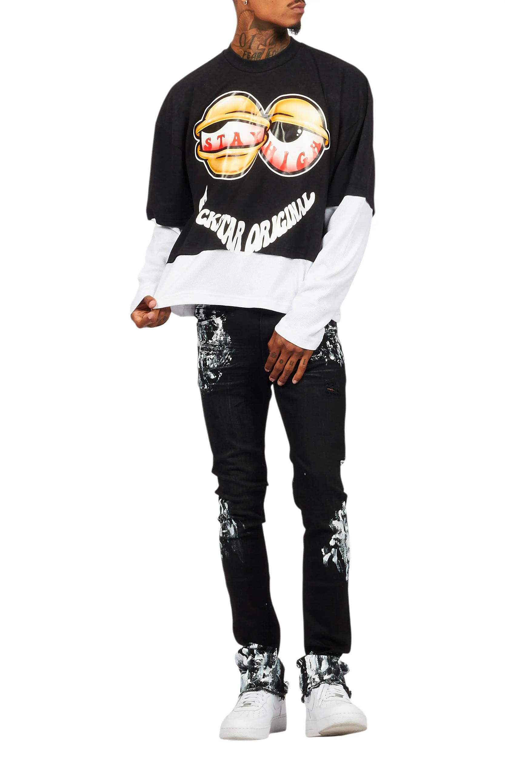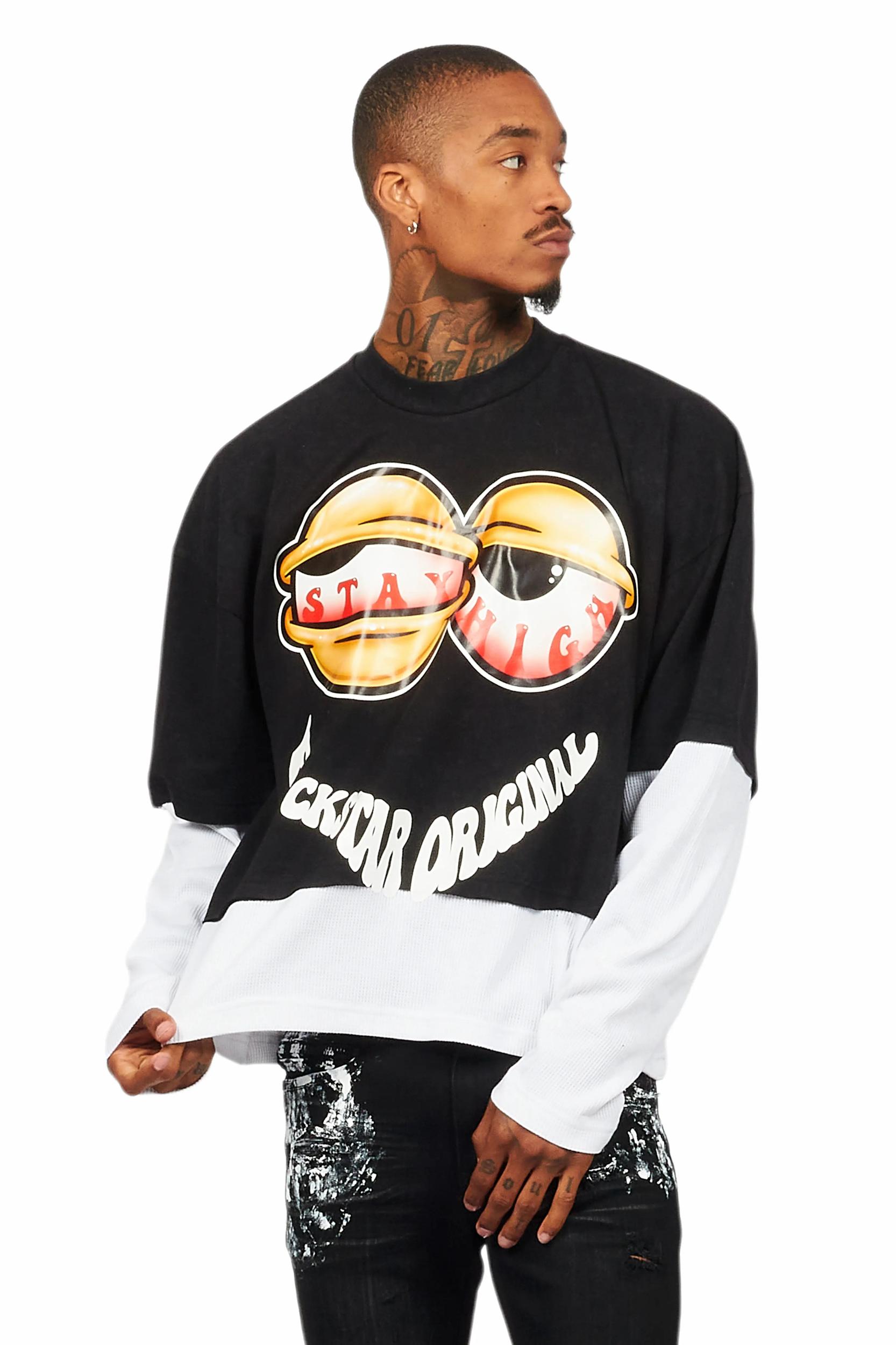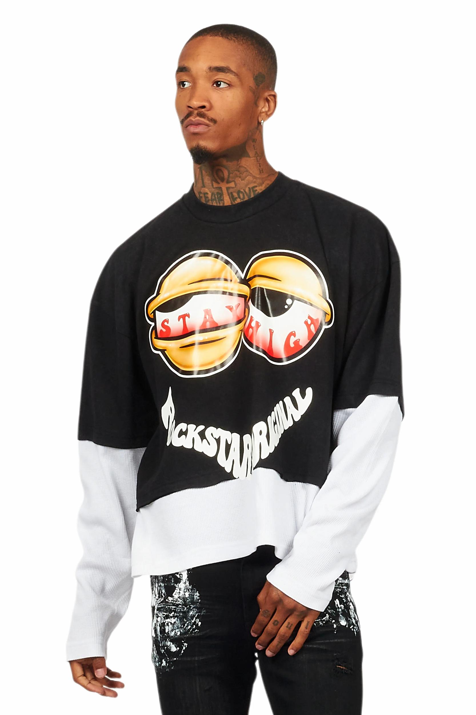An urban double layer long sleeve thermal and short sleeve tee for men in black. Designed with organic cotton and a boxy-fit for a dope streetwear style. Crew neckline Long sleeves Ribbed knit trims Short sleeves Boxy-fit Pullover style Soft textured thermal fabric Custom RSO graphics
