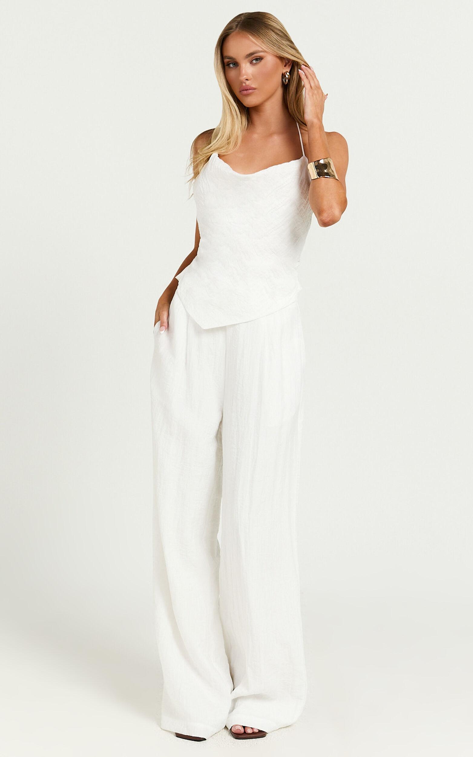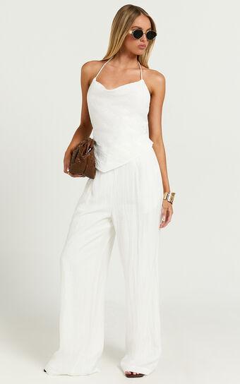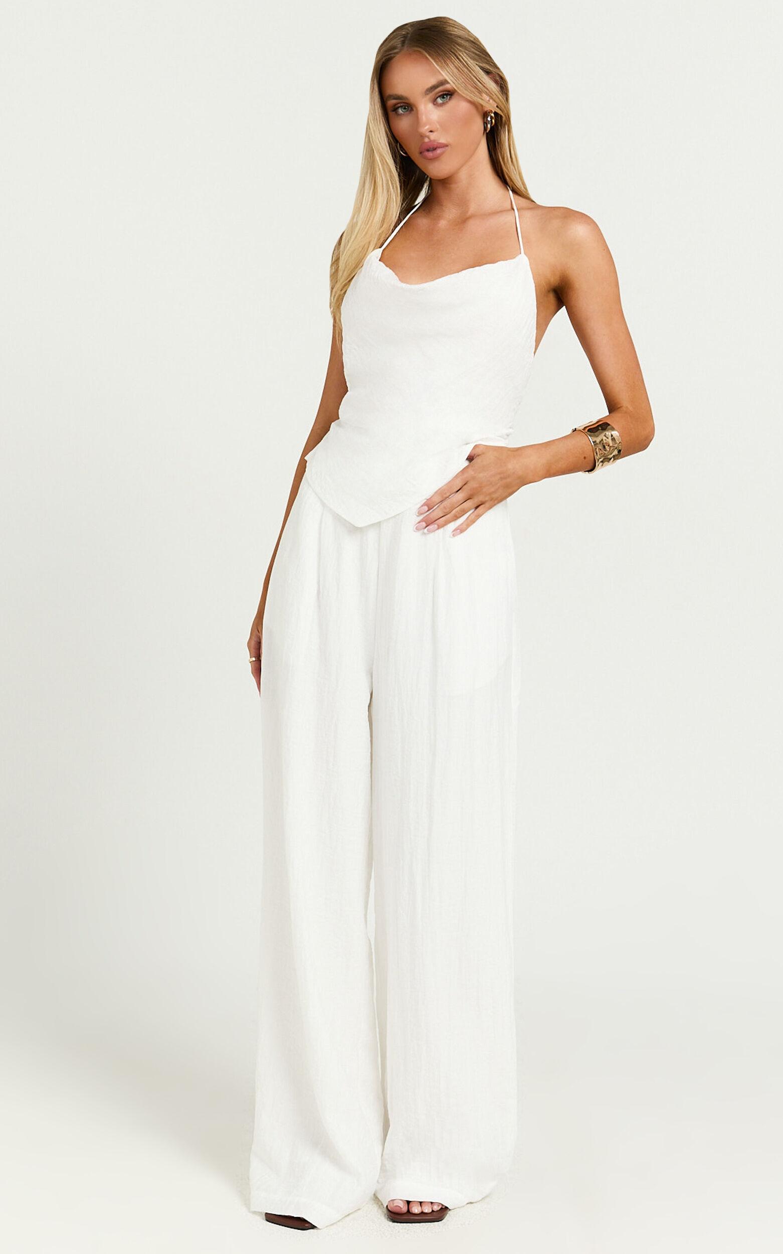 Get ready to turn heads in the Hilda Pants - your new go-to for elevating your style game. These high-waisted palazzo pants in white are crafted from a mid-weight woven polyester, mimicking that sought-after linen look while ensuring both durability and comfort. Perfect for any event, from a spontaneous party day to an elegant evening out, these pants blend sophistication with effortless chic.Product Details:Zips featurePalazzo styleMid weight wovenFull lengthHigh waistPolyester fabricPerfect for party daySize and FitSize S / 8 length: 115cm / 45.28inMaterial and CareMain Fabric: 100% Polyester Lining: 100% RayonLow Stretch