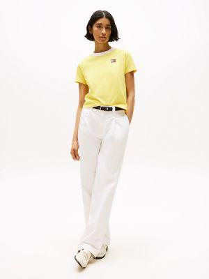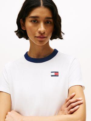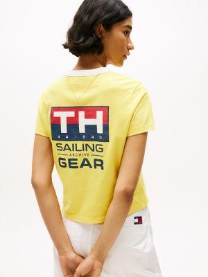 Tommy Hilfiger women's T-shirt. Our soft cotton tee features our sailing graphic at the back. Cut in a relaxed fit with a contrast collar, it's an unbeatable sporty look. Hilfiger Sailing — a limited-edition collection inspired by our archives, featuring timeless nautical style fused with contemporary design codes.