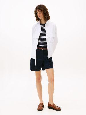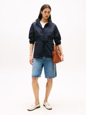 Tommy Hilfiger women's jacket. Made from sturdy nylon, our must-have yacht jacket will help you sail through transitional seasons. Special design details include a convenient hidden hood for function and silhouette versatility. The drawcord waist and elastic cuffs keep the warmth inside and the weather out.