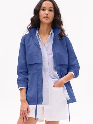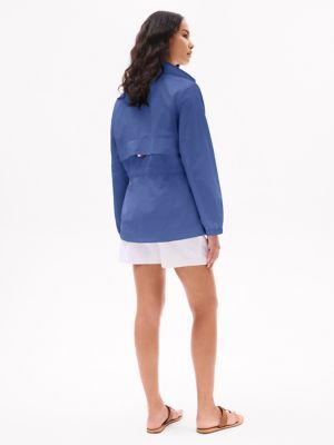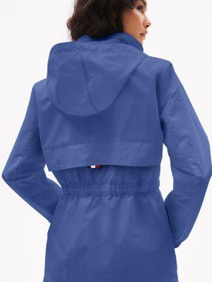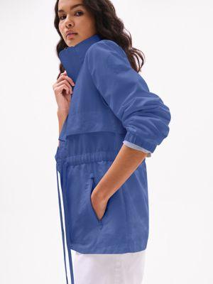 Tommy Hilfiger women's jacket. Made from sturdy nylon, our must-have yacht jacket will help you sail through transitional seasons. Special design details include a convenient hidden hood for function and silhouette versatility. The drawcord waist and elastic cuffs keep the warmth inside and the weather out.