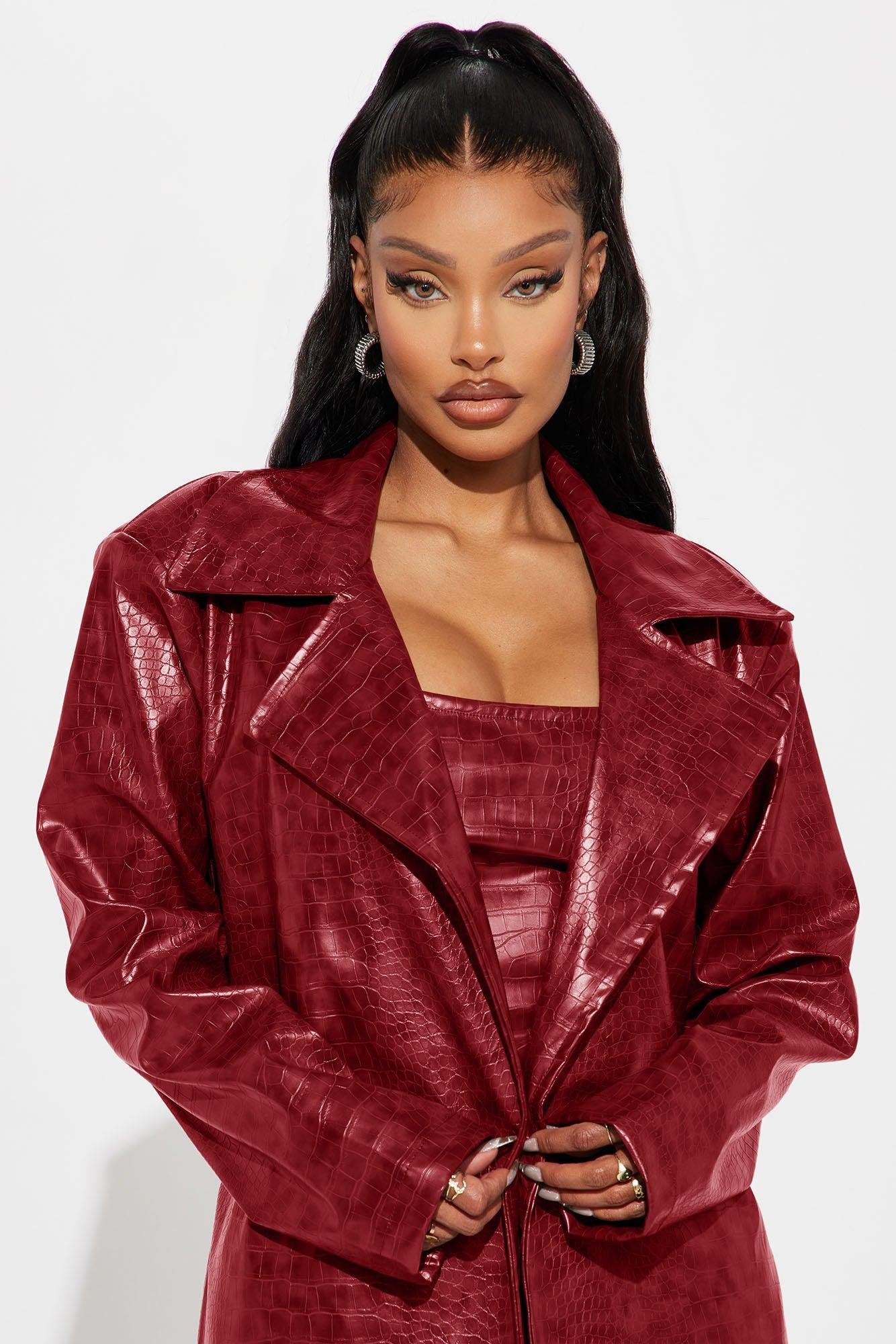 Available In Chocolate, Olive And Wine. Faux Leather Mini Dress Set Straight neckline Strapless Croc embossed Includes jacket Side zipper Stretch Top Self : 50% Polyester 50% Polyurethane Dress Self : 50% Polyester 50% Polyurethane Lining : 100% Polyester Imported California Proposition 65WARNING: Cancer and Reproductive Harm - www.P65Warnings.ca.gov.