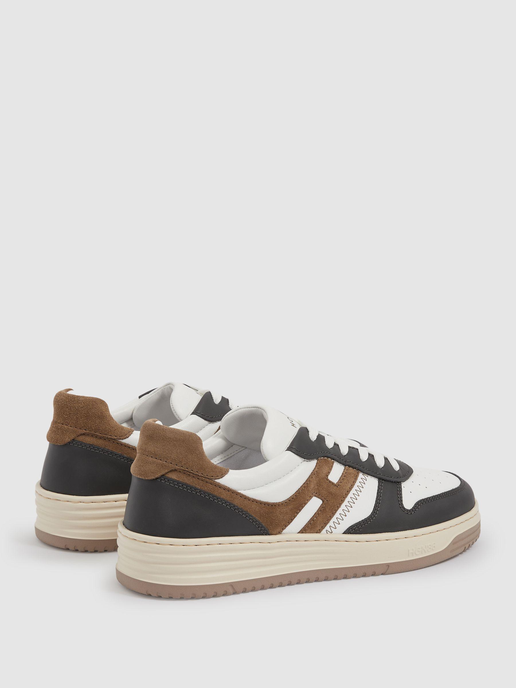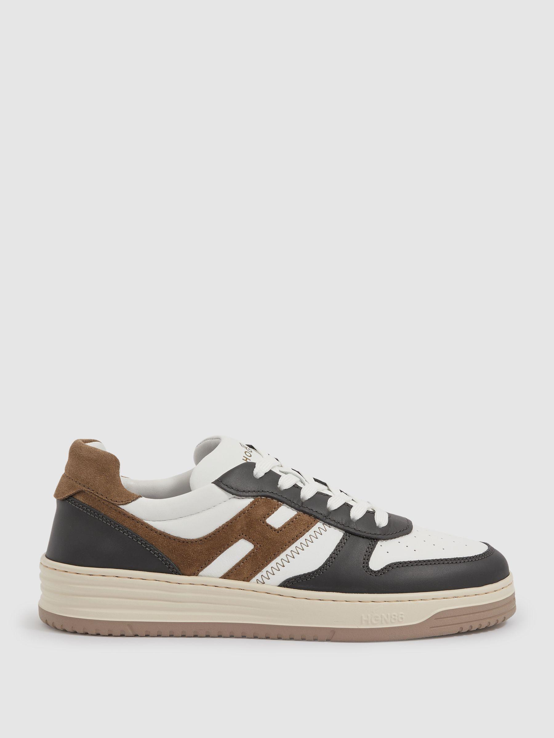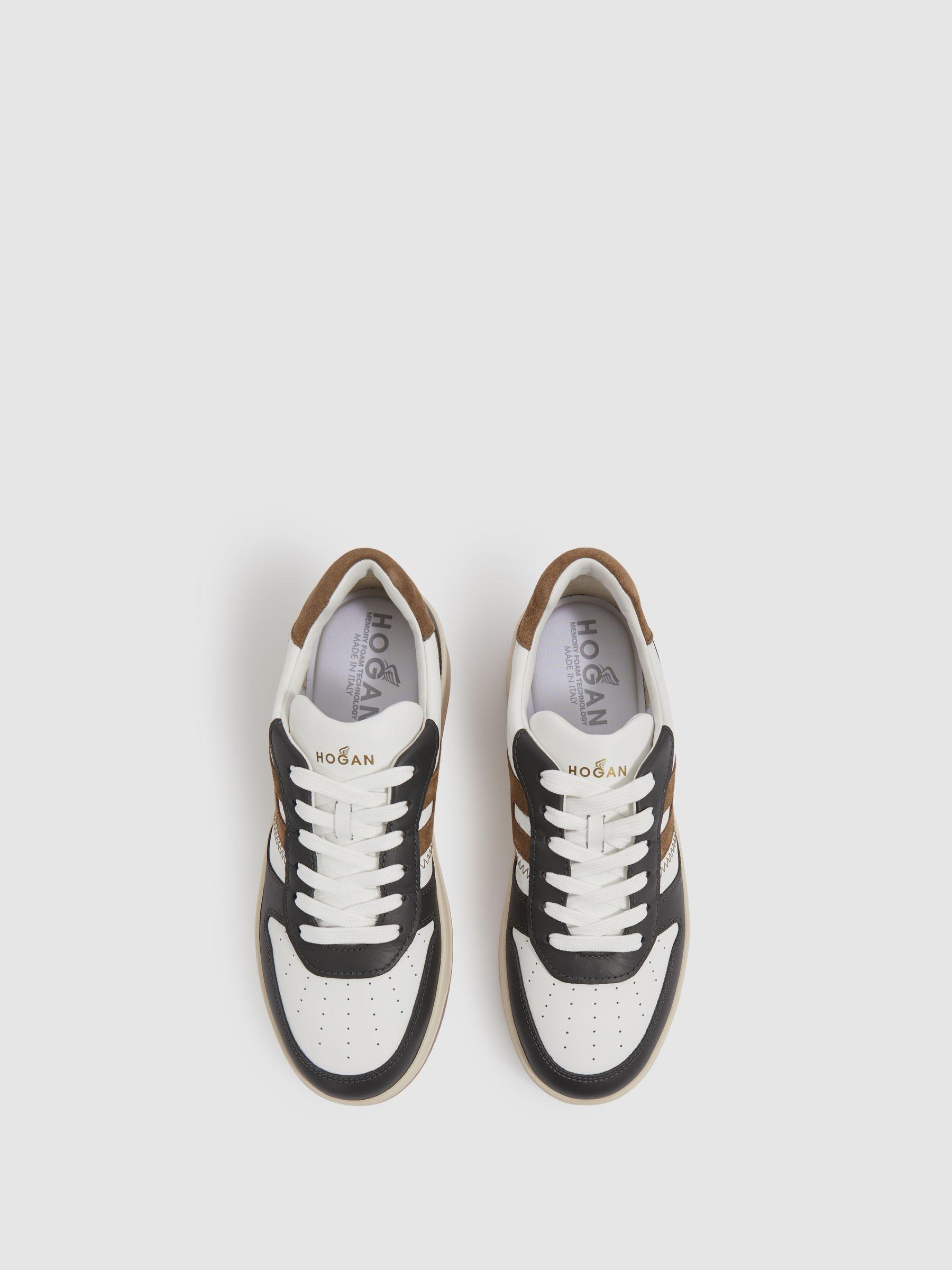 The Hogan H630 sneakers blend basketball-inspired design with signature brand styling. Made from smooth leather and suede inserts, they feature an extended H that wraps around the heel. The extra-light EVA outsole is embossed with the HGN86 logo and reimagined Rebel grooves, adding a modern touch to a timeless silhouette. Leather and suede Lace-up. Extended H logo at the side. Logo print tongue. Memory-foam insole. Extra-light EVA outsole. Hogan, curated by Reiss, is an Italian brand at the forefront of casual-luxury footwear. These versatile designs are intended to satisfy both formal and informal dress-codes, lending your wardrobe ultimate style mileage.