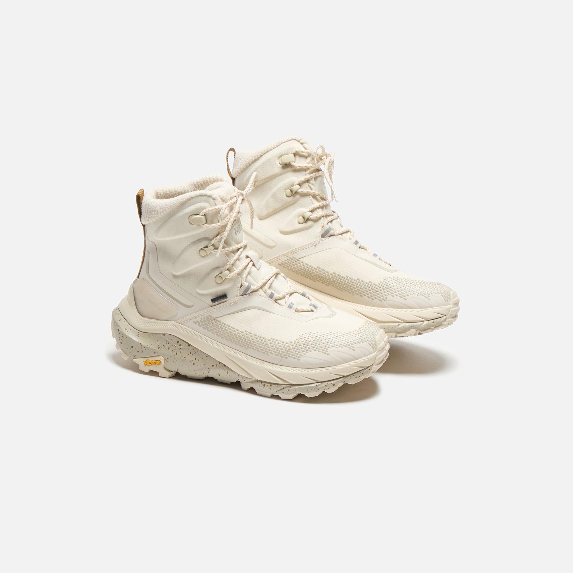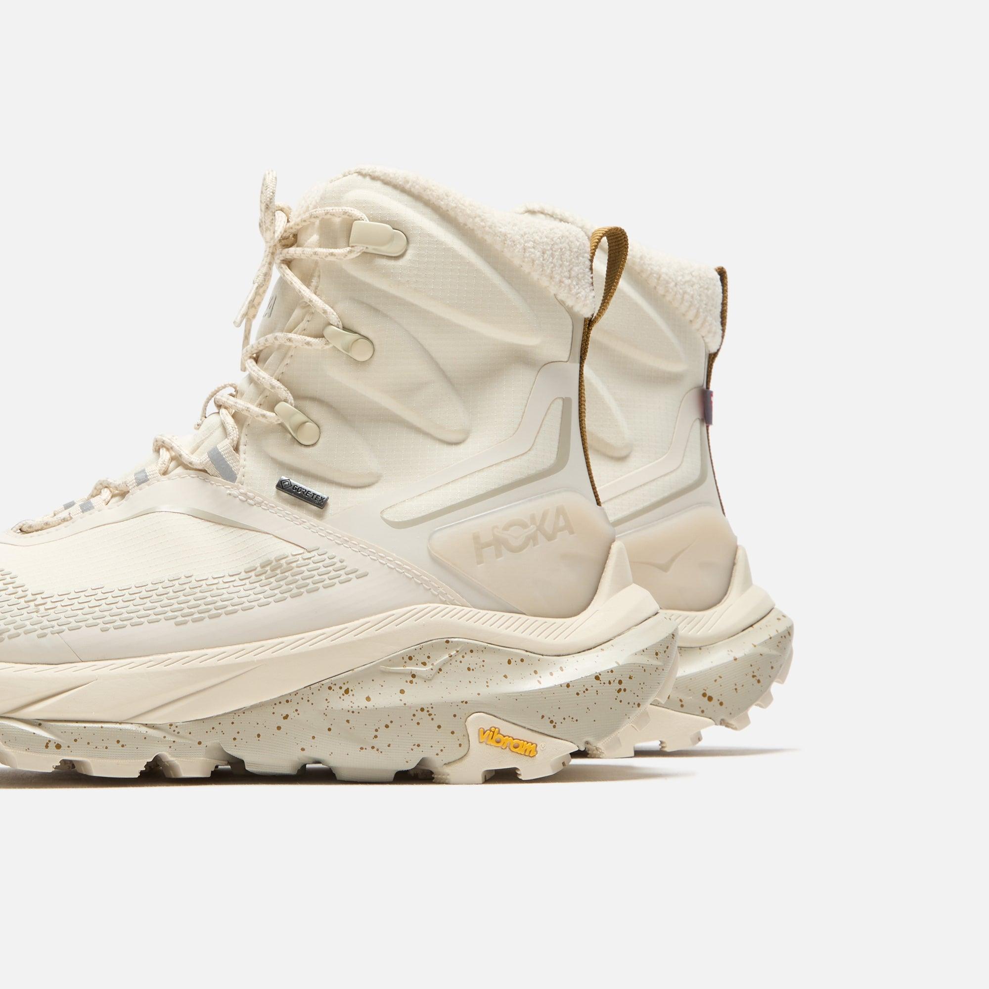Kaha 2 Frost GTX silhouette Recycled polyester and ripstop mesh upper GORE-TEX membrane PrimaLoft® Gold insulation Rubberized toecap Metal eyelets HOKA branding on tongue HOKA branding at lateral ankle Rope laces Heel pull Polyurethane insole CMEVA midsole HUBBLE® heel SwallowTail™ Vibram® Megagrip EVA outsole with 5mm traction lugs Style: ho1155195-oks Color: Oat Milk / Sesame Material: Textile