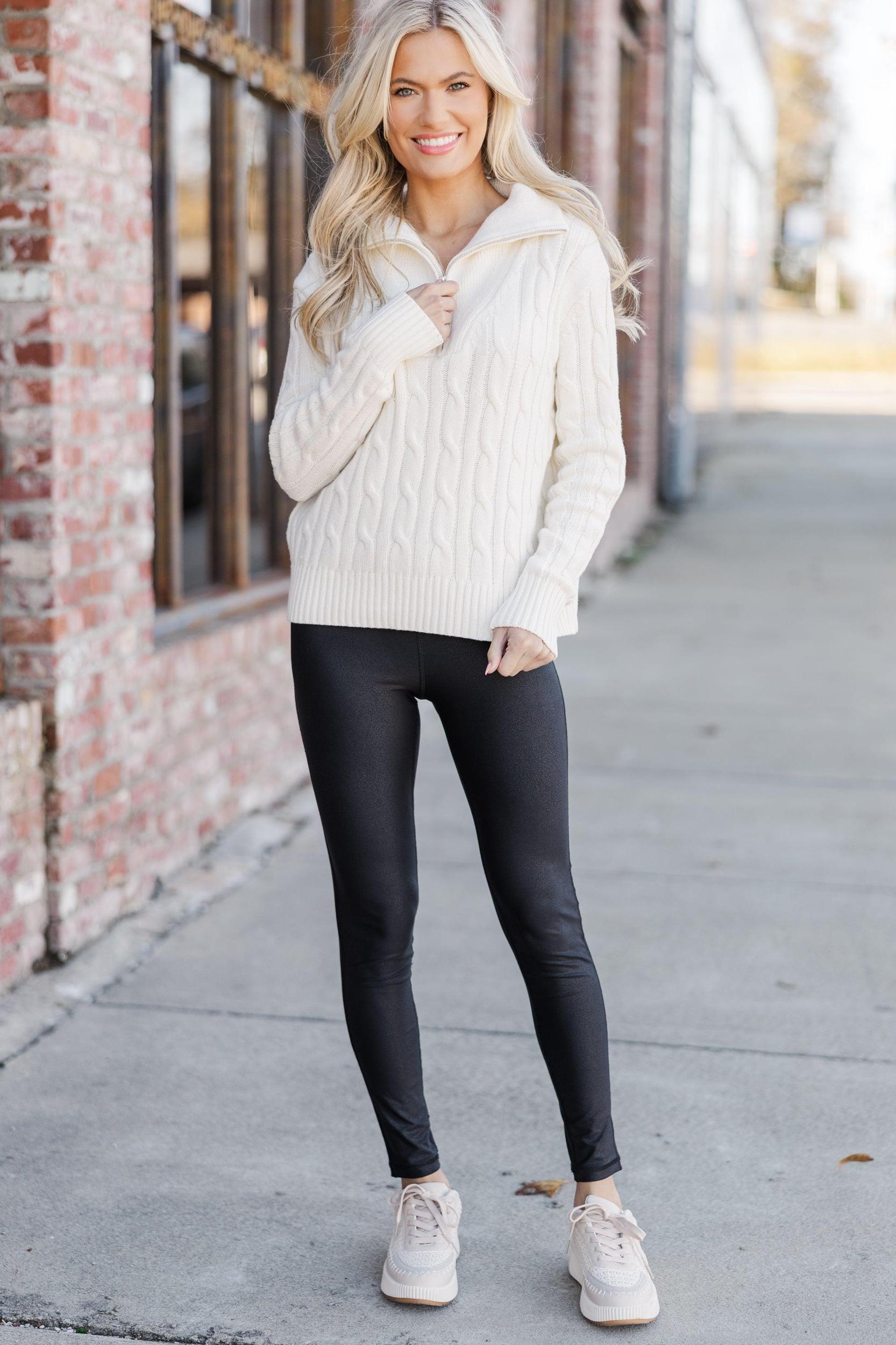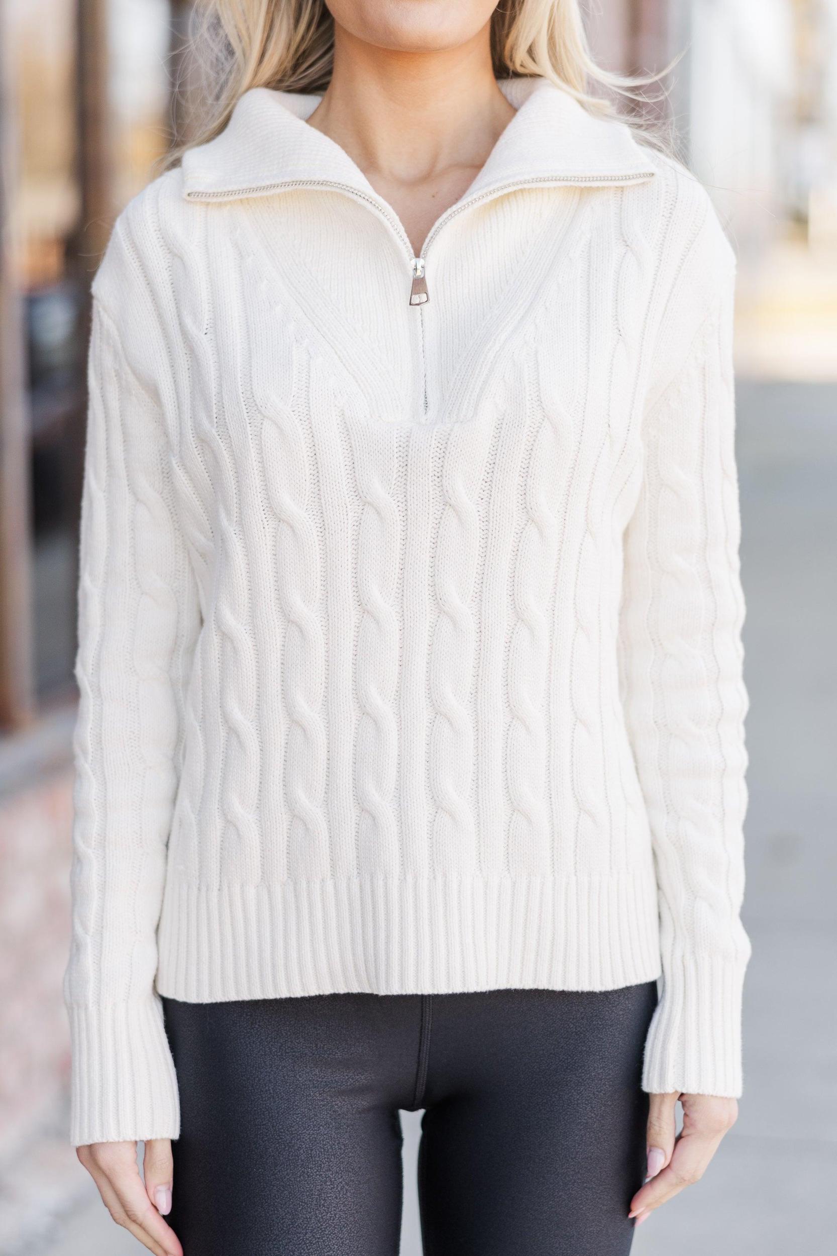 You are going to want to hold on tight to this quarter zip sweater! That cable knit fabric is so cozy and we know you are going to love that neutral hue. This pullover is perfect for any day of the week! Collared neckline with quarter zip closure Long sleeves Cable knit fabric Generous stretch Baileigh is wearing the small.