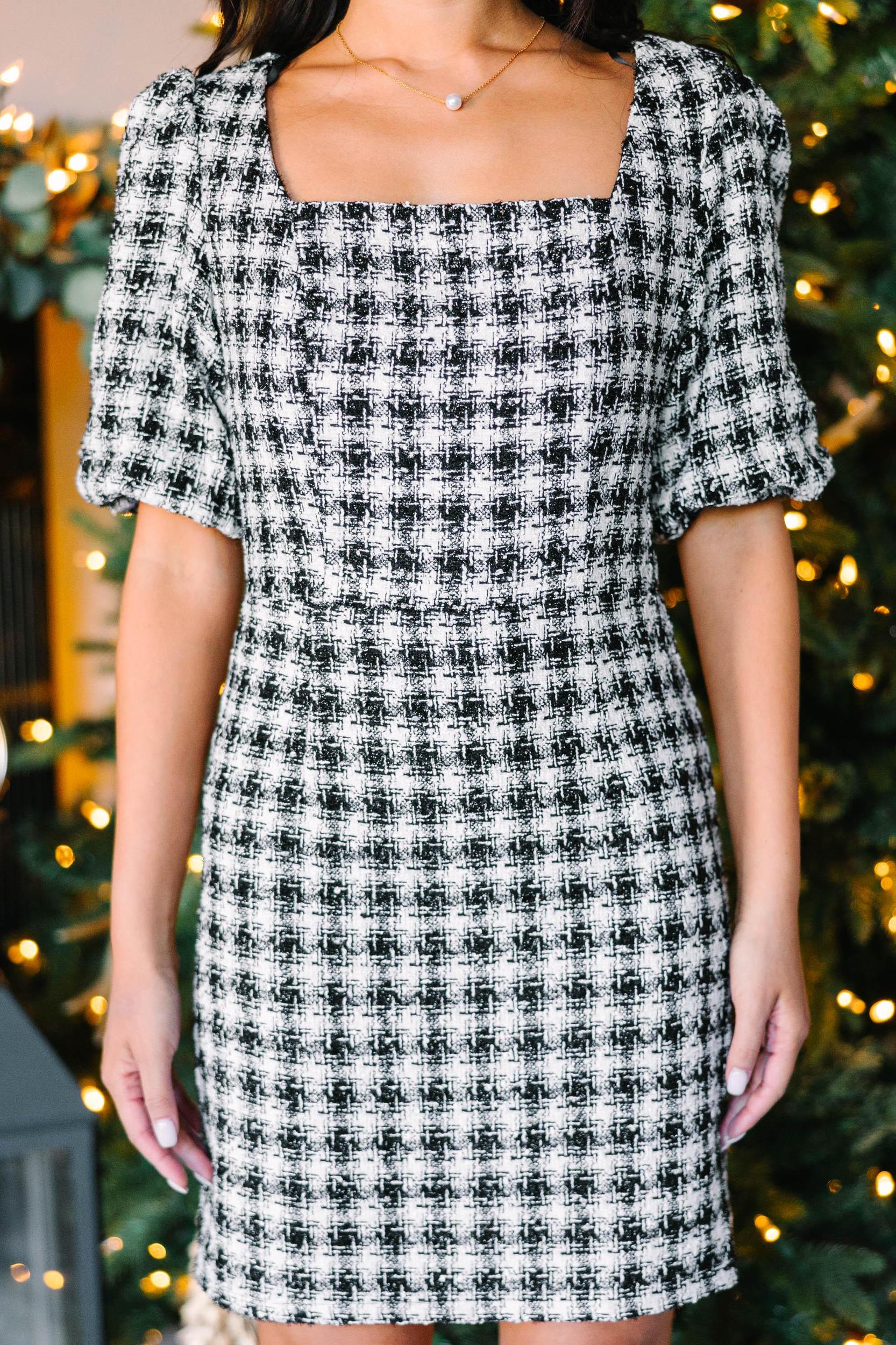 This dress is truly a holiday classic! Its fit is perfectly flattering and we love the neutral coloring. This tweed dress is going to look so good for holiday parties, a day at the office with a blazer, or on a date night. This dress features short bubble sleeves, a square neckline, a zip back closure, and a tweed fabric with a slight sheen. Material has no amount of stretch.Cindy is wearing the small.