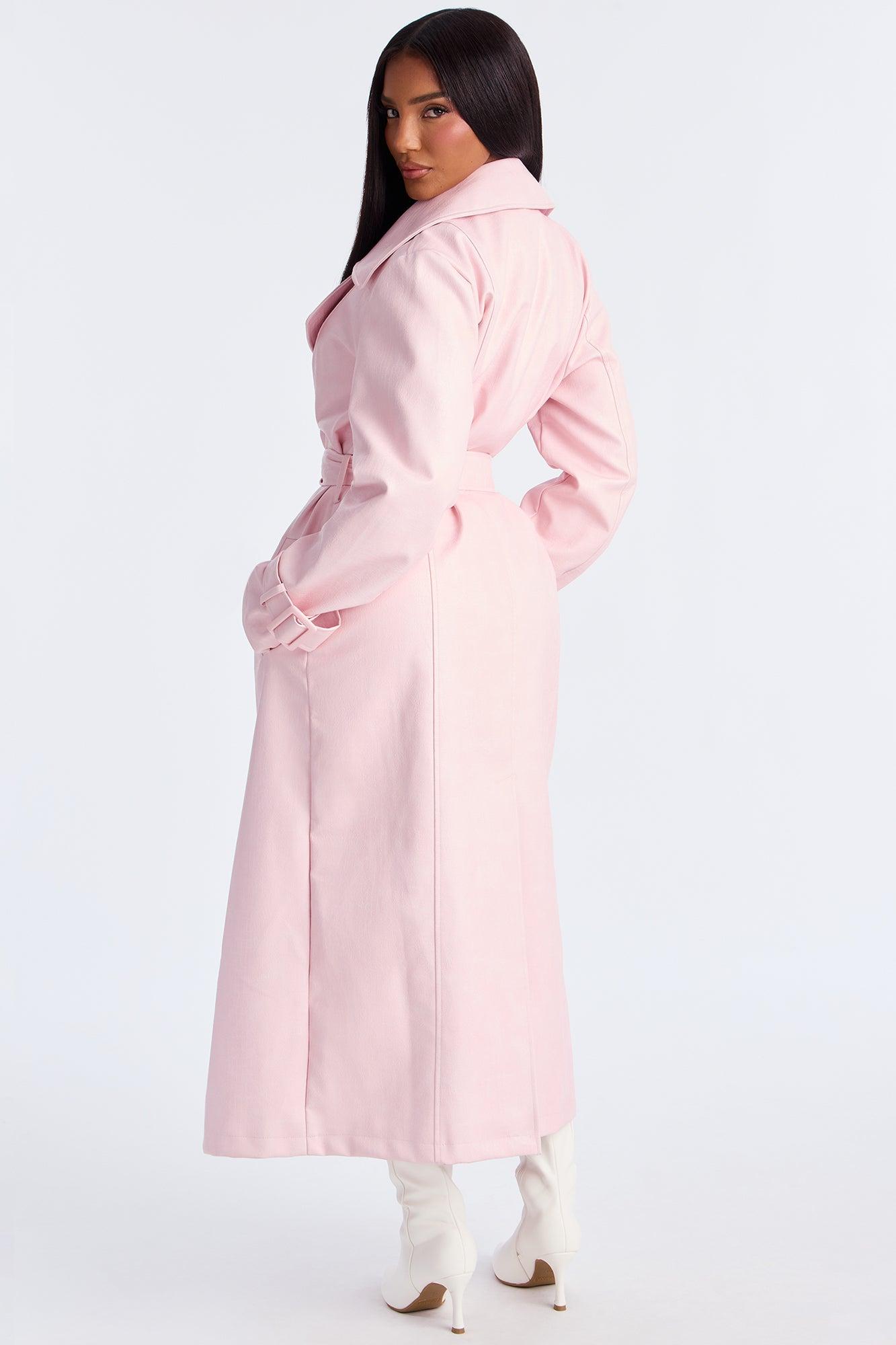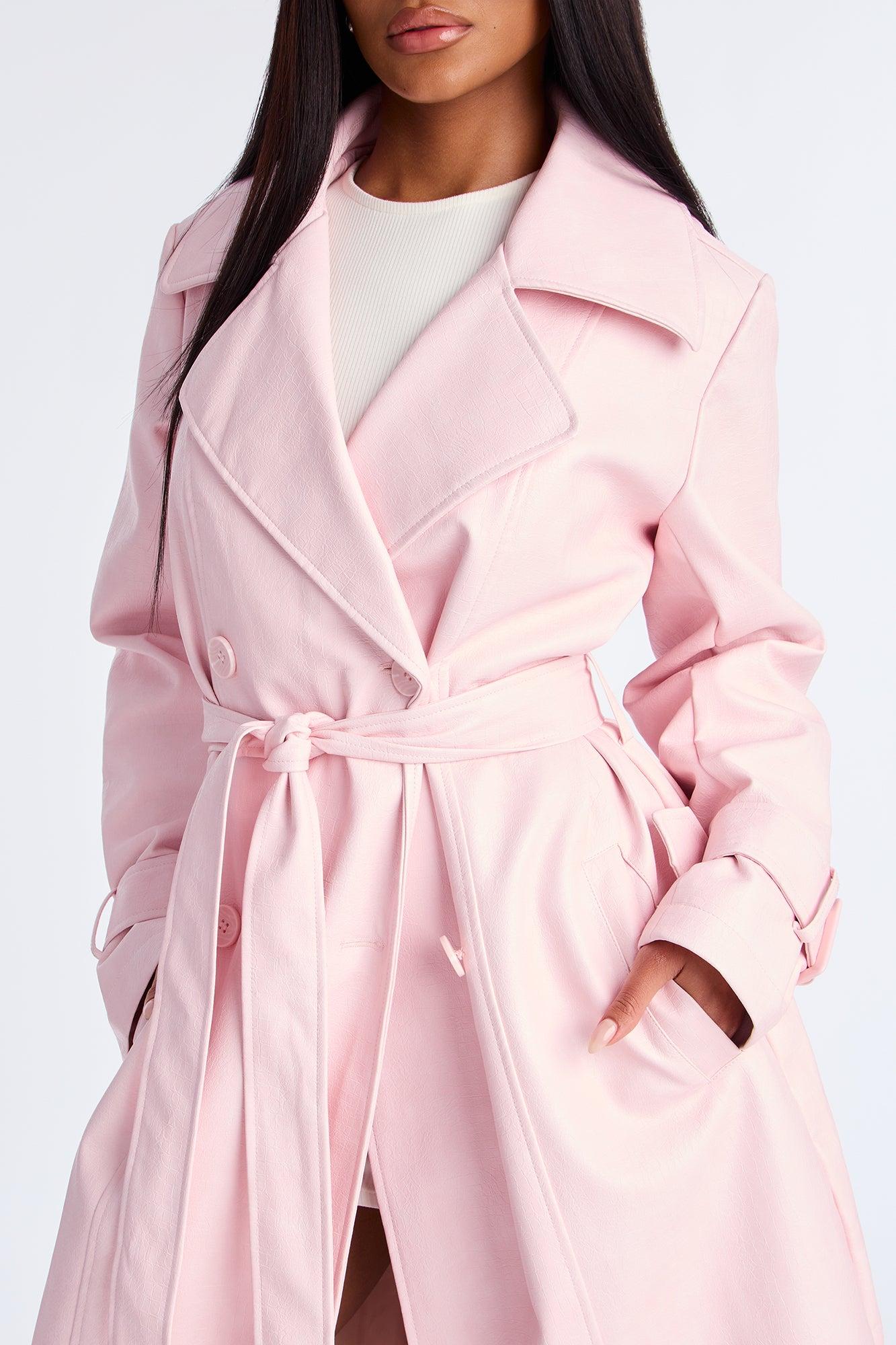 Available In Grey/Blue And Pink. Faux Leather Trench Coat Collar Neckline Long Sleeves W/ Belted Detail Croc Embossed Double Breasted Tie Waist Fully Lined Self Coating: 100% Polyurethane Self Backing/Lining: 100% Polyester Imported California Proposition 65WARNING: Cancer and Reproductive Harm - www.P65Warnings.ca.gov.