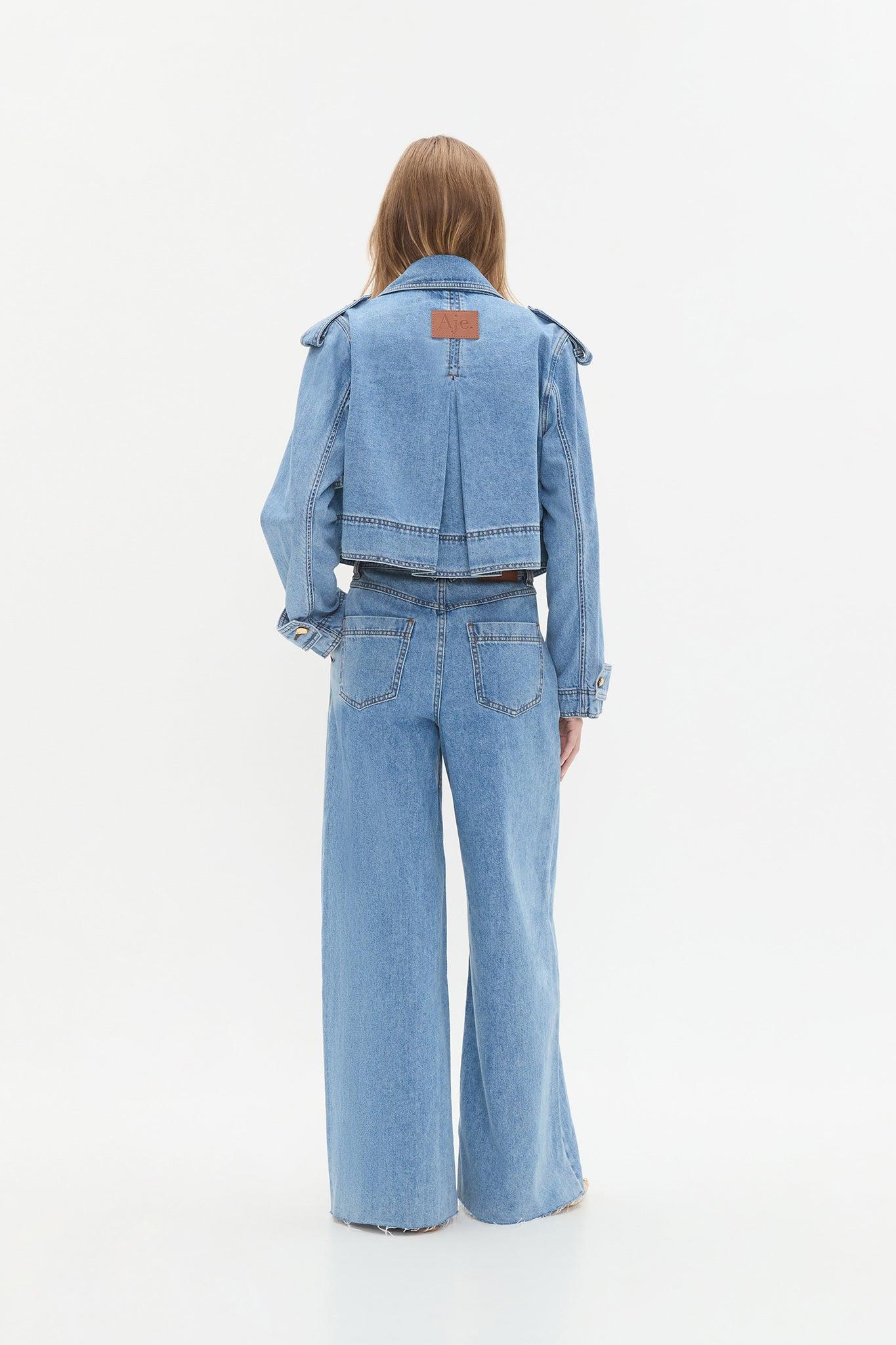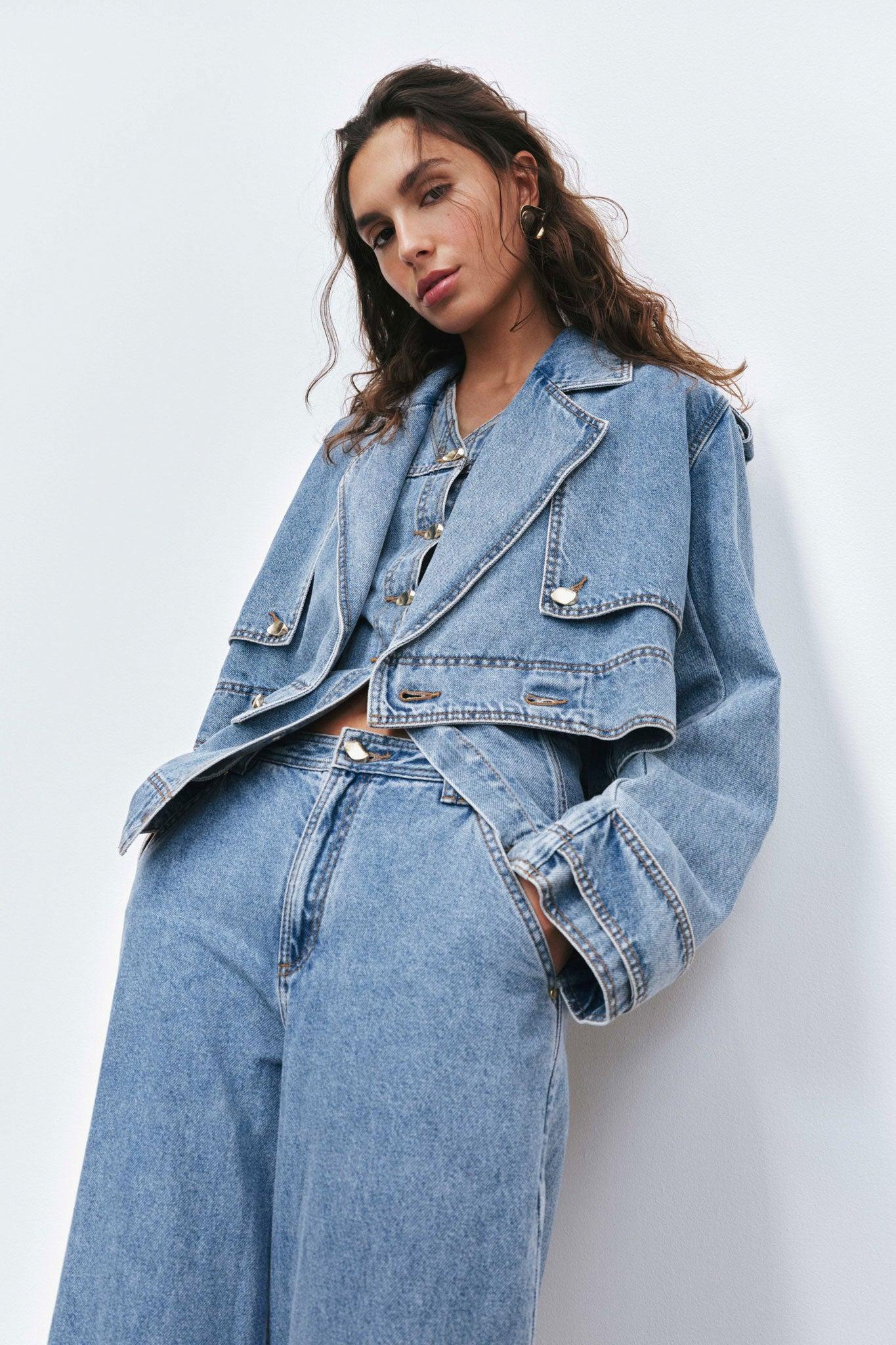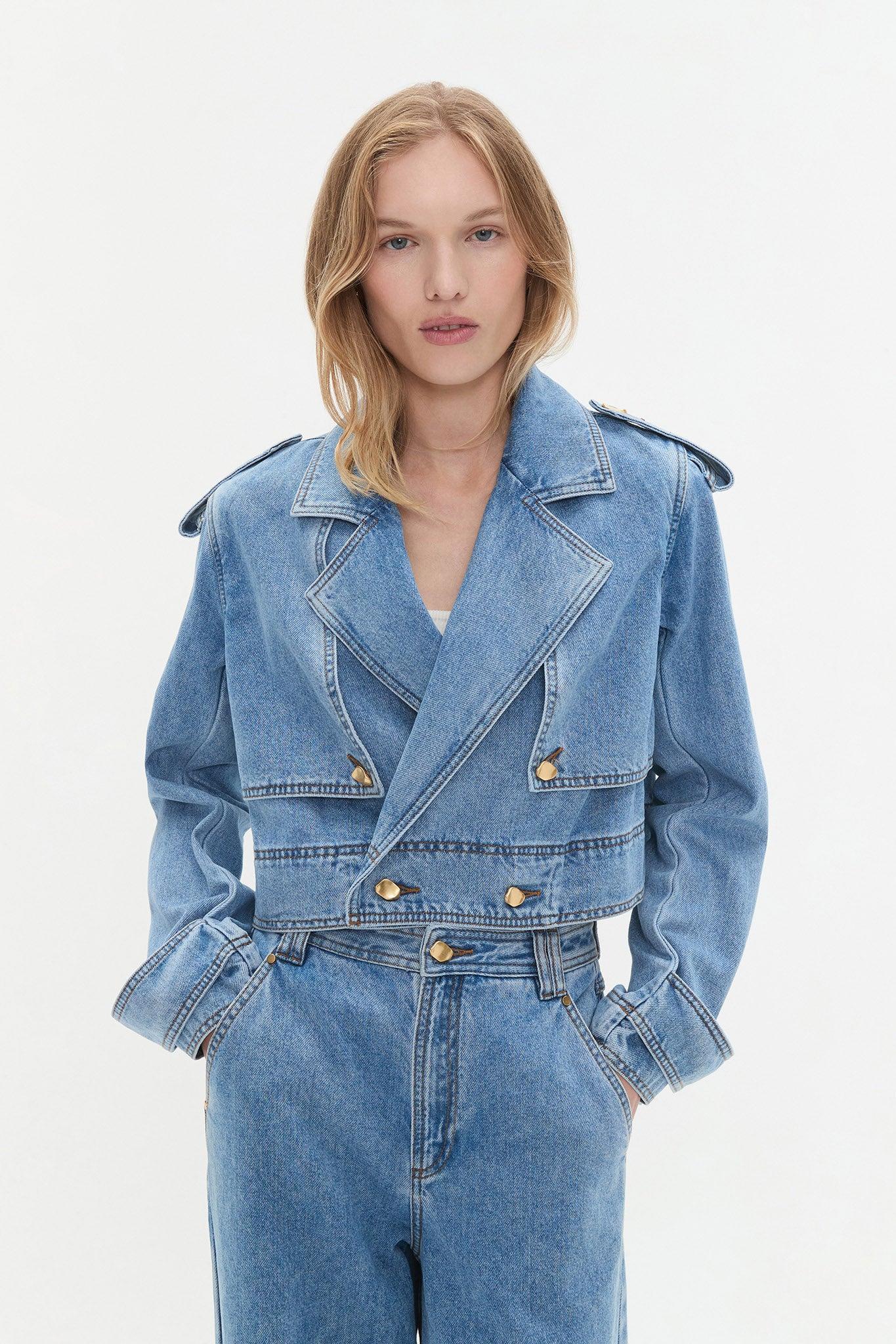 PRODUCT DETAILS As Seen On Montana Cox at the Resort 26 Runway Show Cropped denim jacket Collar and lapel Front and back storm flaps Twin needle stitching Front...