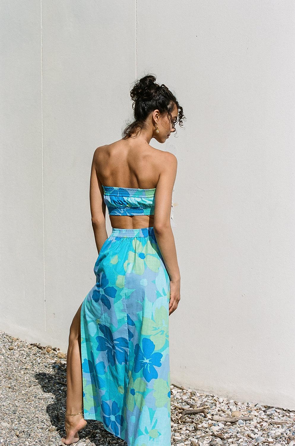 Stand out at your next event in the Holland Midi Dress, made from a high quality natural cotton fabric with our exclusive bold river floral print. It is a strapless style featuring wide shirred trim panels at neckline and waist, cutouts at waist, flowy ankle grazing hem and split at side. Dress it up with the Strappy Jayda Heels! Designed exclusively by Sabo.