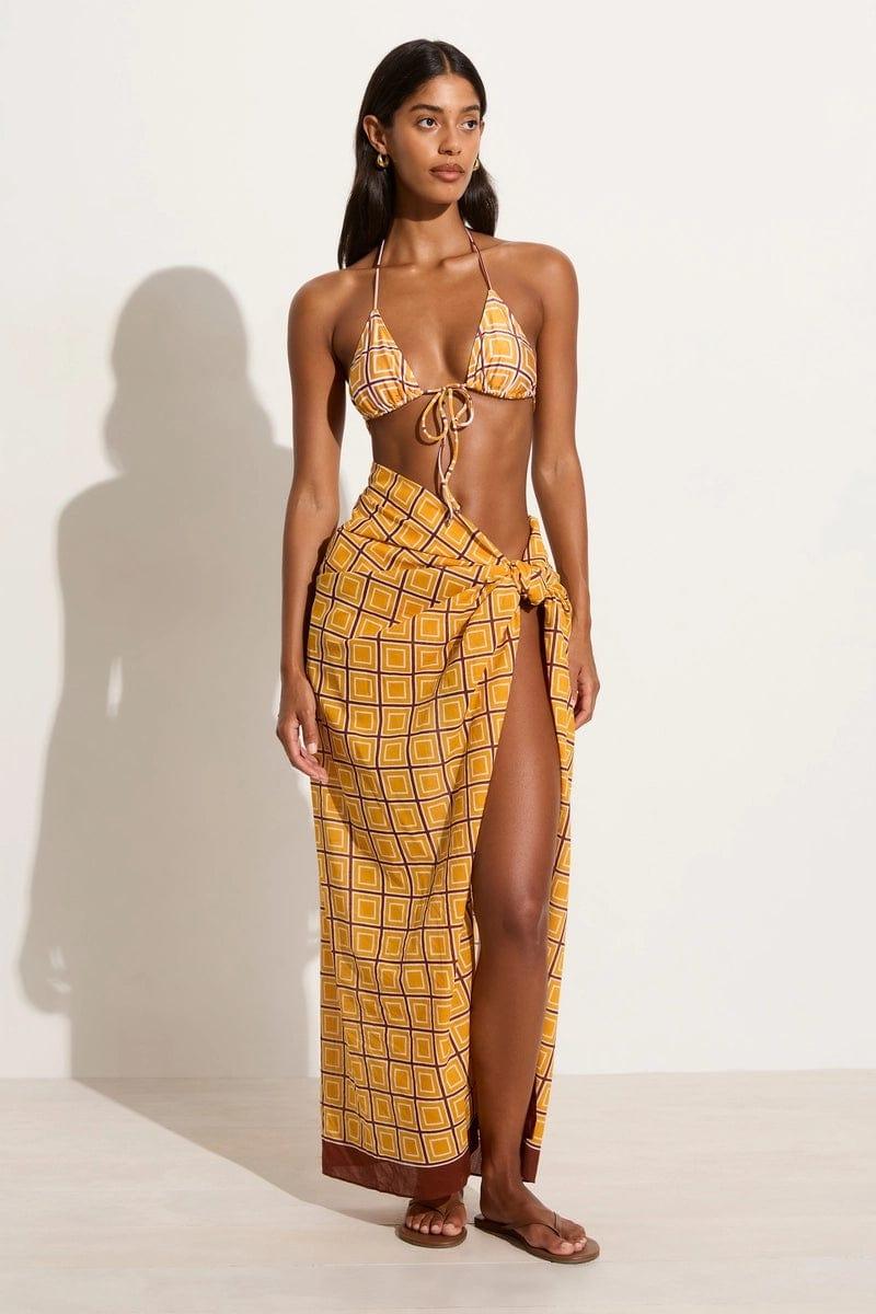 Designed for the sun seeker, the Hollis Bikini Top offers a modern take on the classic triangle top. Cut from shiny nylon fabrication custom printed in our warm geo La Costa Print, the Hollis features adjustable straps designed to be tied at the front and gold tone hardware accents. Pair it back with the matching Nomi Bikini Bottoms for a retro poolside ensemble.