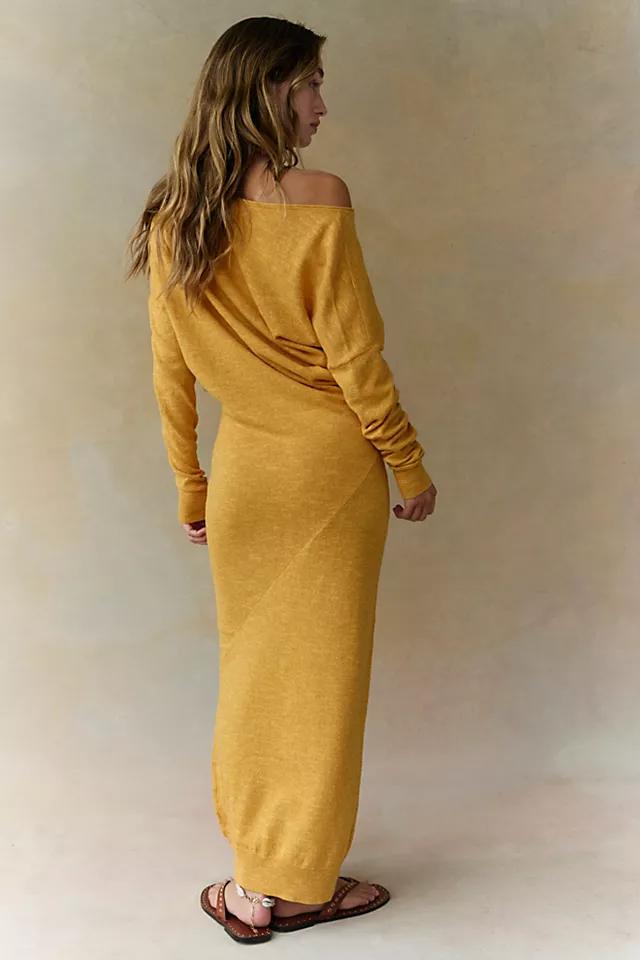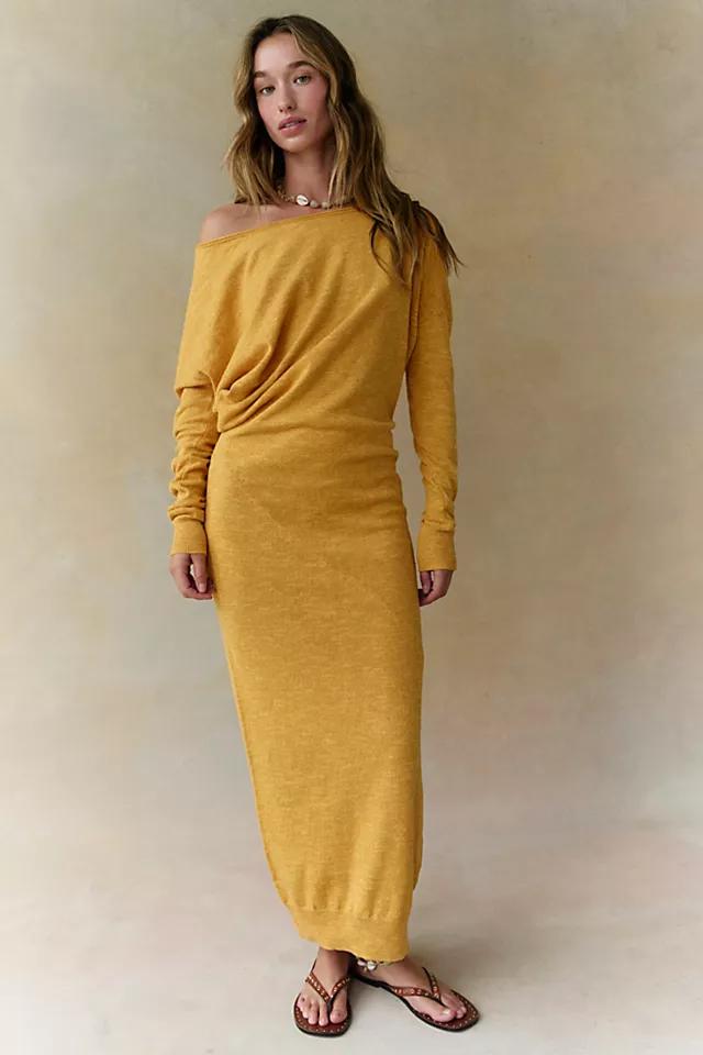 So flattering with a laidback feel, this cozy midi dress from free-est is featured in a cotton-linen knit with a slouchy, off-the-shoulder bodice, fitted bodycon skirt and long dolman sleeves.