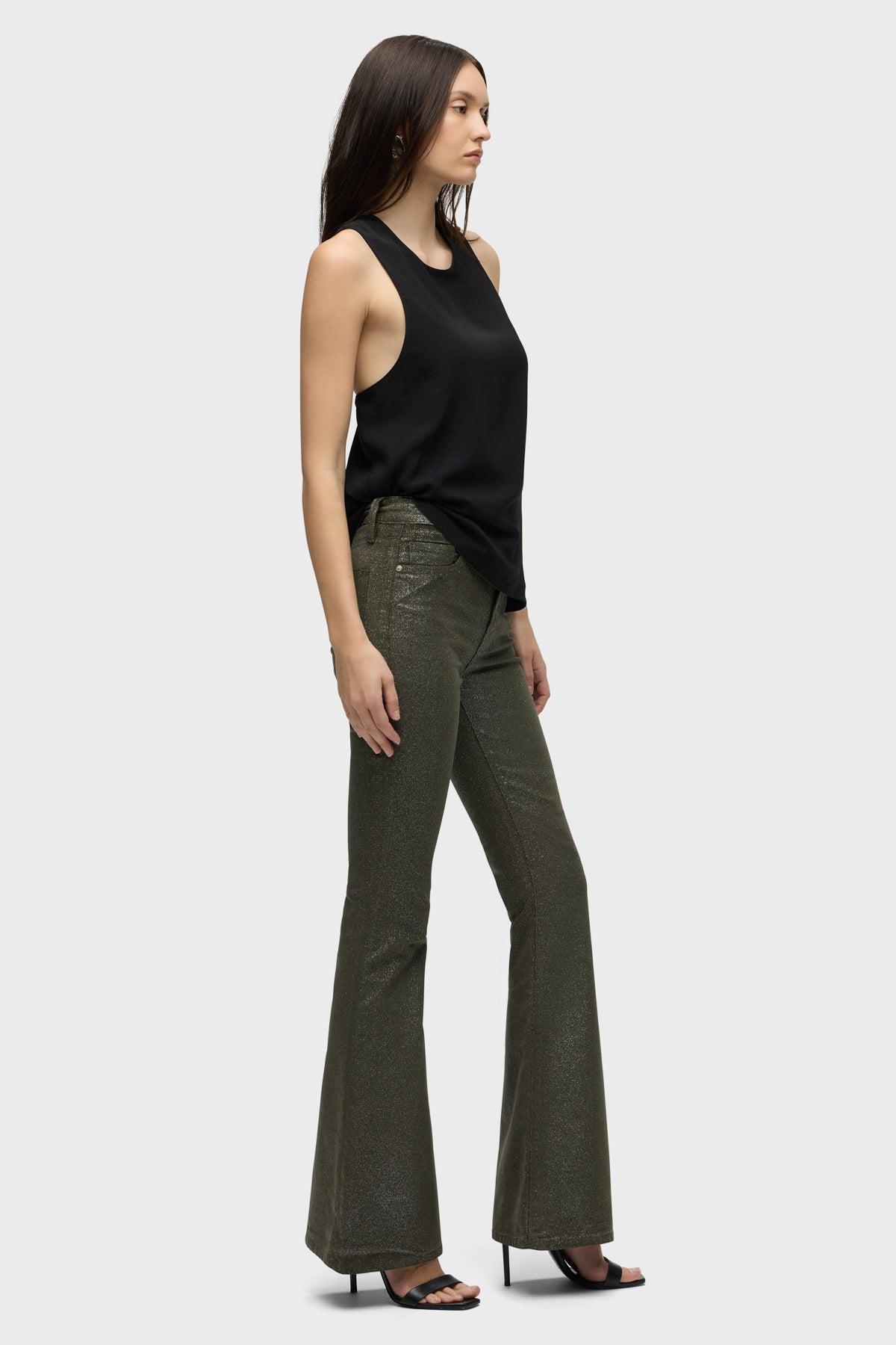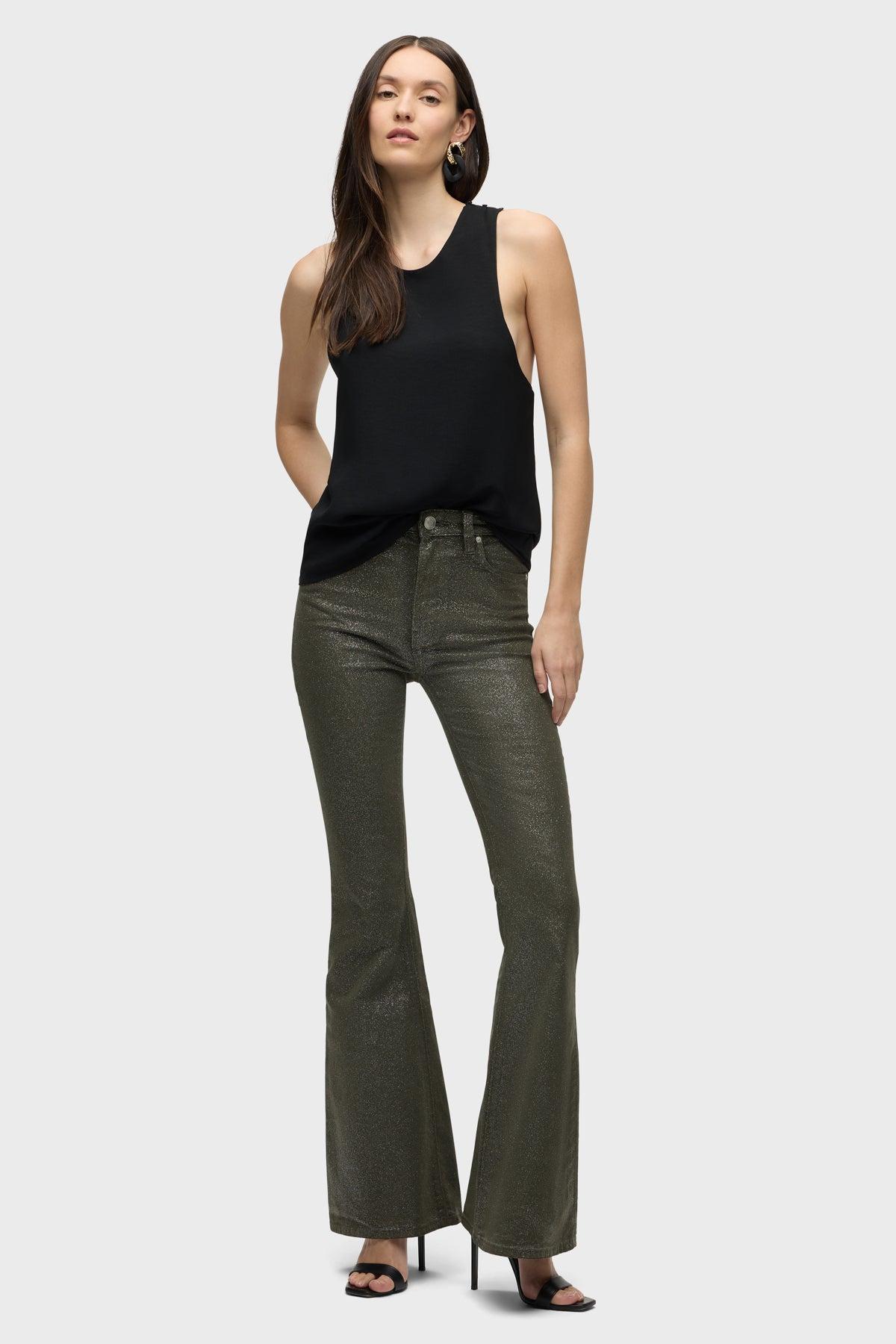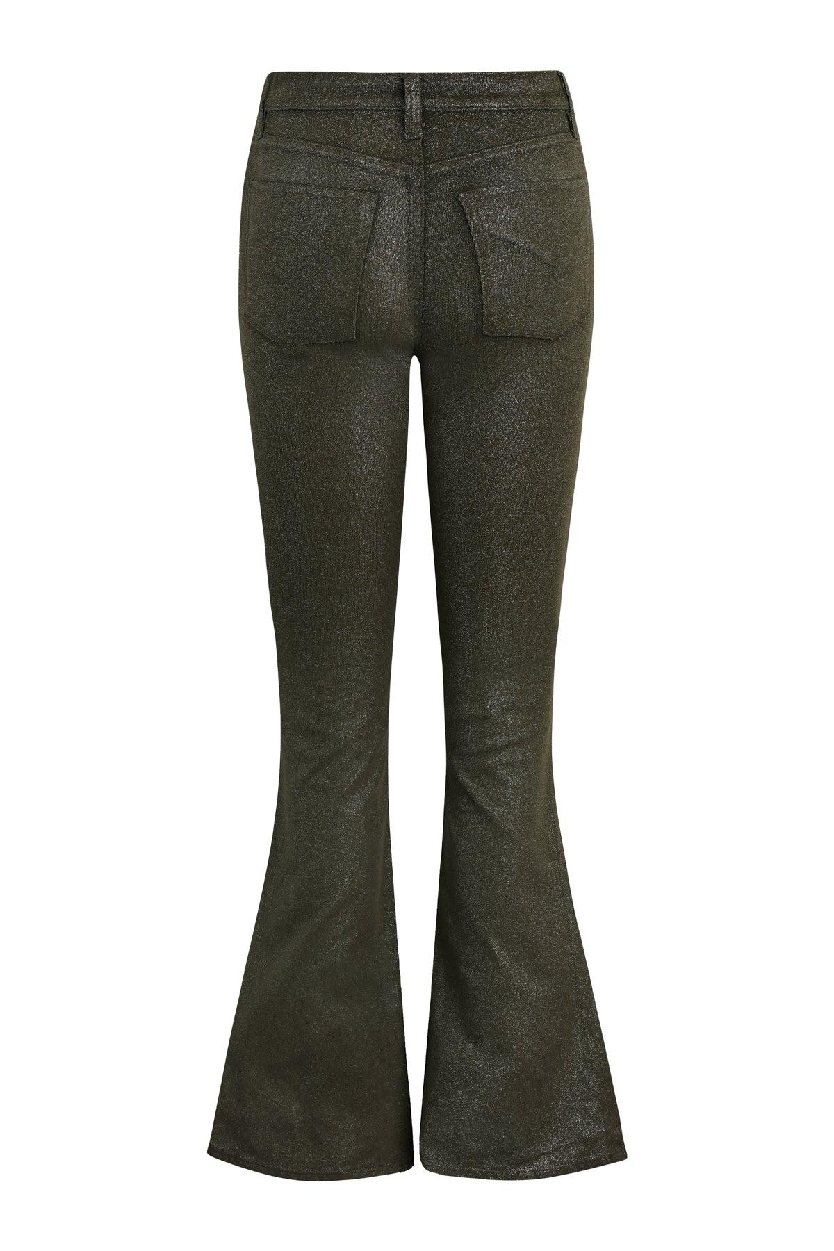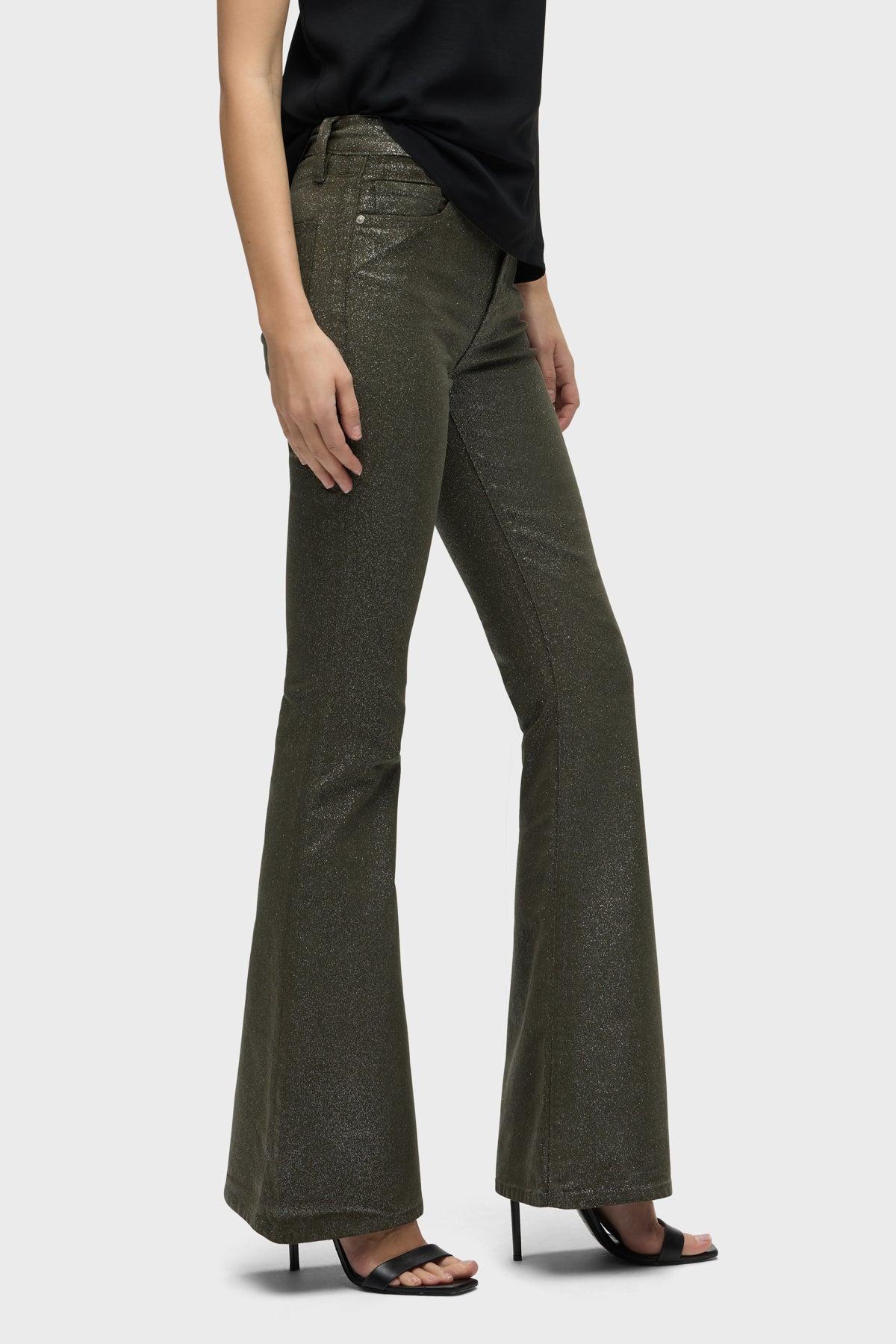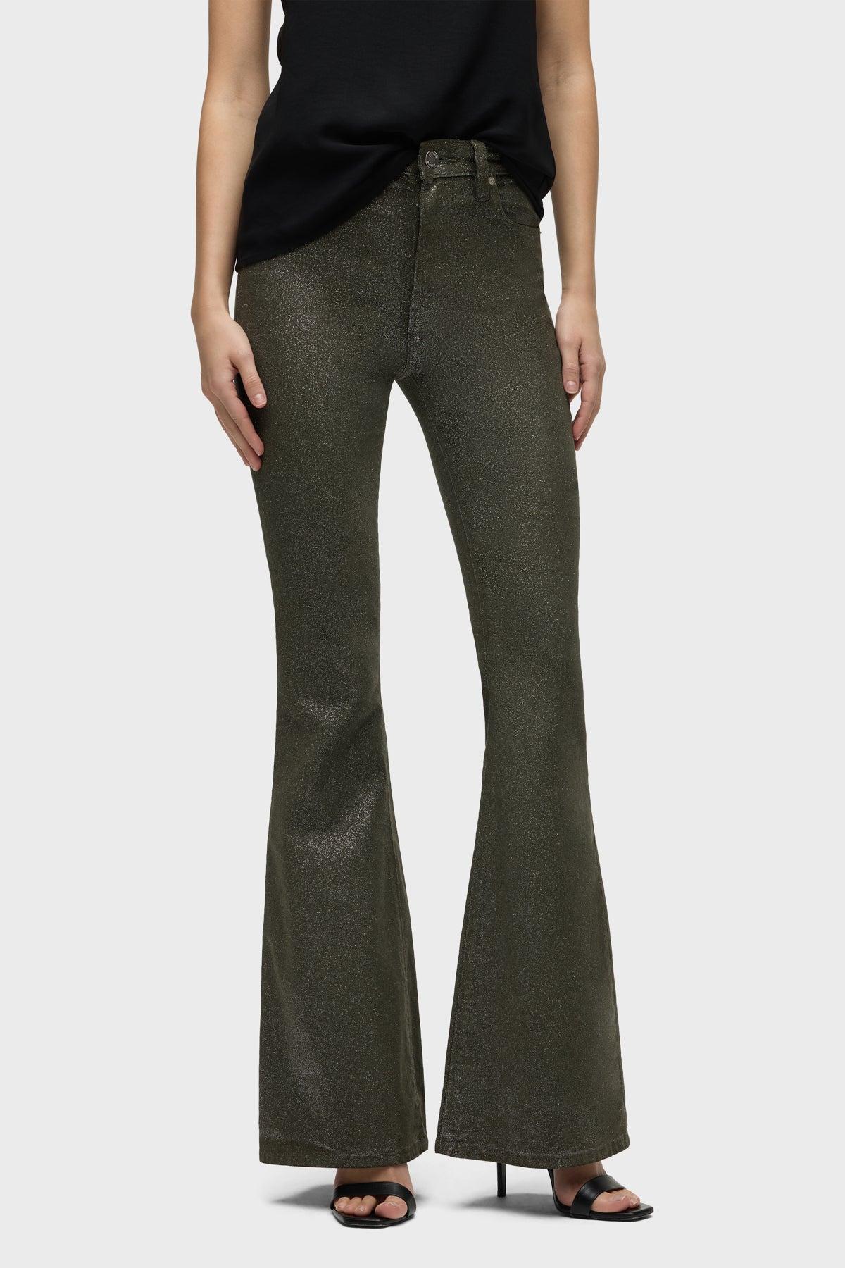 Description Our Holly High-Rise Flare Jean in over-dyed Cypress Glitter is cut from soft and buttery corduroy with premium comfort stretch. It features an elevated waistline, classic five-pocket details, a flared leg and soft clear coating with glitter. Product Details Front Rise: 11", Leg Opening: 23.5", Inseam: 34"Model Height 5'9"Model wearing size 25Measurements based on size 27 Fit & Care Content: 98% Cotton, 2% ElastaneMachine wash cold with like colorsDo not bleachTumble dry low or hang to dry