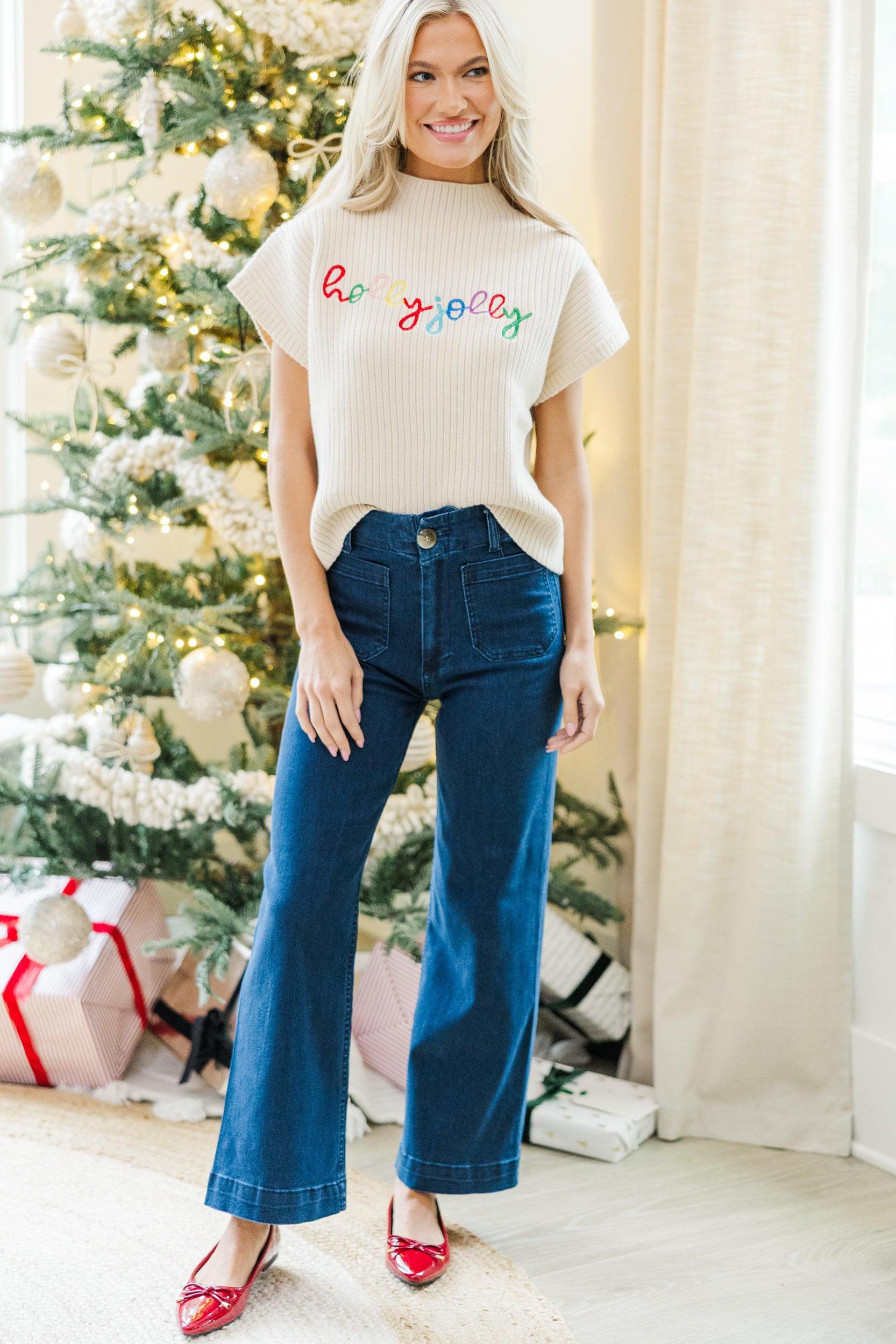 Your holidays are sure to be holly and jolly with this adorable sweater in your closet! That colorful script atop that soft, cream white background is perfection! Plus, we love a short sleeve sweater!! Short mock neckline Short cap sleeves Colorful script font Generous stretch Baileigh is wearing the small.