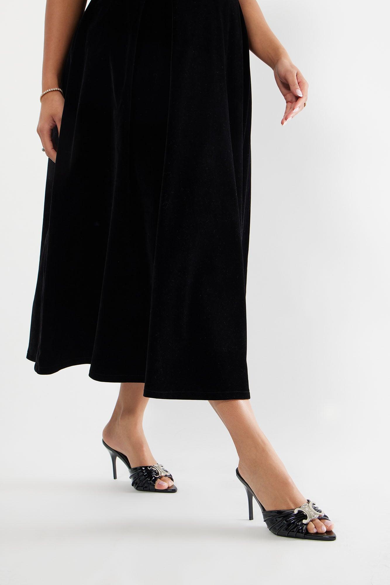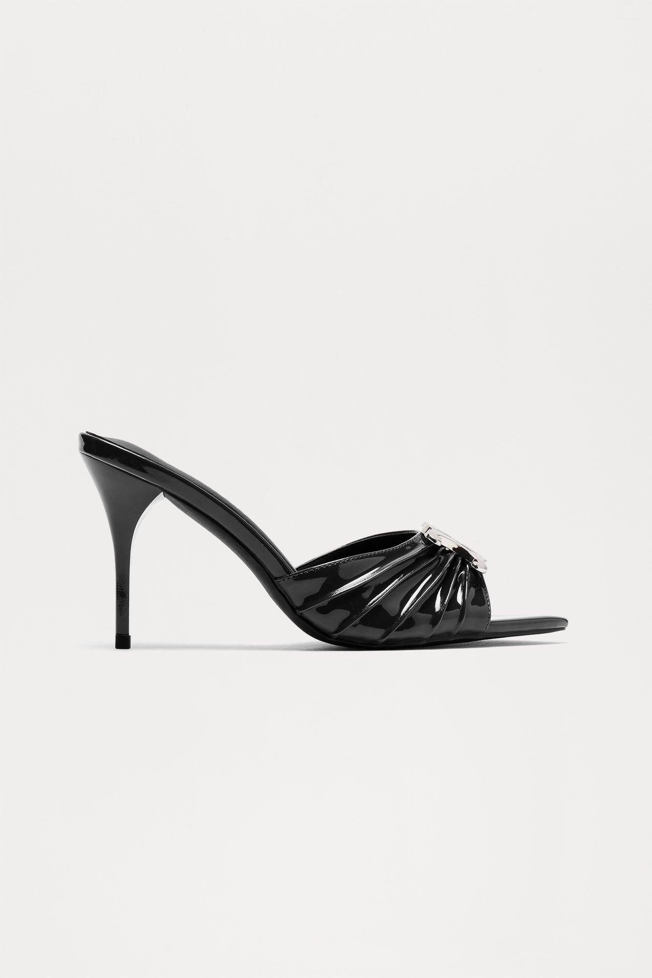 Available In Black. Heeled Sandals Hardware Detail Peep Toe 3.5" High Heel Imported California Proposition 65WARNING: Cancer and Reproductive Harm - www.P65Warnings.ca.gov.