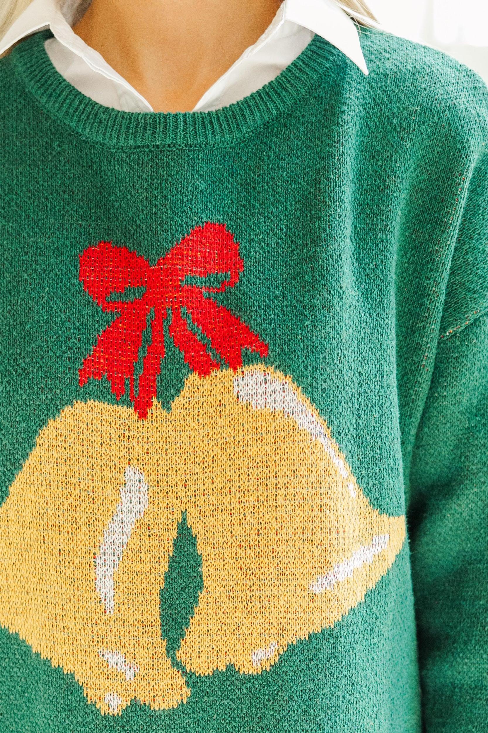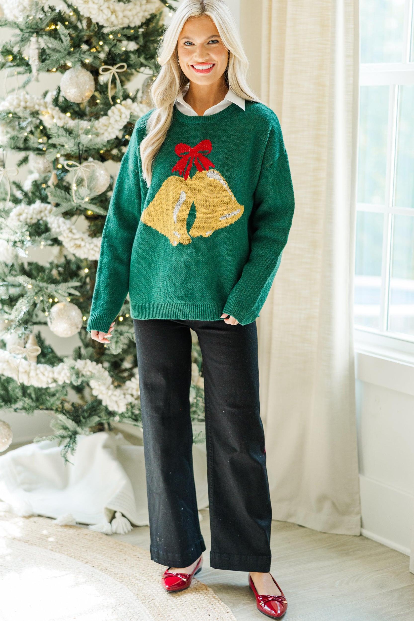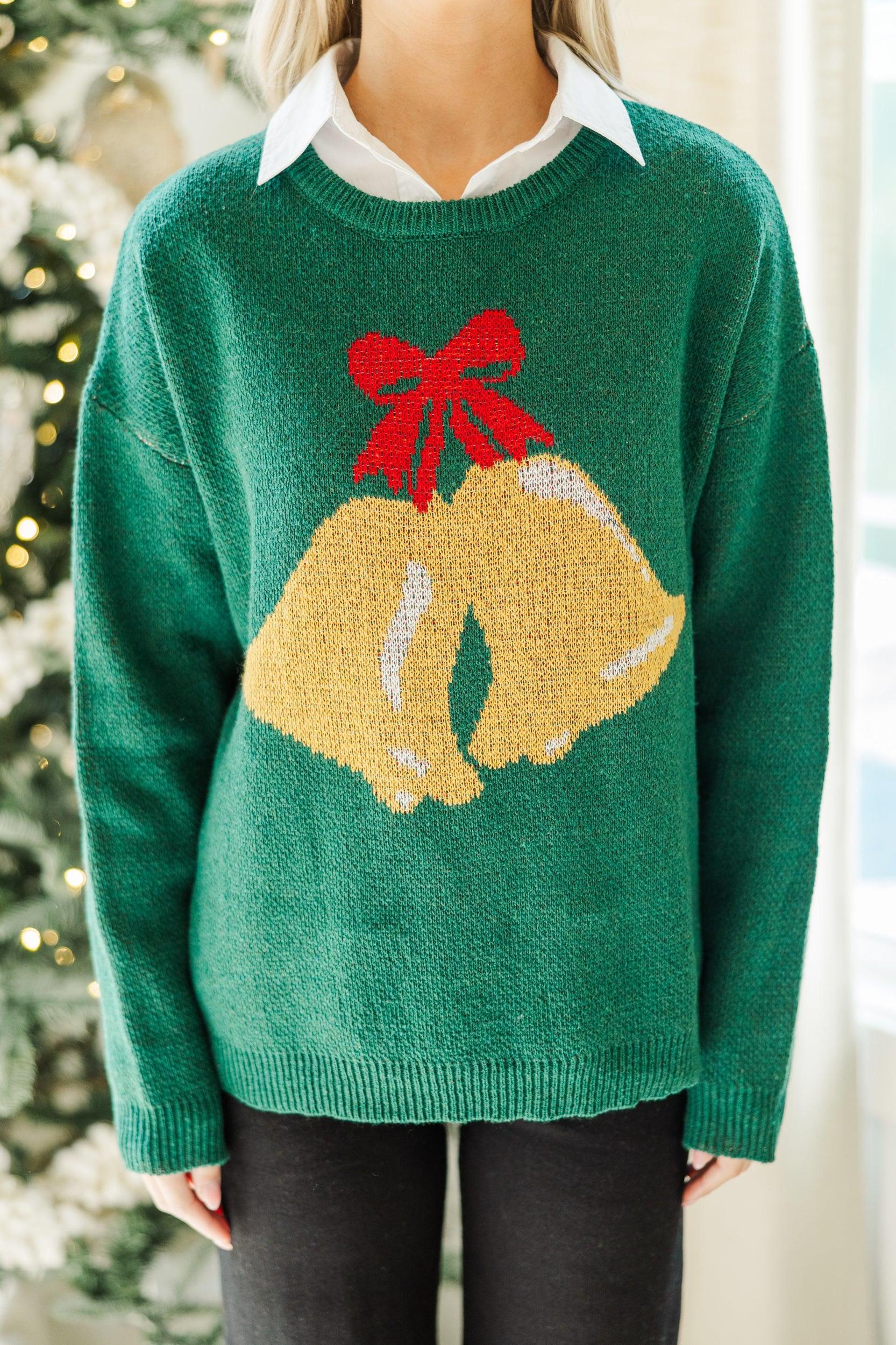 How cute is this sweater?! We are loving that festive bell print! This sweater is going to look great with jeans or dress pants and layering it over a button down blouse is always a chic, preppy option! Round neckline Long sleeves Festive bell print Generous stretch *Button down sold separately Baileigh is wearing the small.