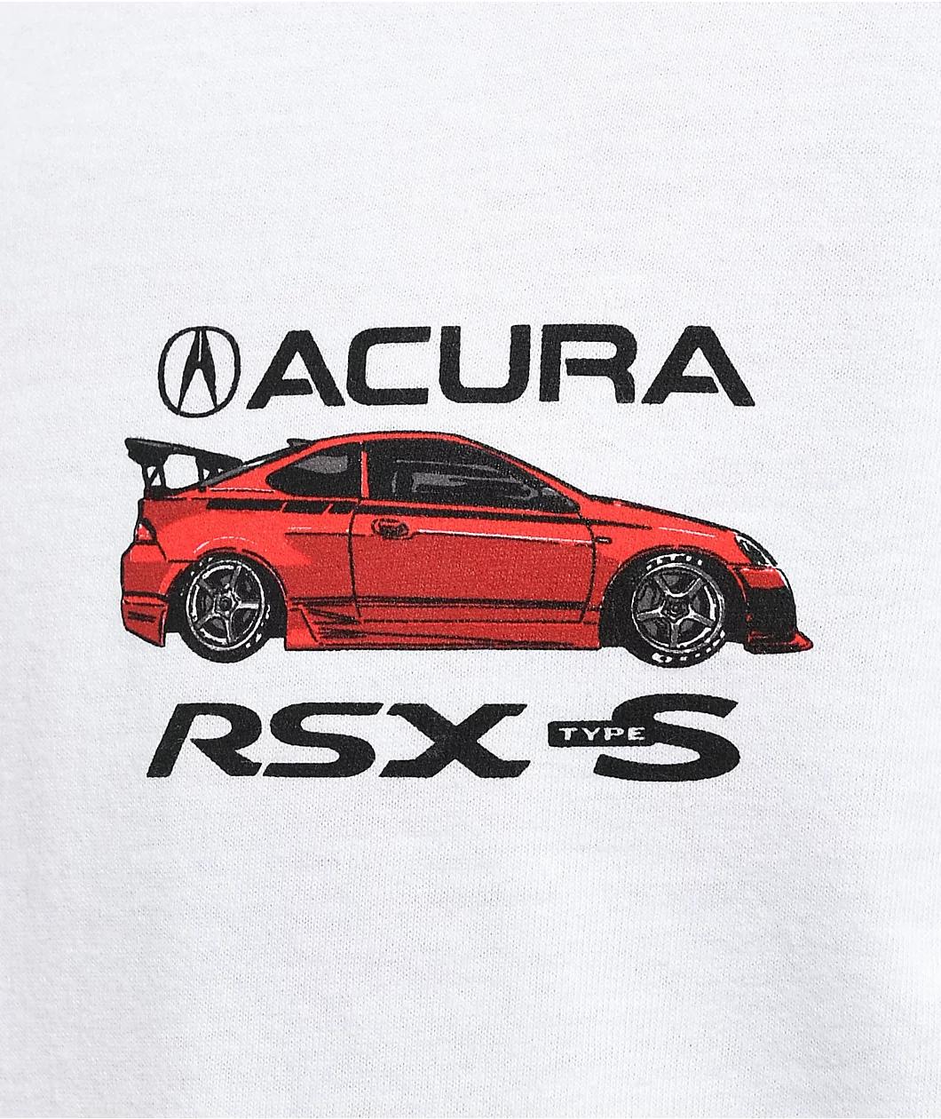 Showcase your love for Honda's Acura RXS in this 100% cotton t-shirt. The white tee showcases artwork of the sporty car on the back and left chest in red for a bold pop of color. Black branding in English and Japanese gives the top a bold streetwear