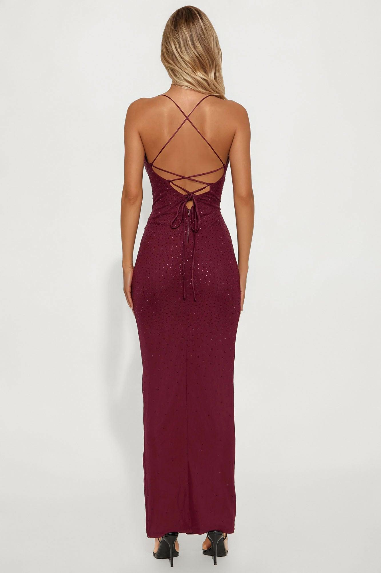 Available In Royal And Wine. Rhinestone Mesh Maxi Dress Spaghetti Strap V- Neckline Ombre Embellishing Ruched Back String Tie Side Slit Back Zipper Lined Stretch Disclaimer: Rhinestone Placement Will Vary Self: 90% Nylon 10% Spandex Lining: 100% Polyester