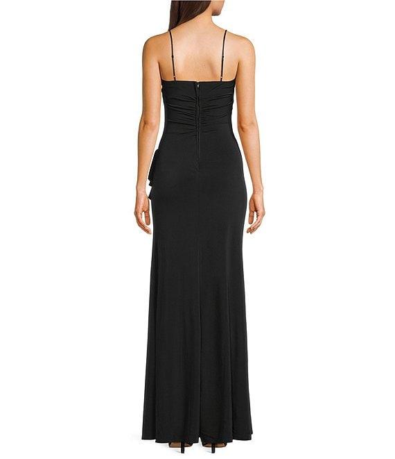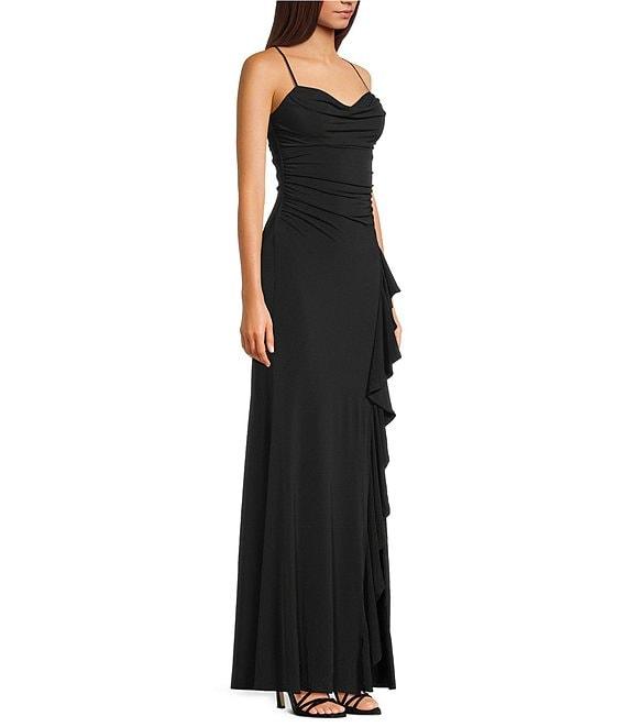 From Honey and Rosie, this dress features: Cowl neckline Adjustable spaghetti straps Shirred side seams at waist Cascading ruffle side slit Zip back closure Approx. 56.25" length Polyester/spandex; partially lined Machine wash/tumble dry Imported.