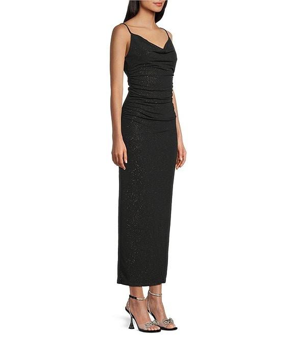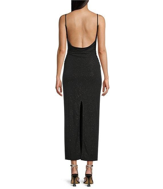 From Honey and Rosie, this dress features: Drape neckline Spaghetti straps Low open draped back Fitted silhouette 50" length Pullover styling Polyester/spandex Hand wash/lay flat to dry Imported.