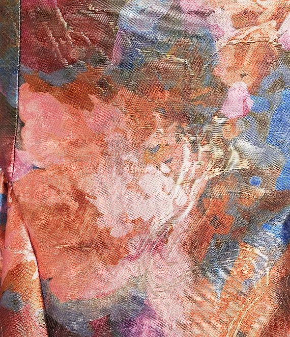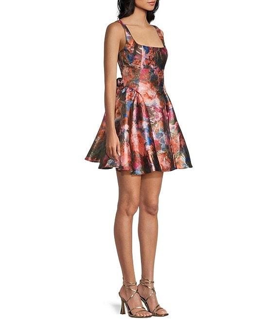 From Honey and Rosie, this dress features: Floral printed jacquard fabrication Square neckline Sleeveless Bra cups for added support Low back with tie detail Zippered back closure 33 7/8" length Polyester/metallic/nylon; fully lined Hand wash/lay flat to dry Imported.